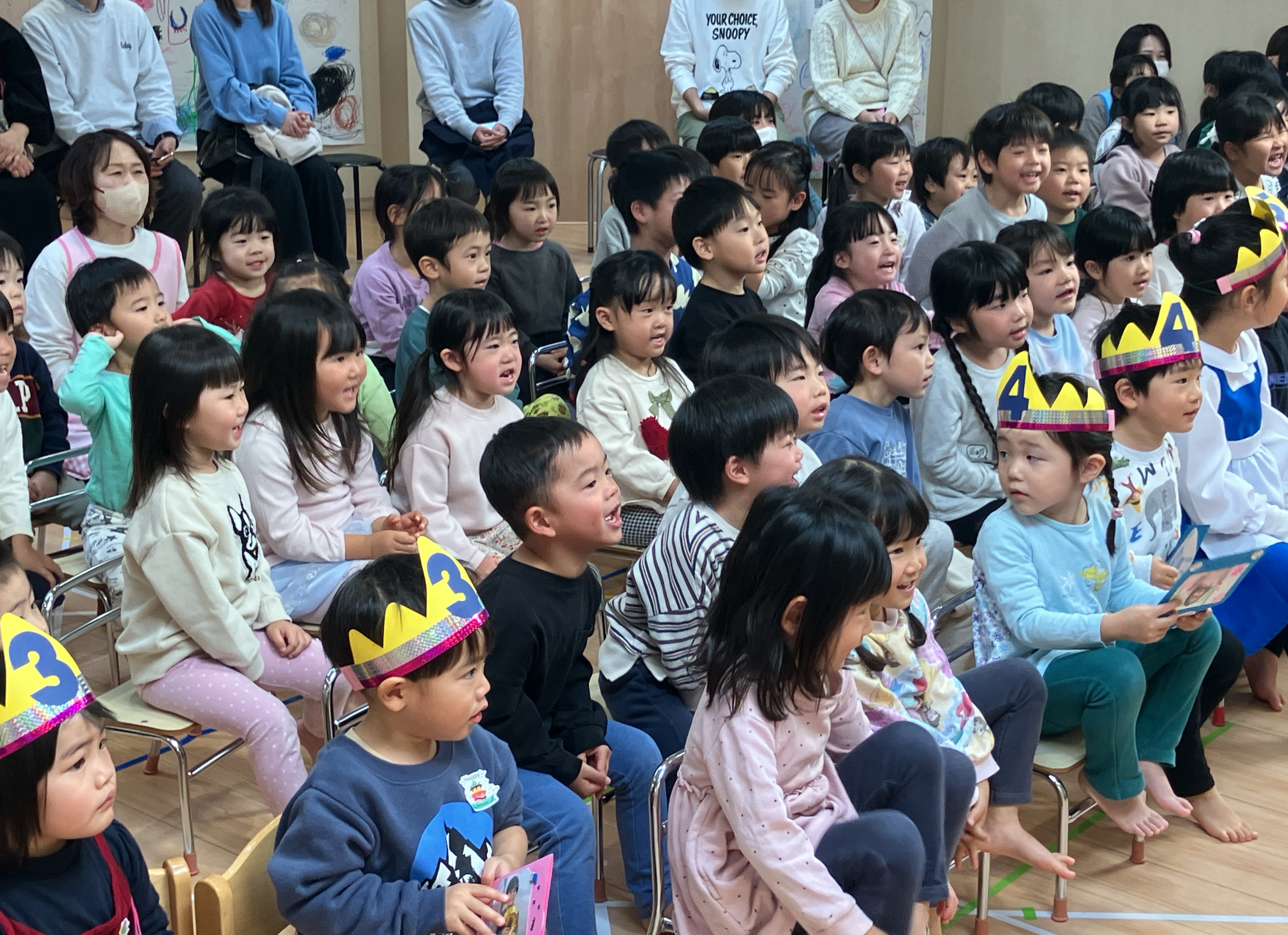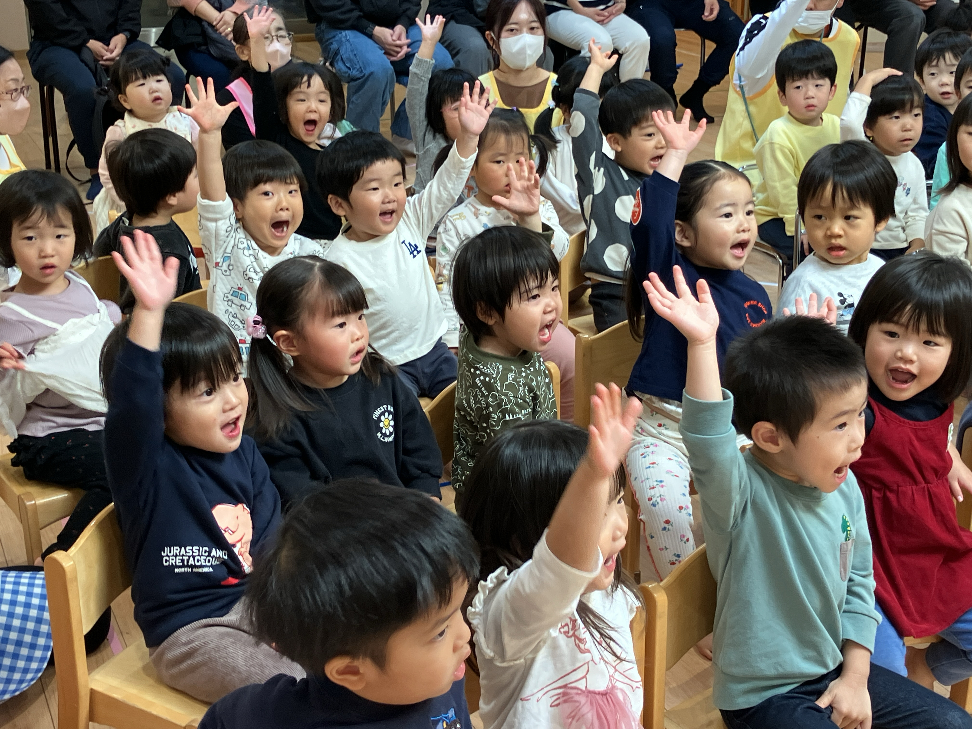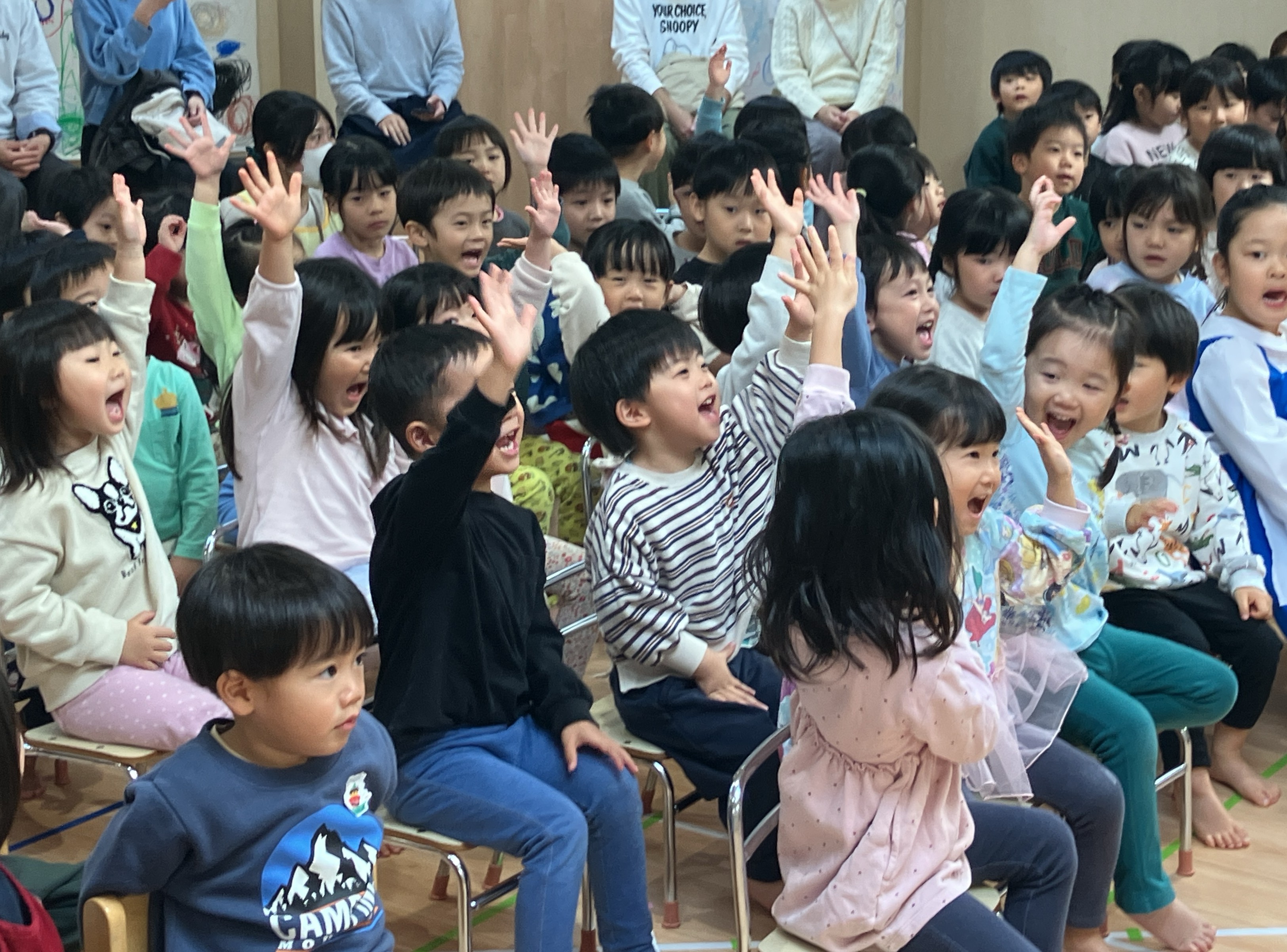 ホールに集まった2歳~5歳のお友だちと一緒に、今月も