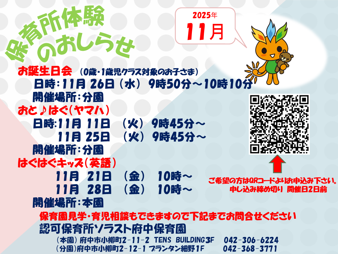ソラスト府中保育園、11月の保育所体験のお知らせです♪