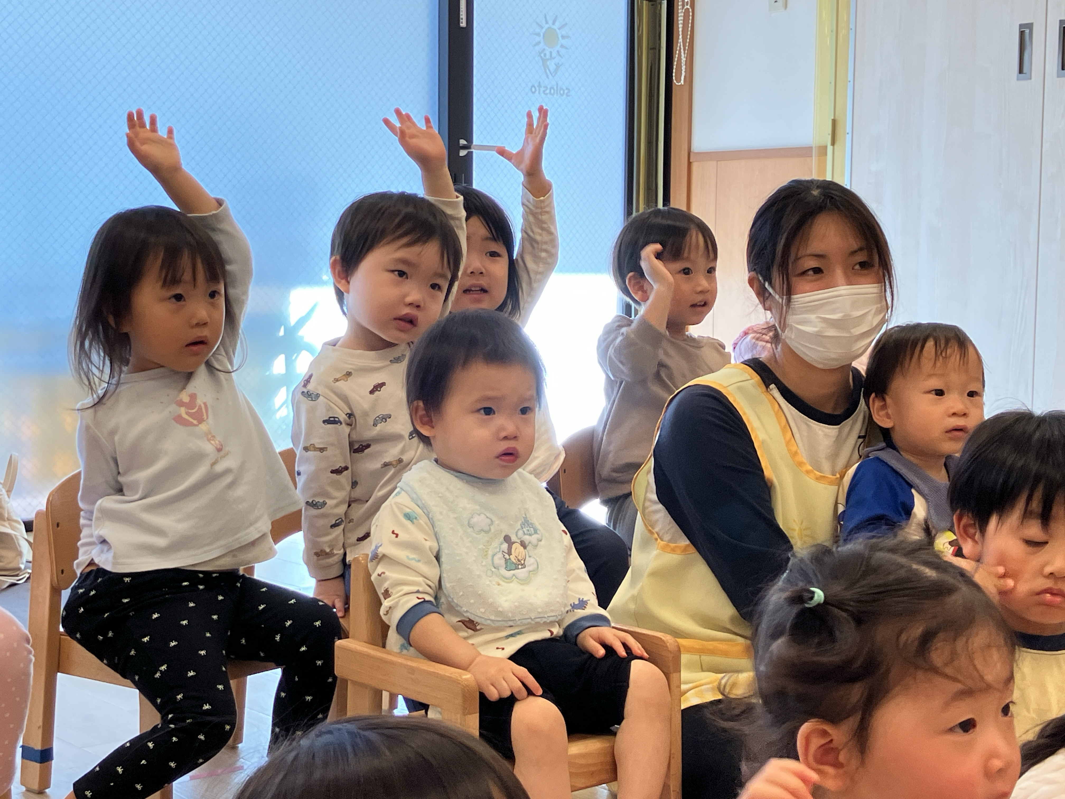 手を挙げているのは2歳児のこころ組のお友だちです。