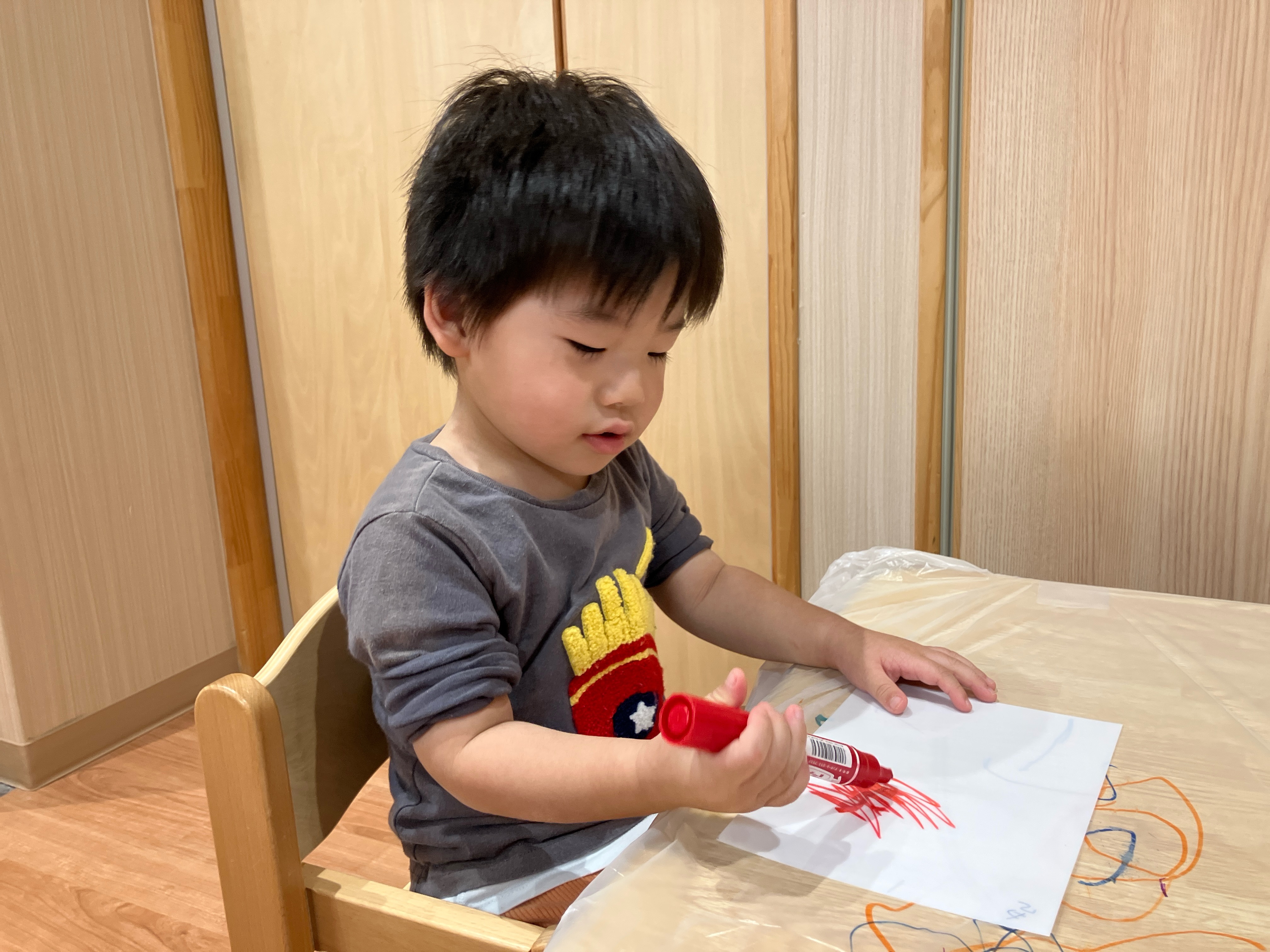 ぐる〜」「あかいい!」製作に夢中な子どもたちです。