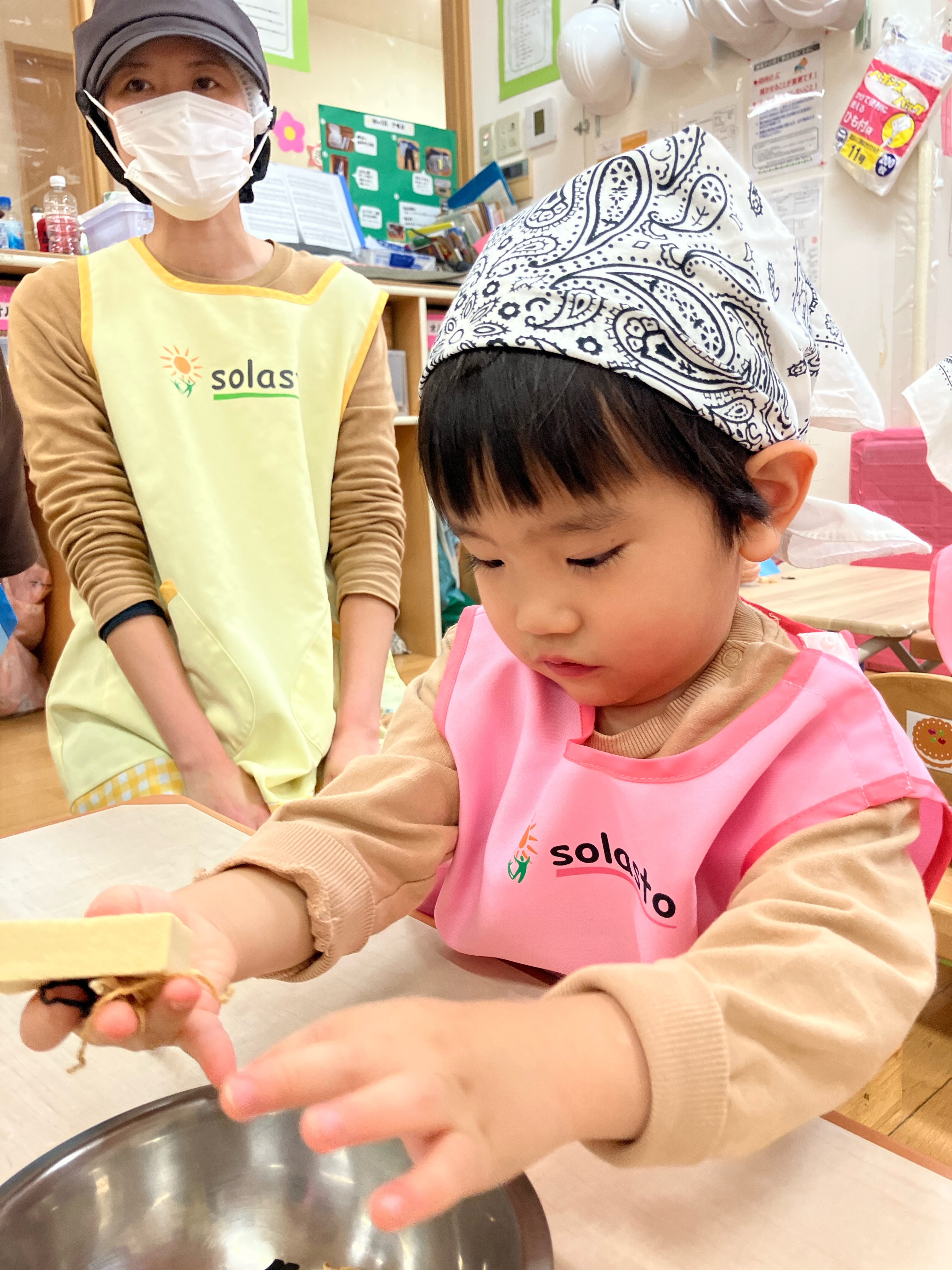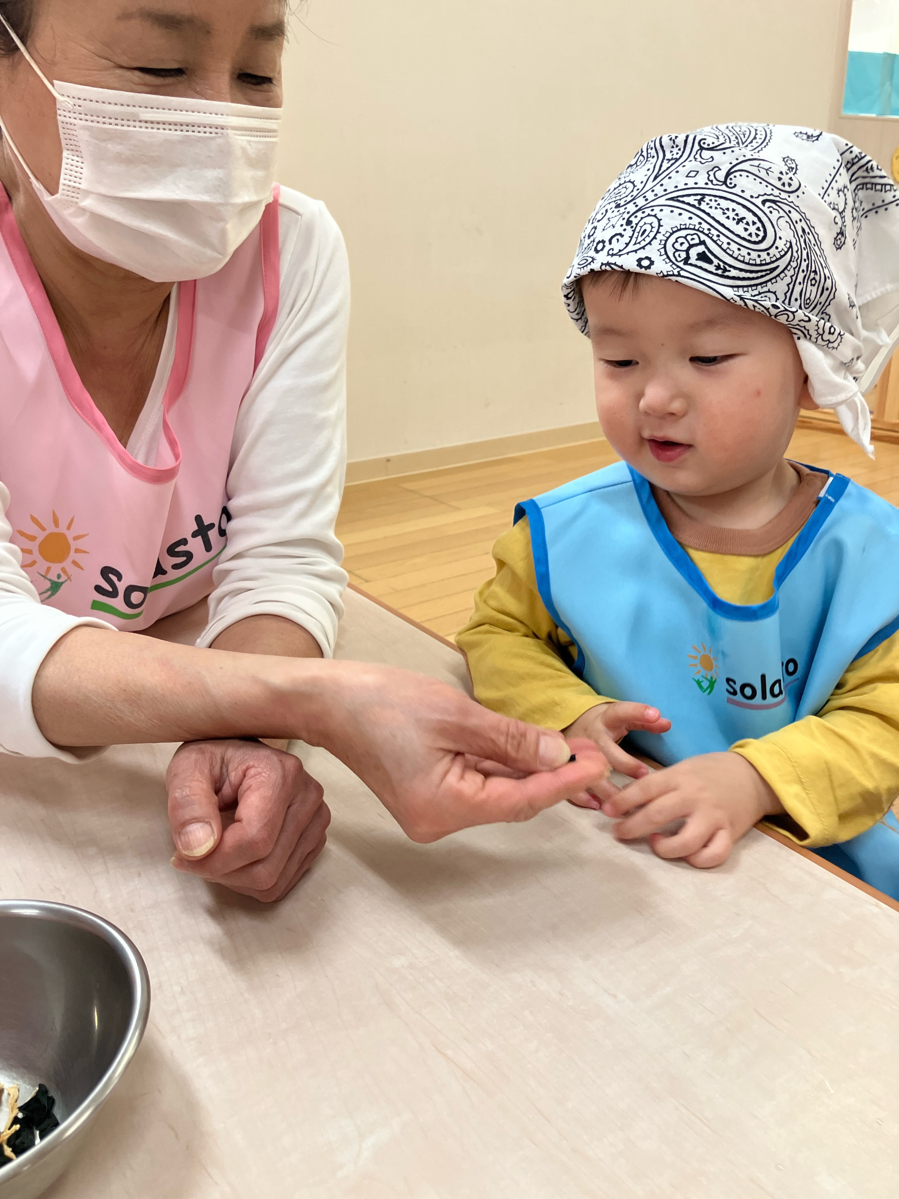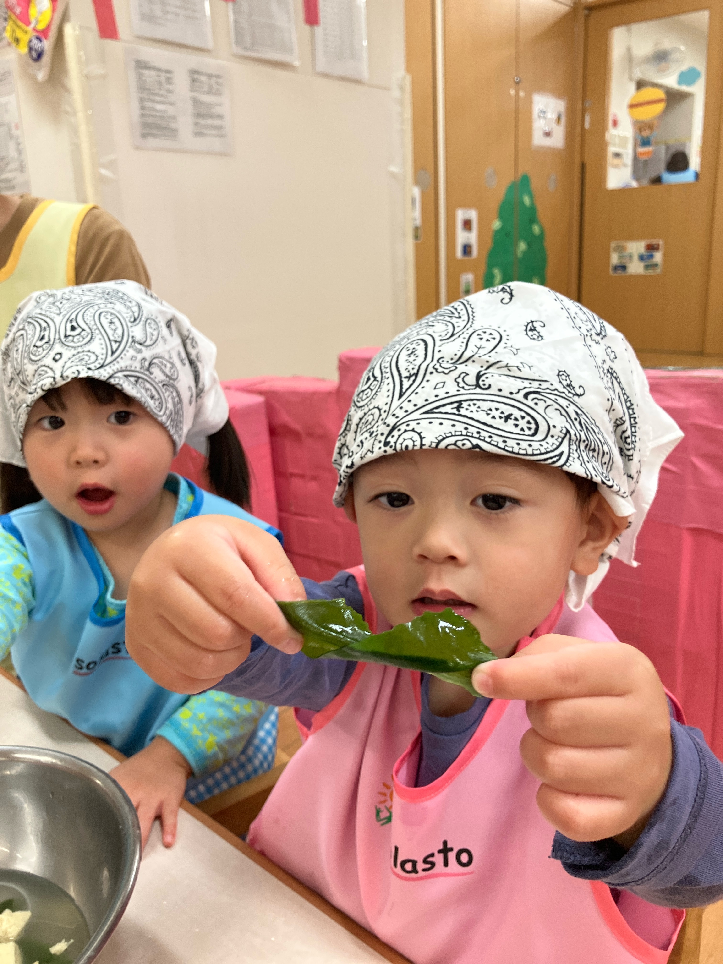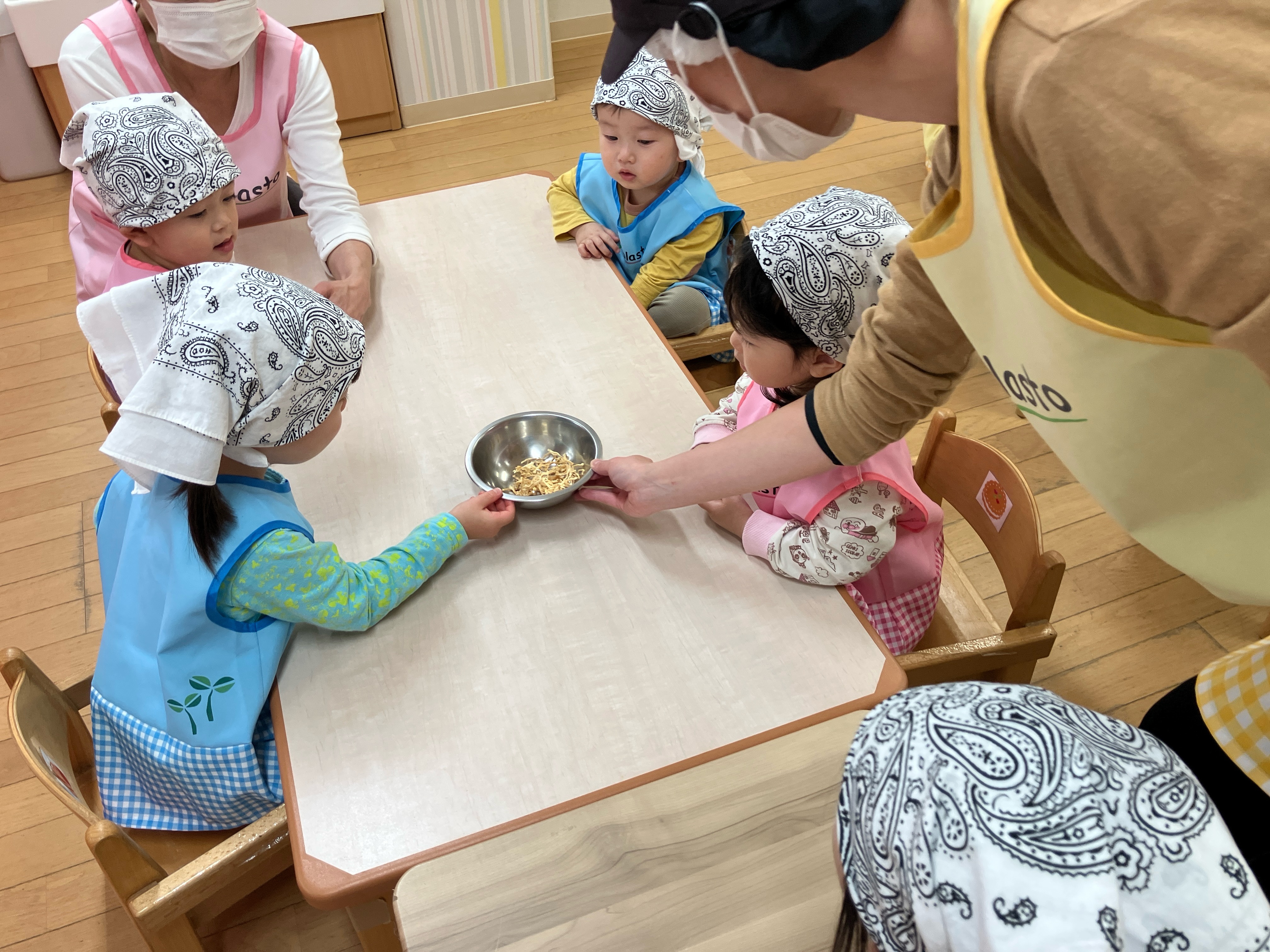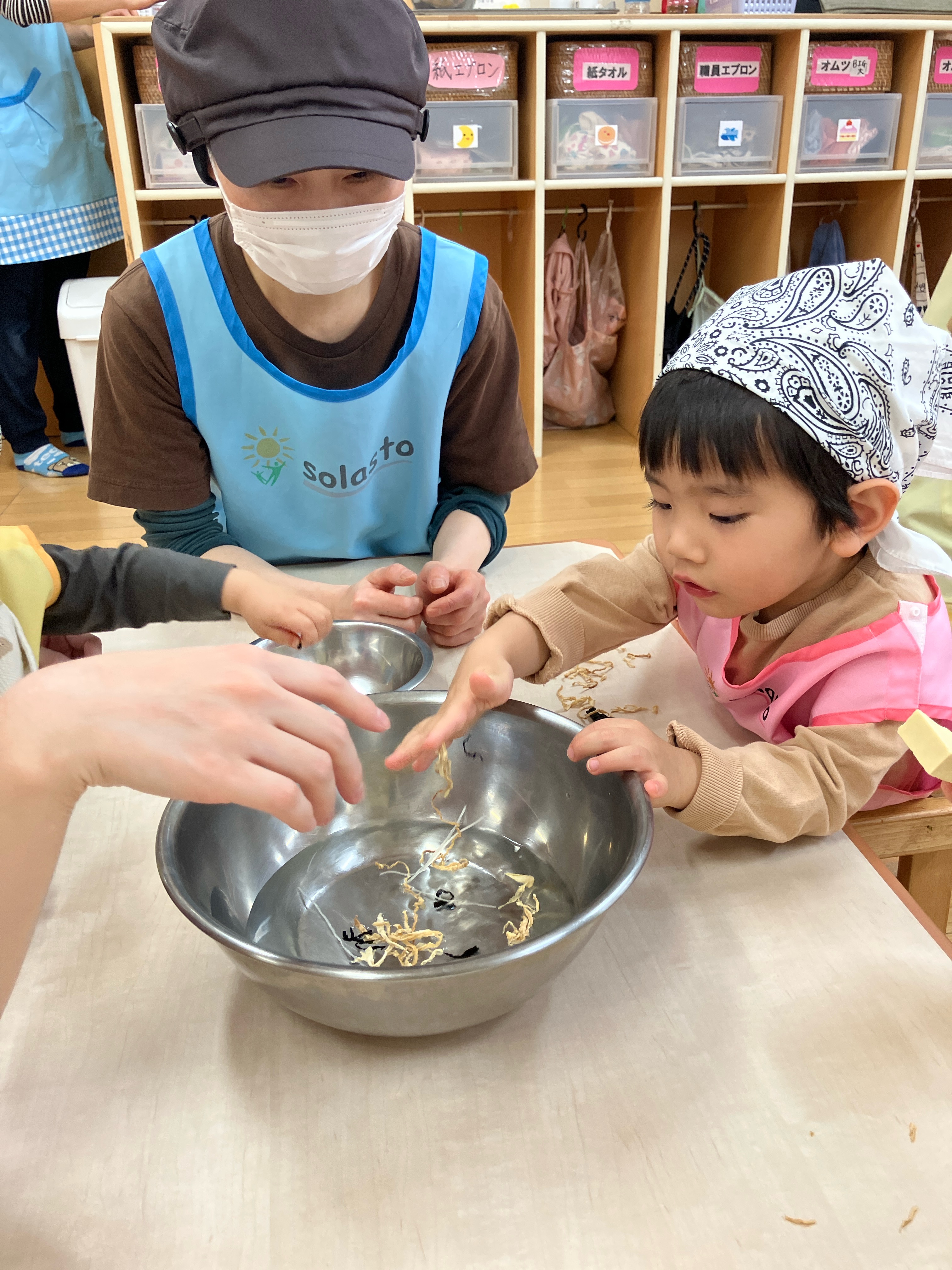 めばえ組(1歳児)食育の取り組みで「乾物戻し」をしました。用意した乾物は春雨、高野豆腐、わかめ、切り干し大根です。先生とお揃いのエプロンを身に着け、乾物に触れてみます。乾物戻しを通して食材の不思議や調理に興味を持てるように取り組みました。
