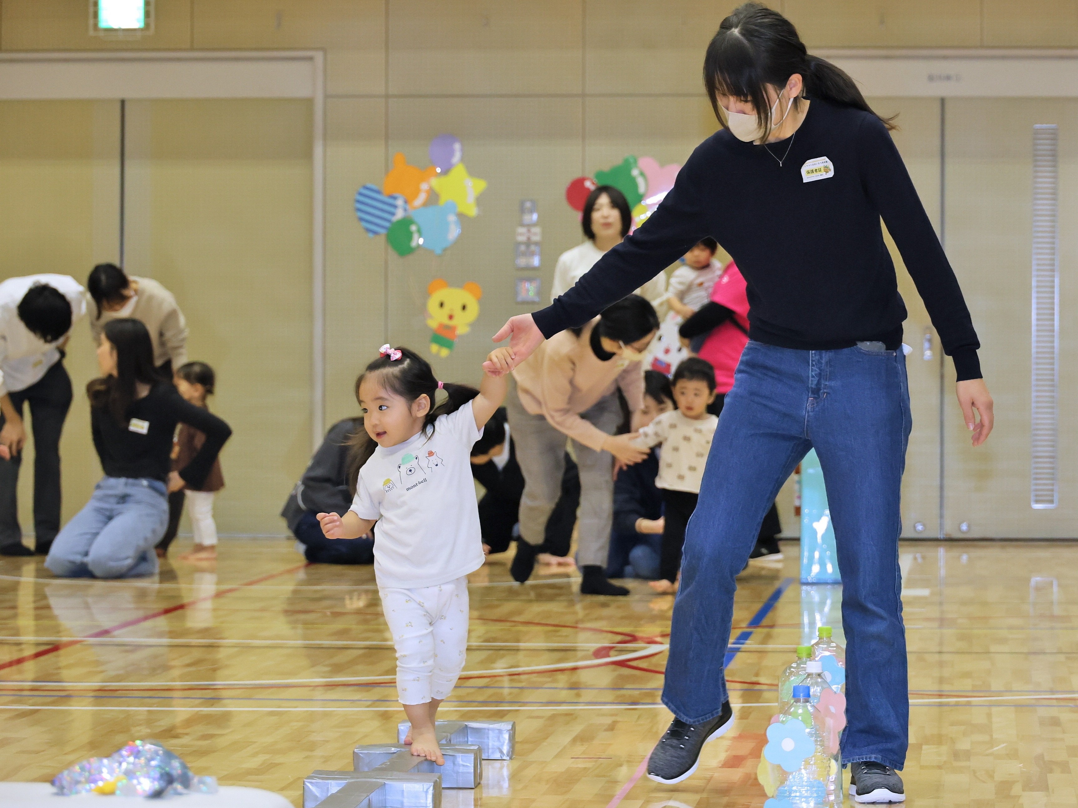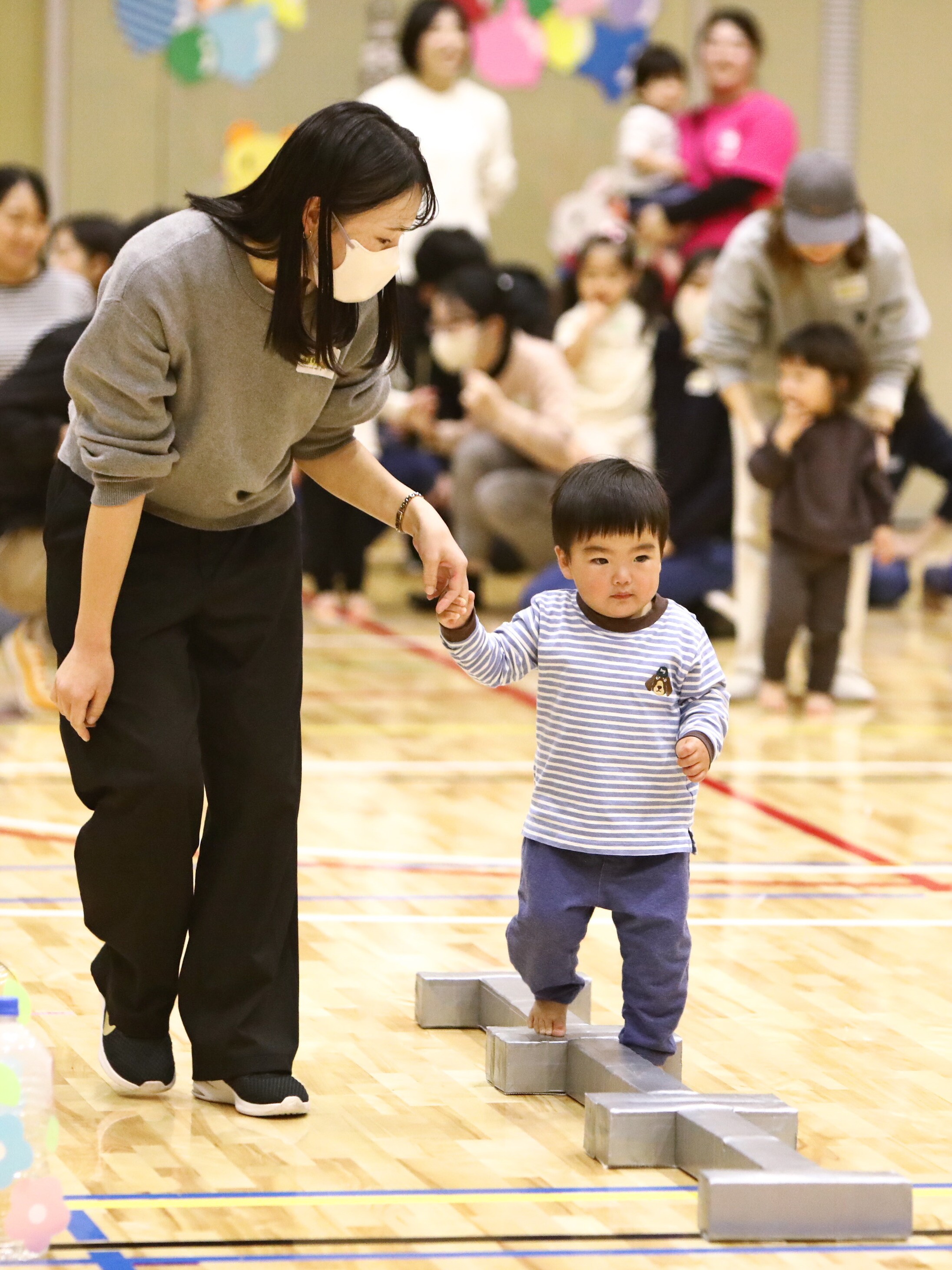 親子競技:お母さんと手を繋いで平均台を歩きます。