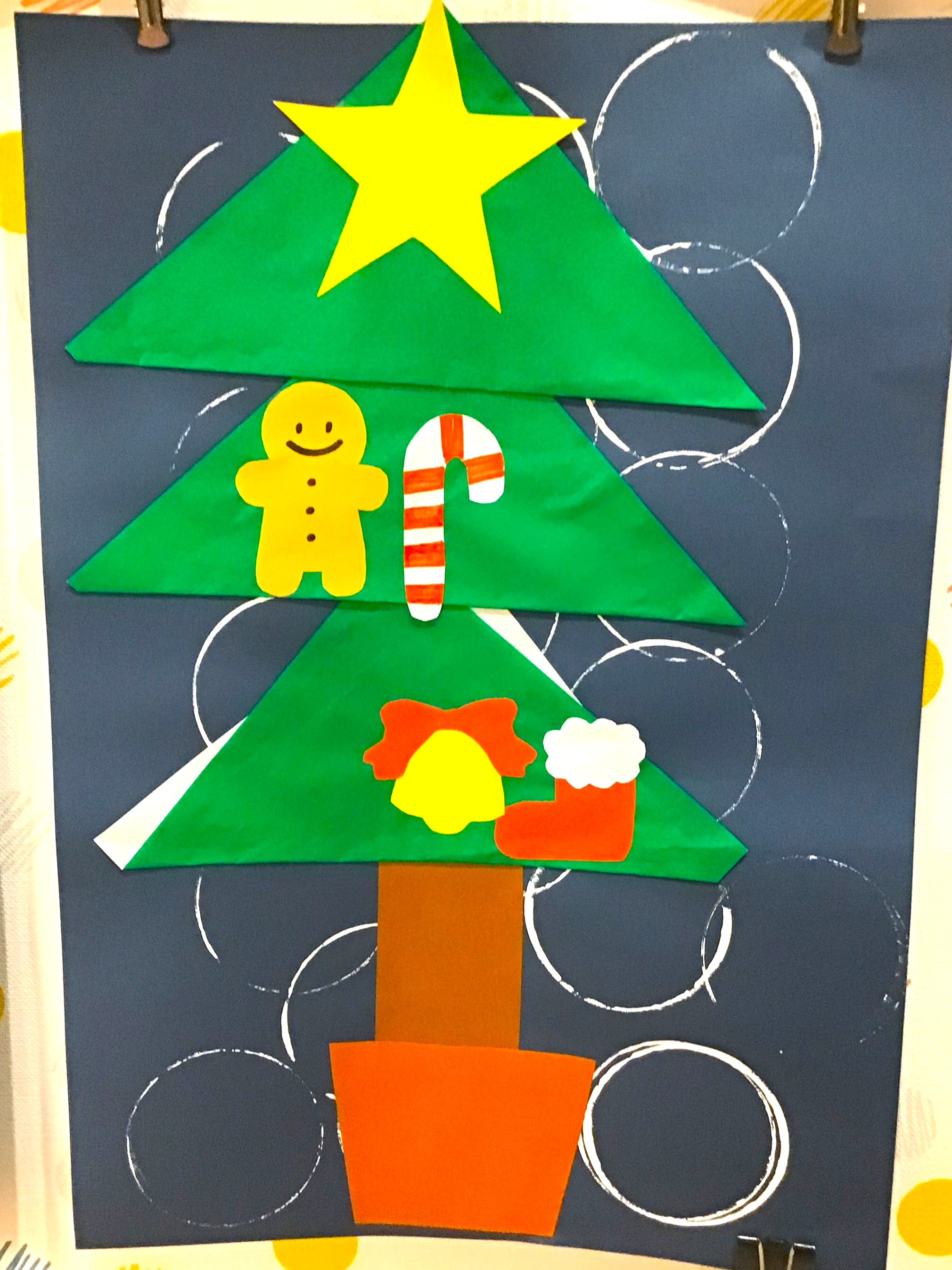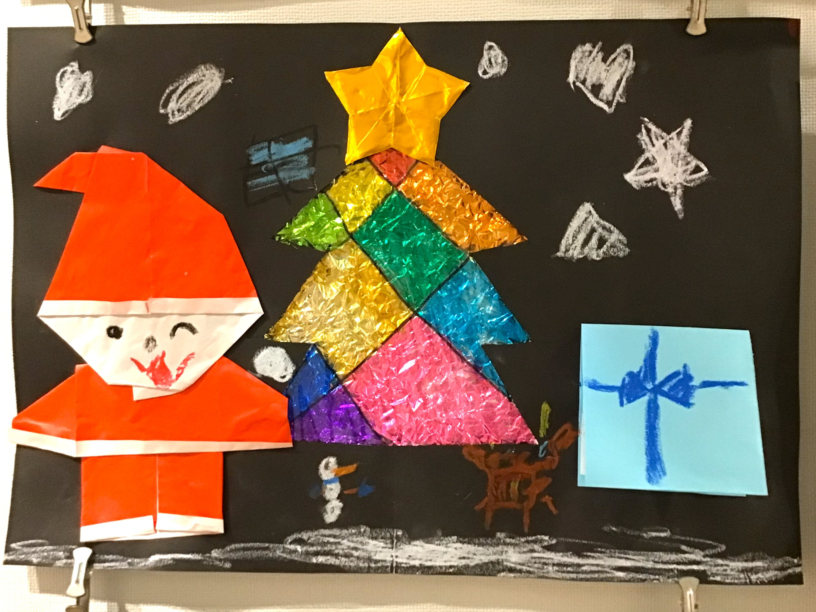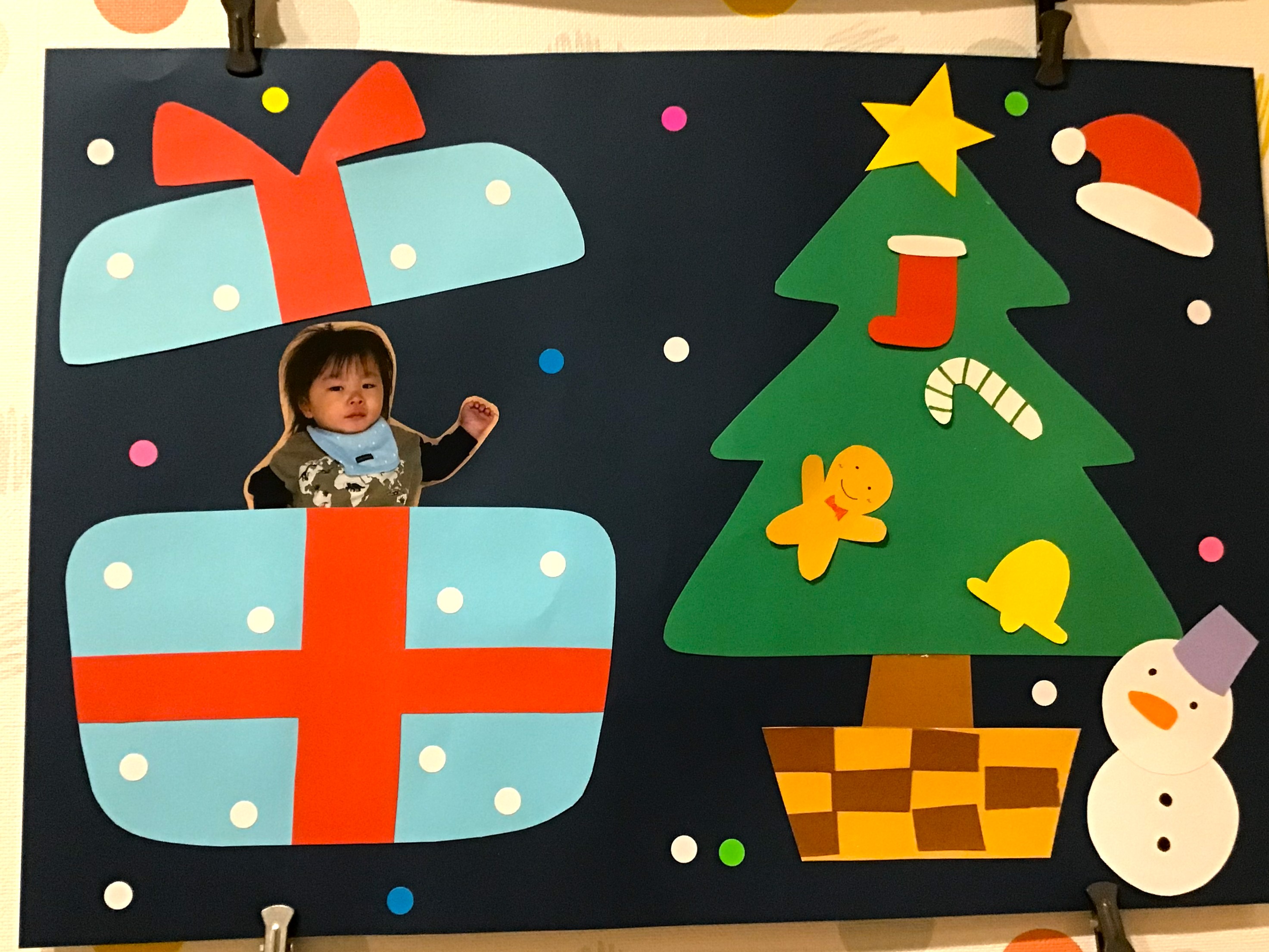 クリスマスの飾りを自由に貼り、箱の中から元気いっぱいな