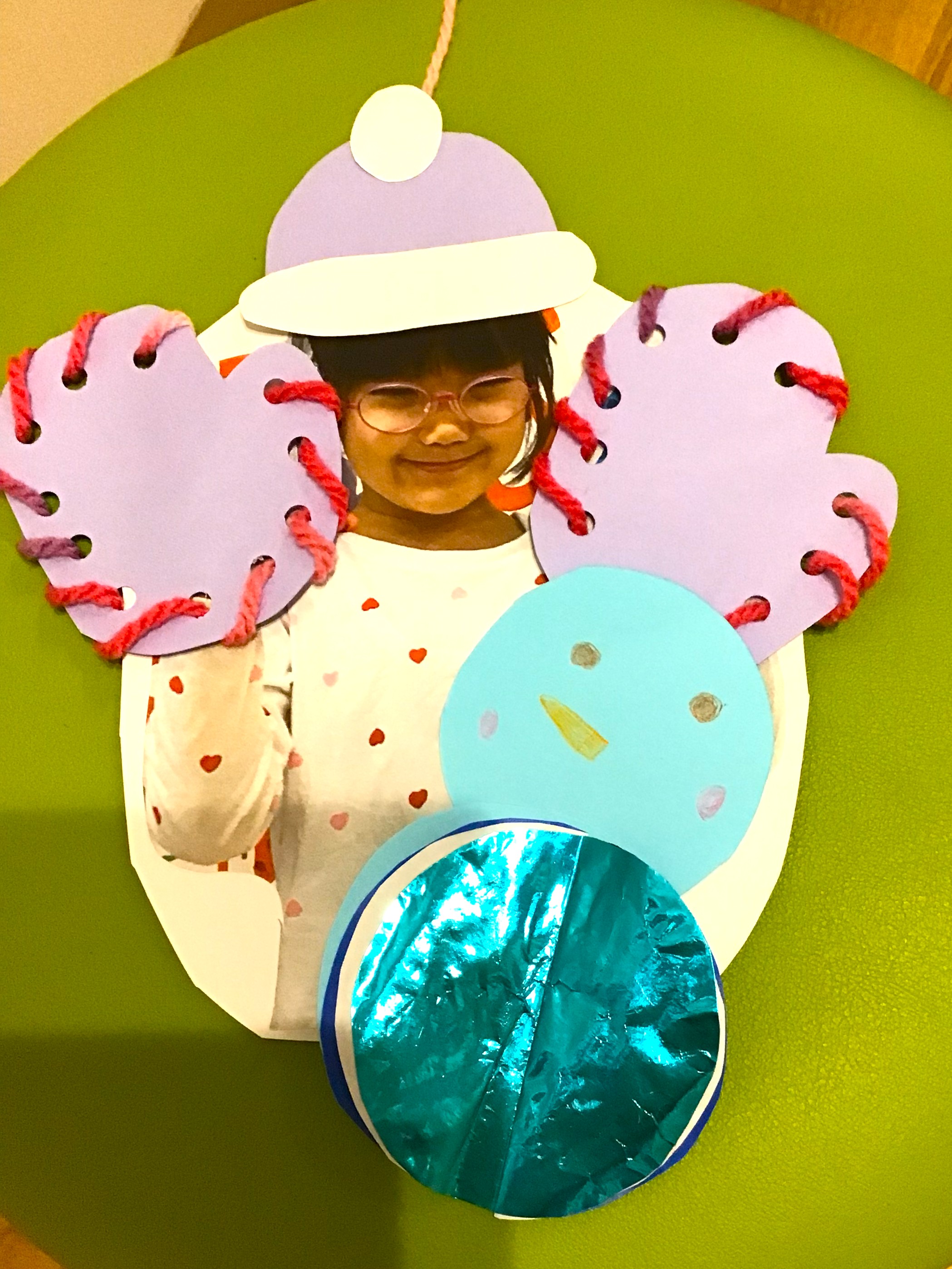 雪だるまは、カラ-ホイルを使用してつくりました。