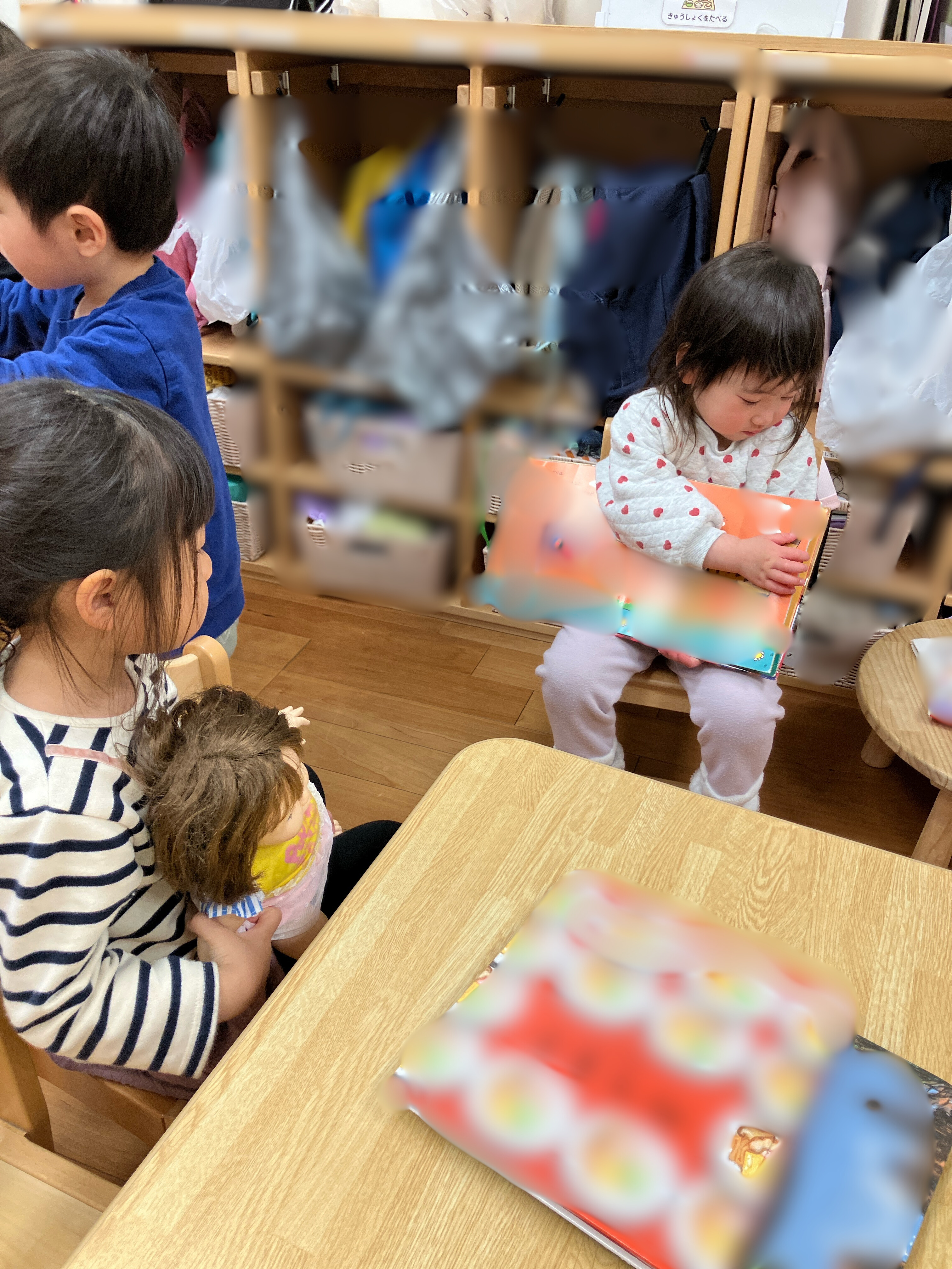 保育者の真似をして椅子に座り、朝の会では絵本の読み