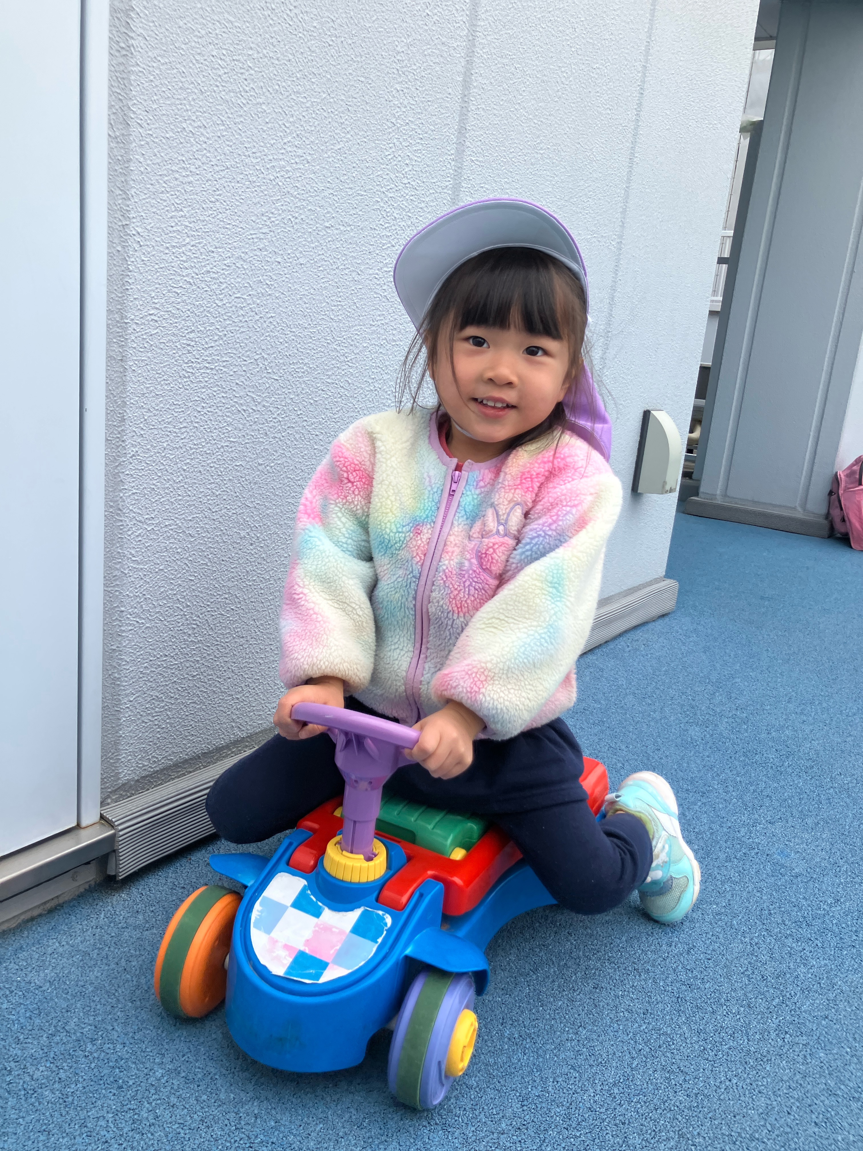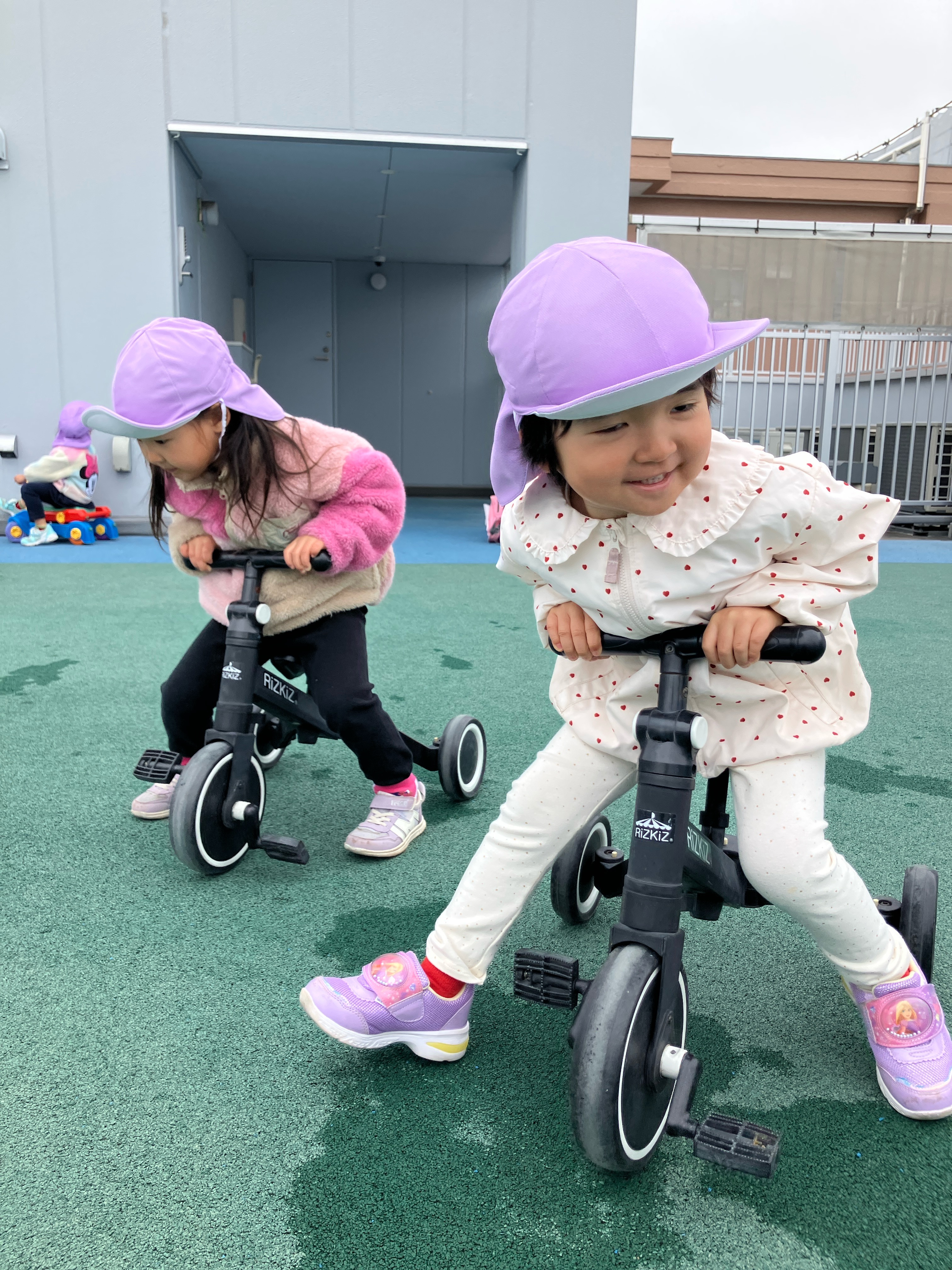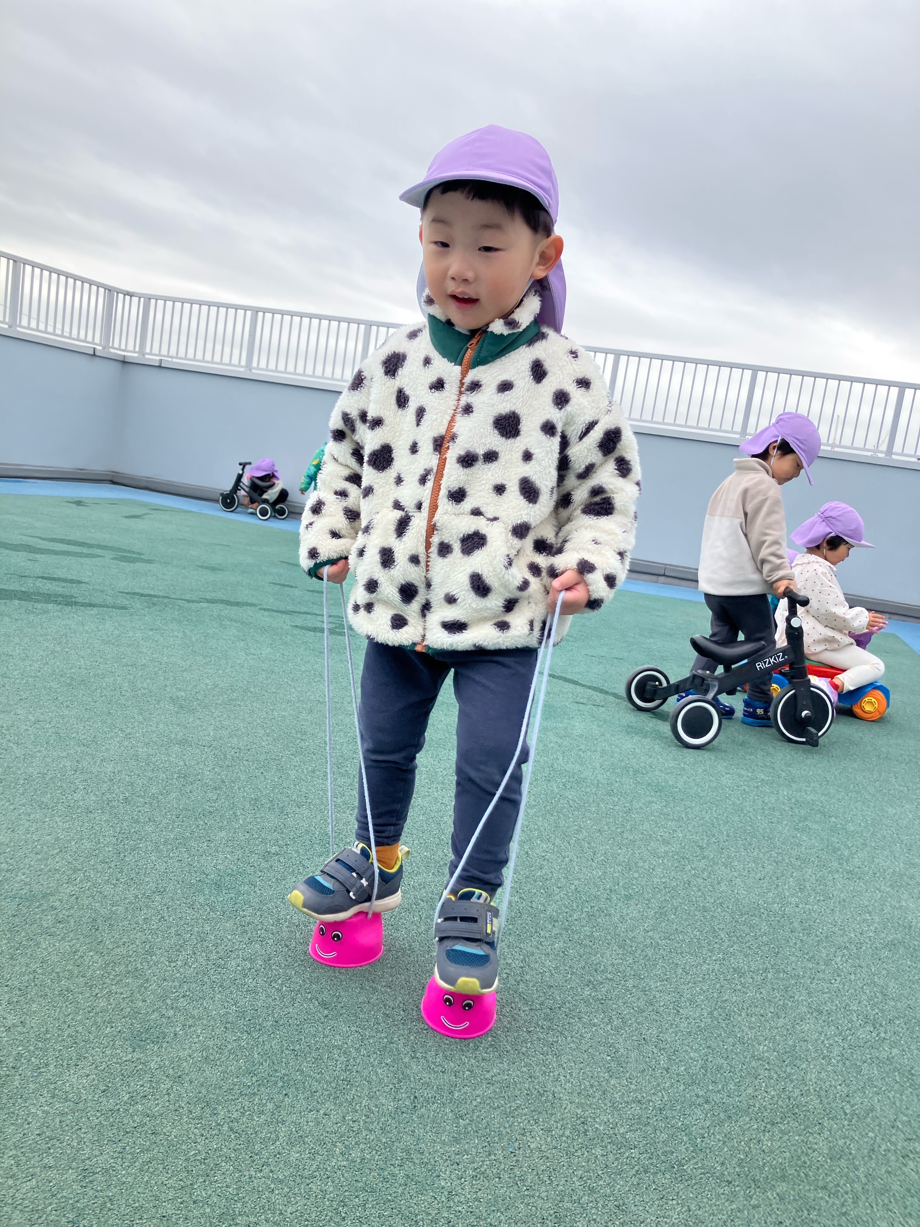 屋上遊びでは、ポックリに挑戦したり三輪車やコンビカ