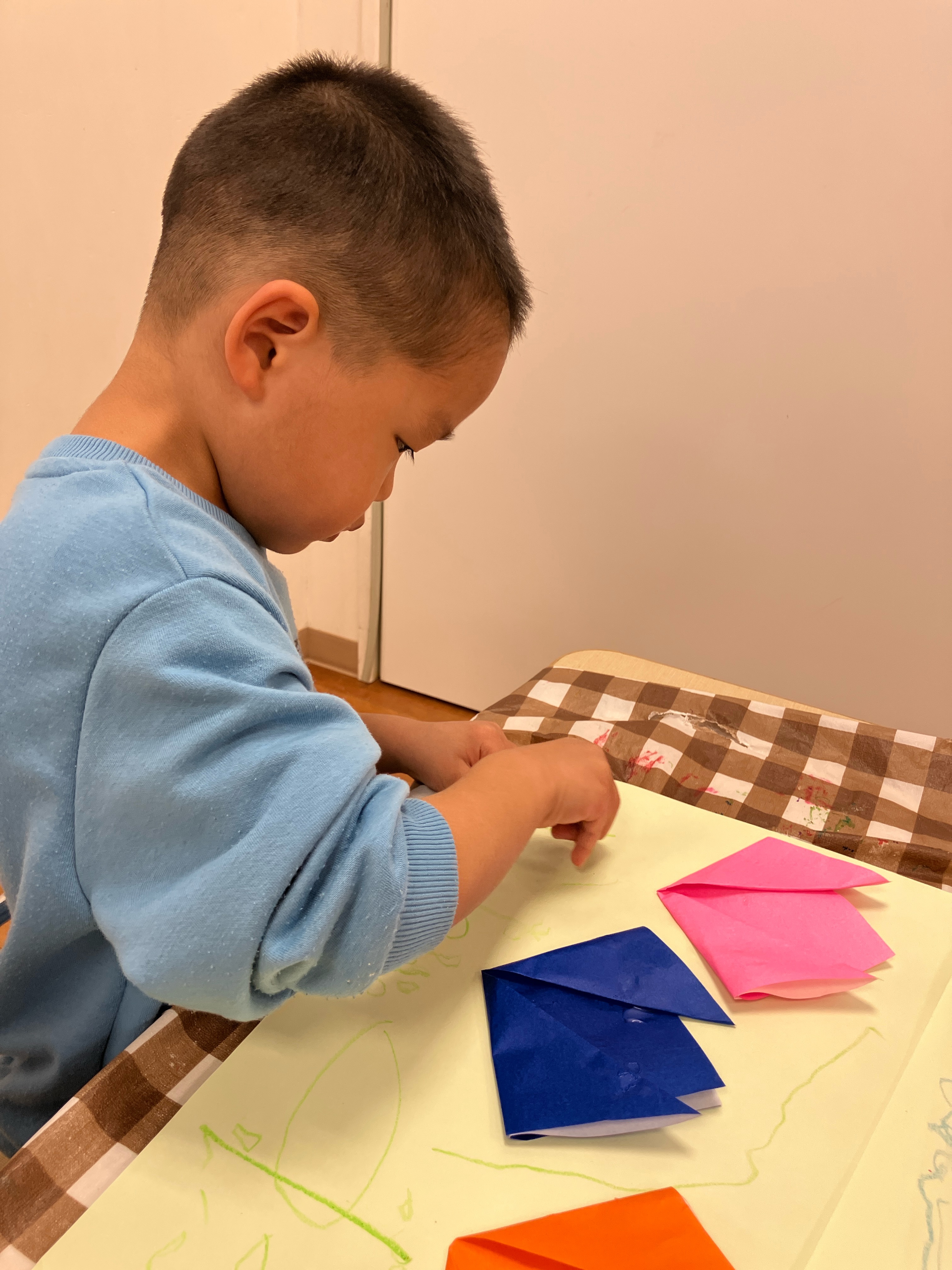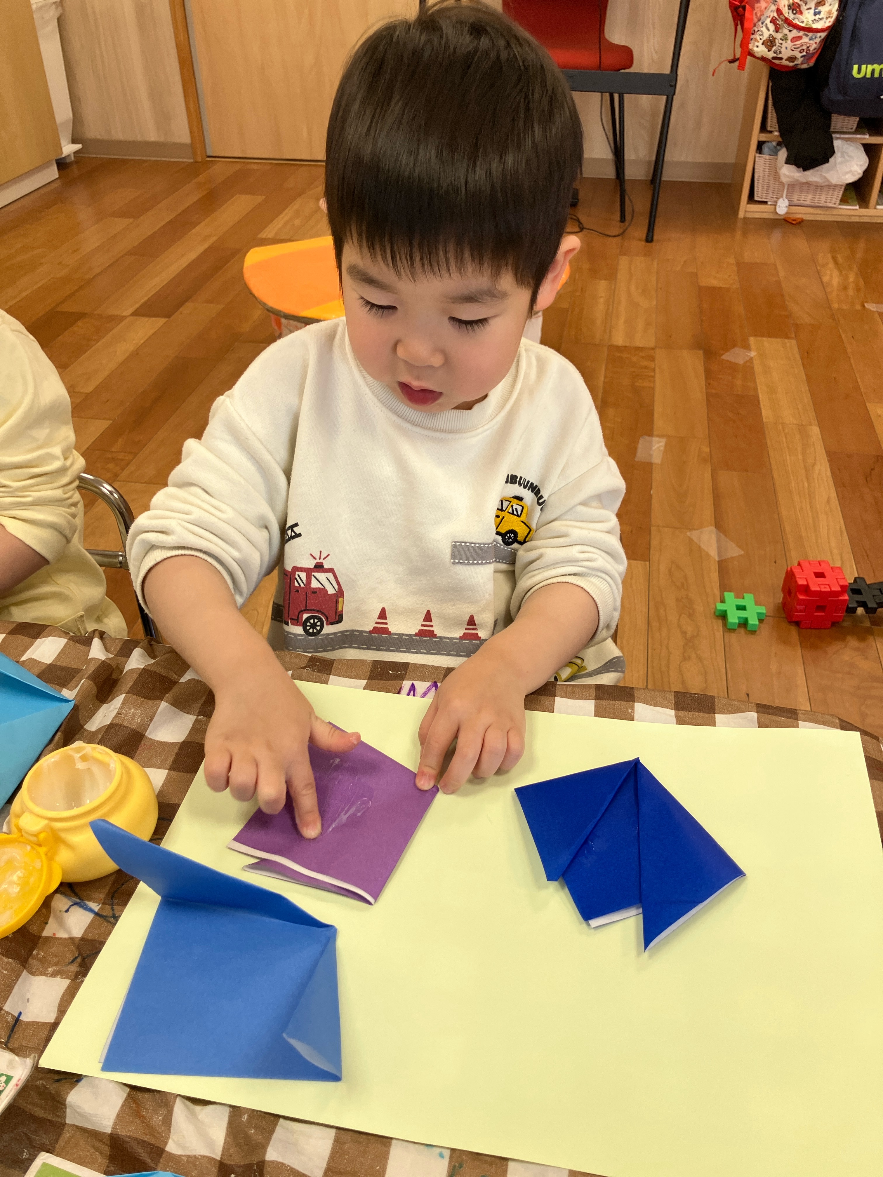 たり、折り方を確認しながら集中して折ったりする姿が
