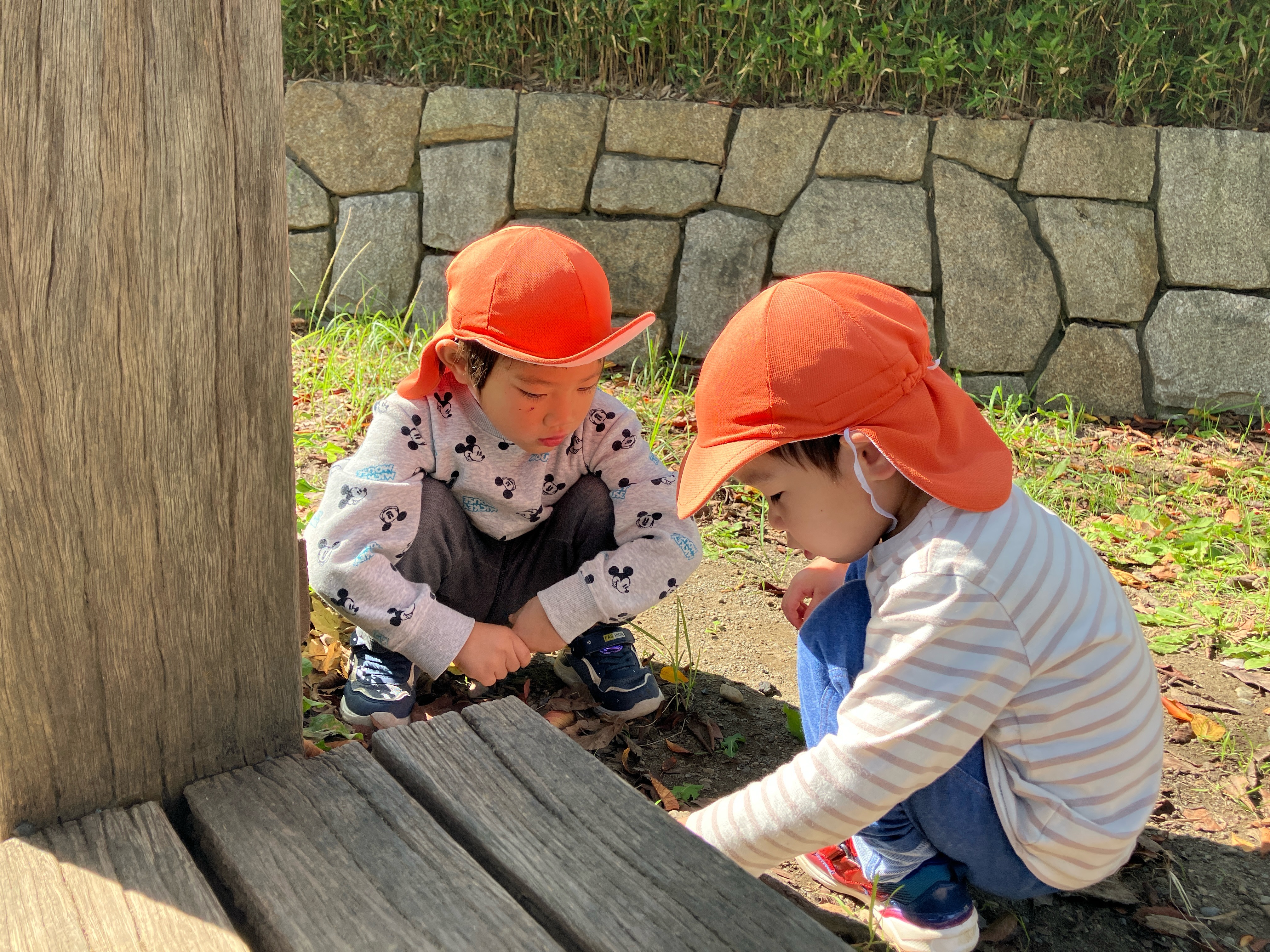 戸外活動では、自然物を見つけて友だち同士で教えあっ