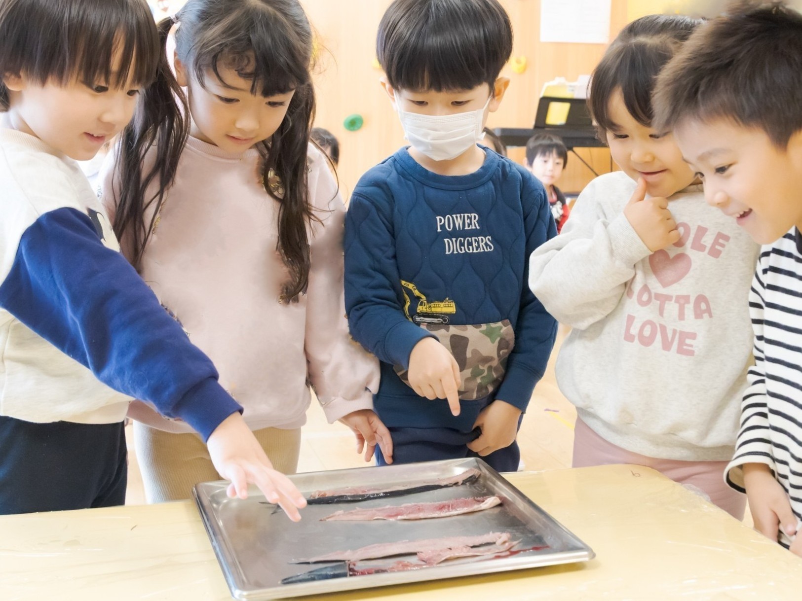 「ここは食べられるところ」「ここは骨だから食べられないところだ」とお友だちと教えてもらったことを確認していました。
