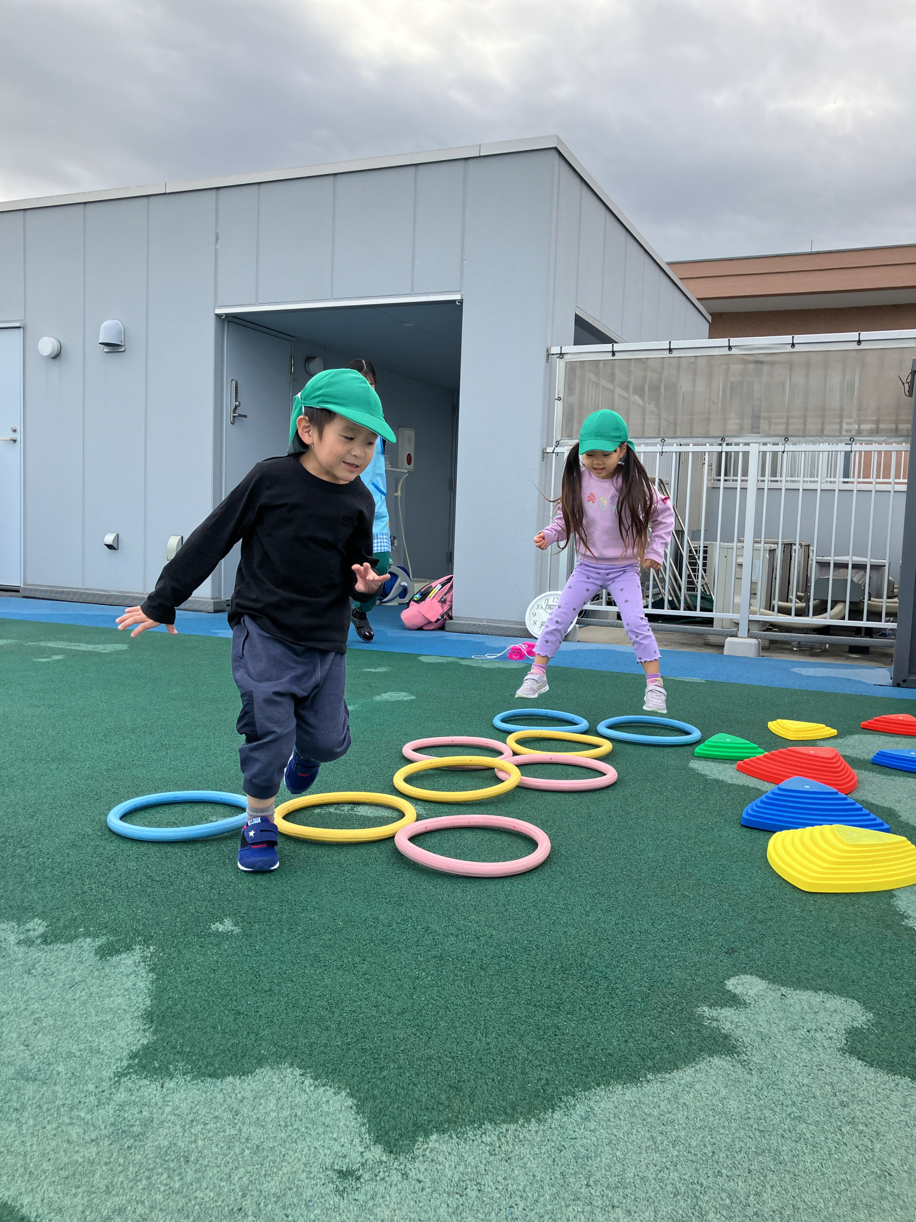 屋上遊びでは、フラフープを使ってケンケンパをしたり
