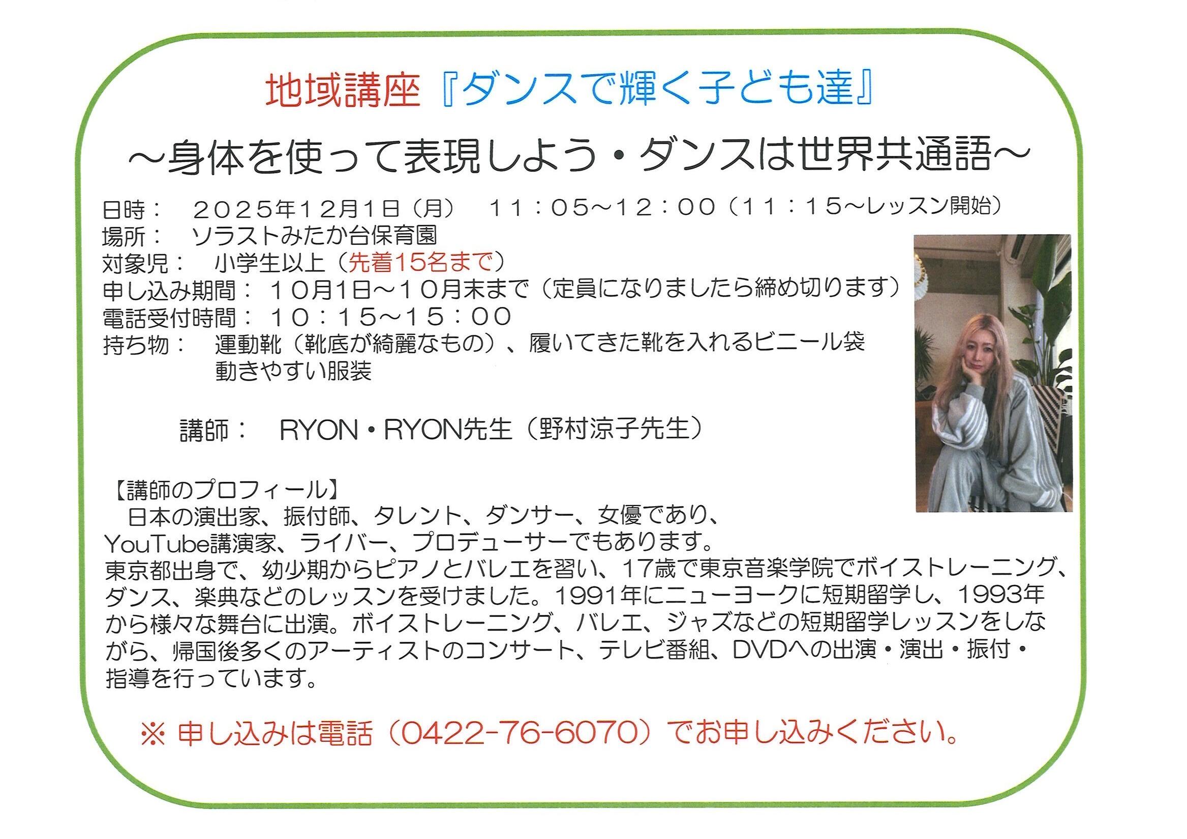 ソラストみたか台保育園☆ 地域講座 『ダンスで輝く子ども達』のご案内
