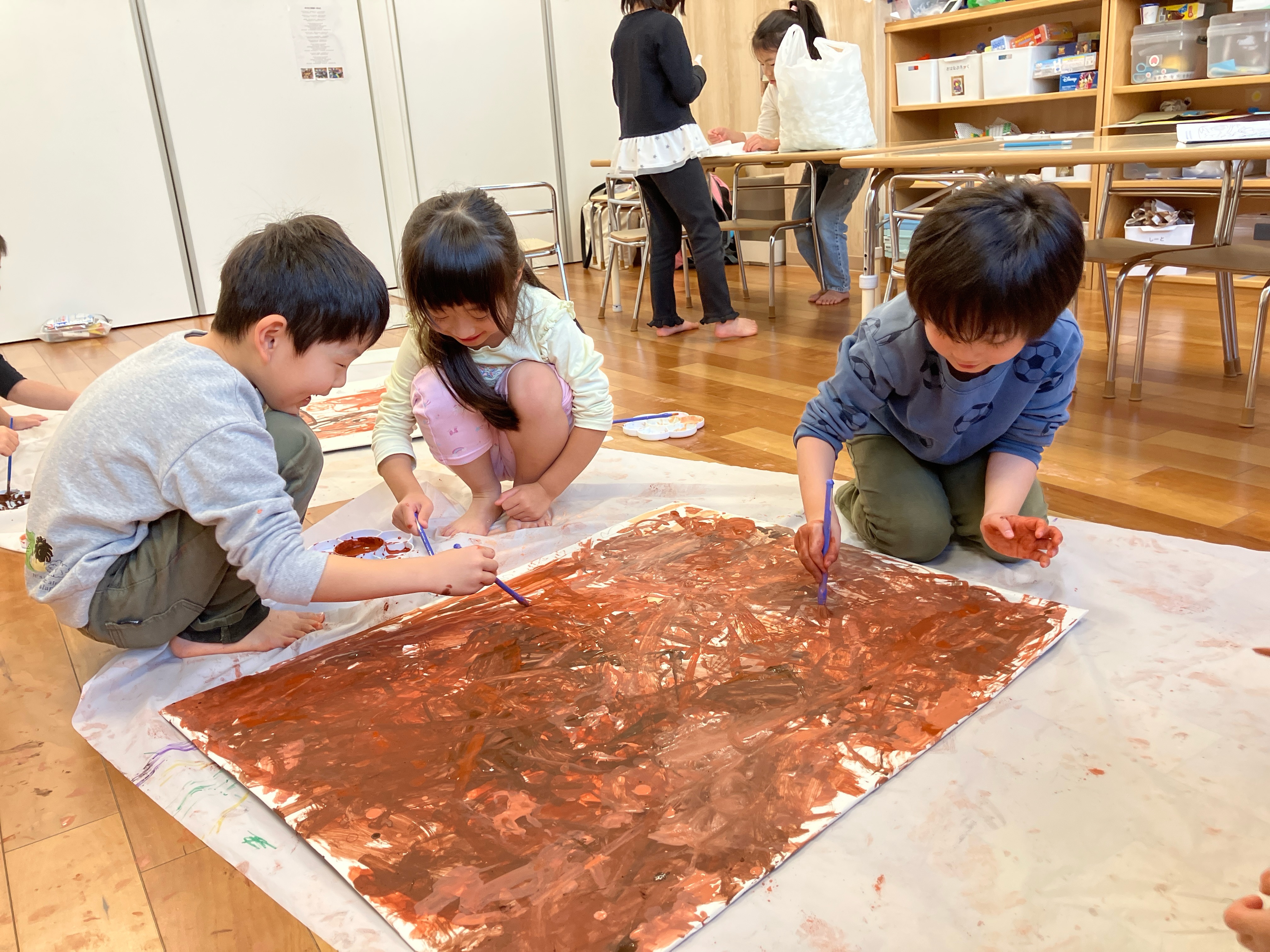 道具作りでは、みんなで絵の具を塗って木を作ったり