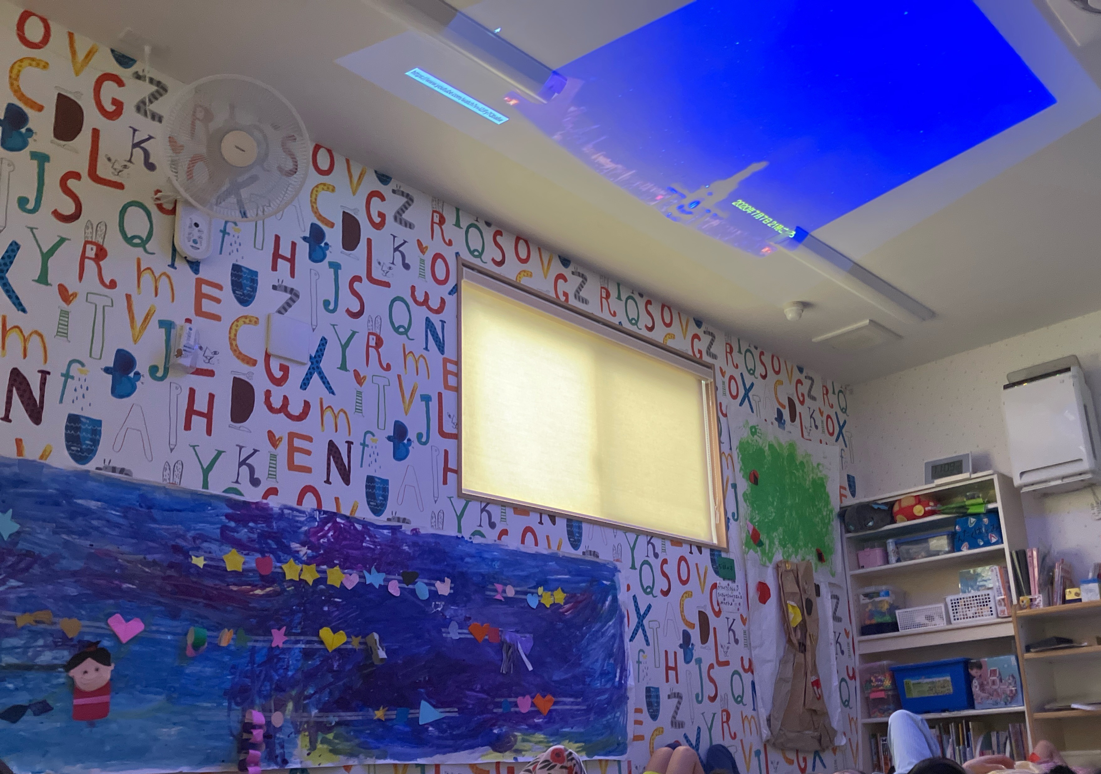 七夕会で、プロジェクターを使って天井にプラネタリウムを映し出し、