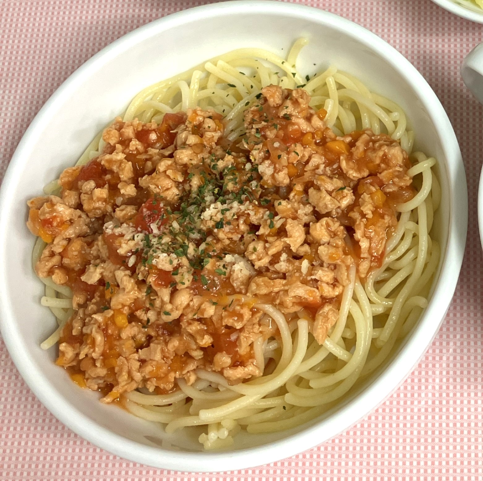 ・スパゲティー 250g ・オリーブ油 8g ・玉ねぎ 180g ・にんじん 80g ・鶏ひき肉 300g