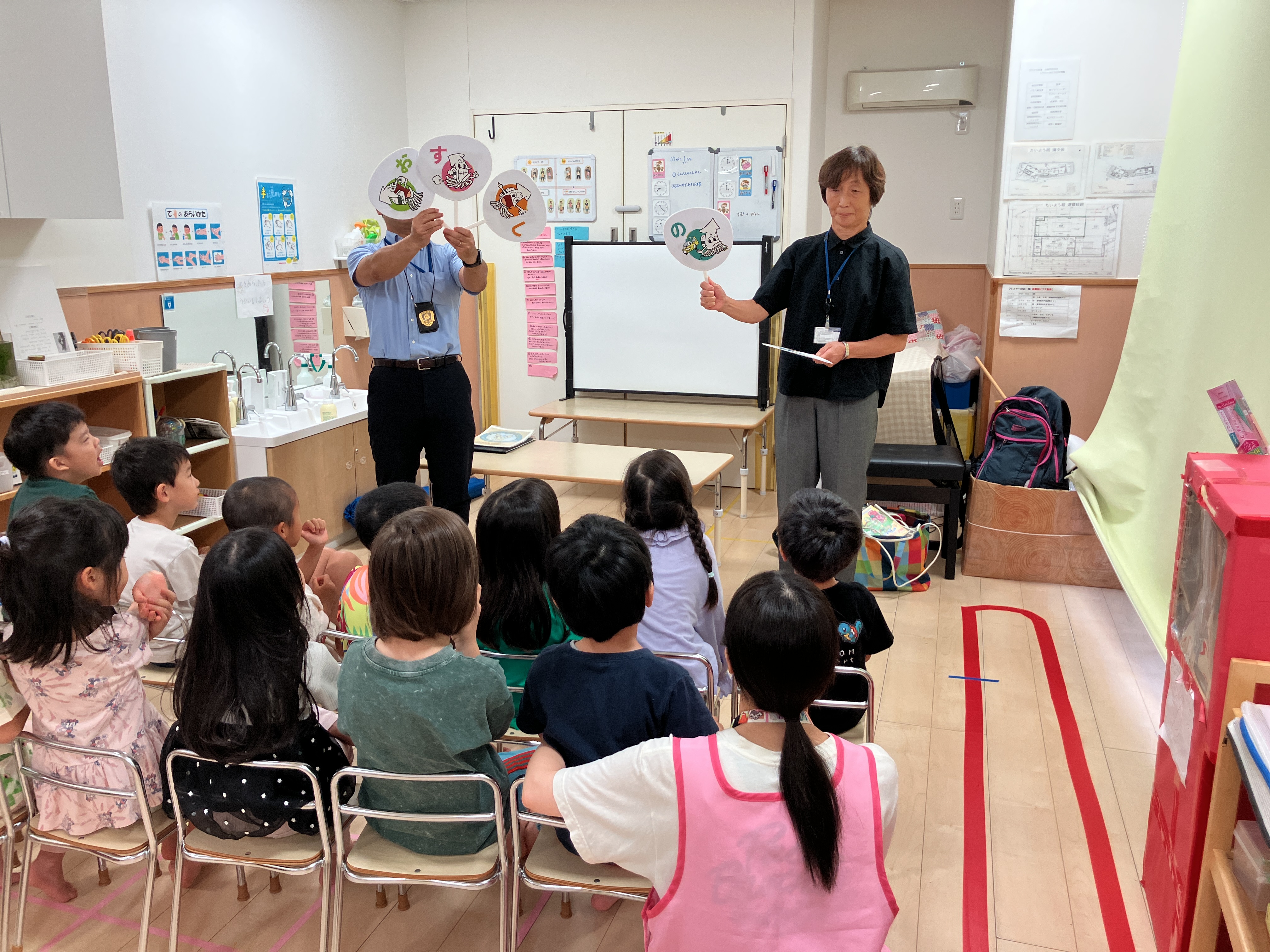 園全体で不審者訓練と、たいよう組で三鷹警察署の方による防犯講和がありました。
