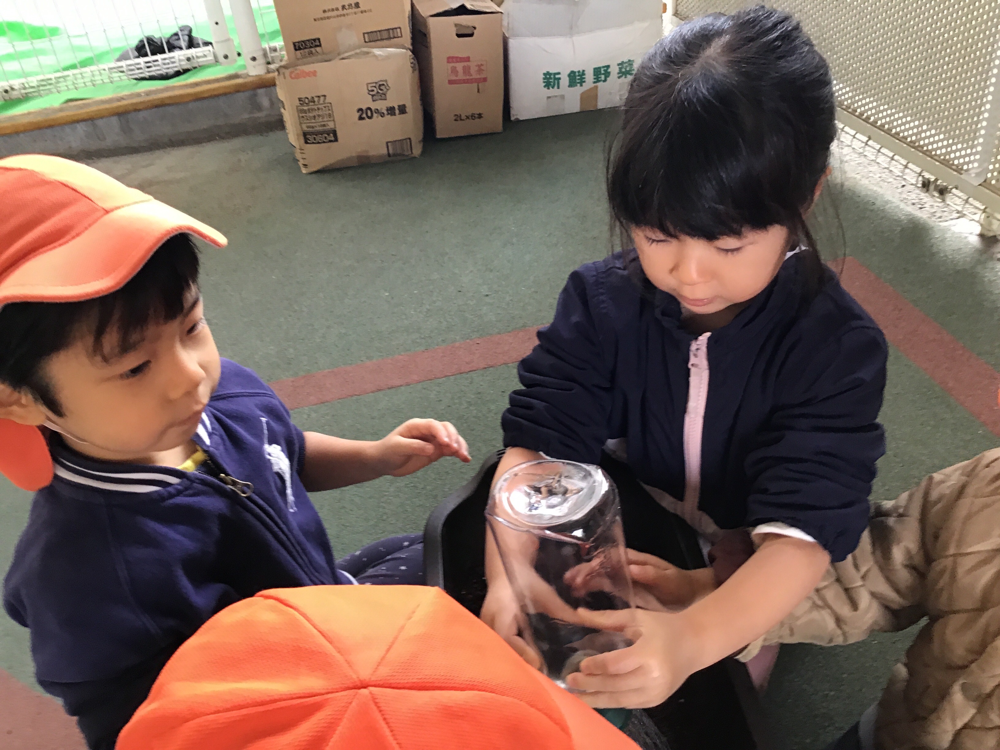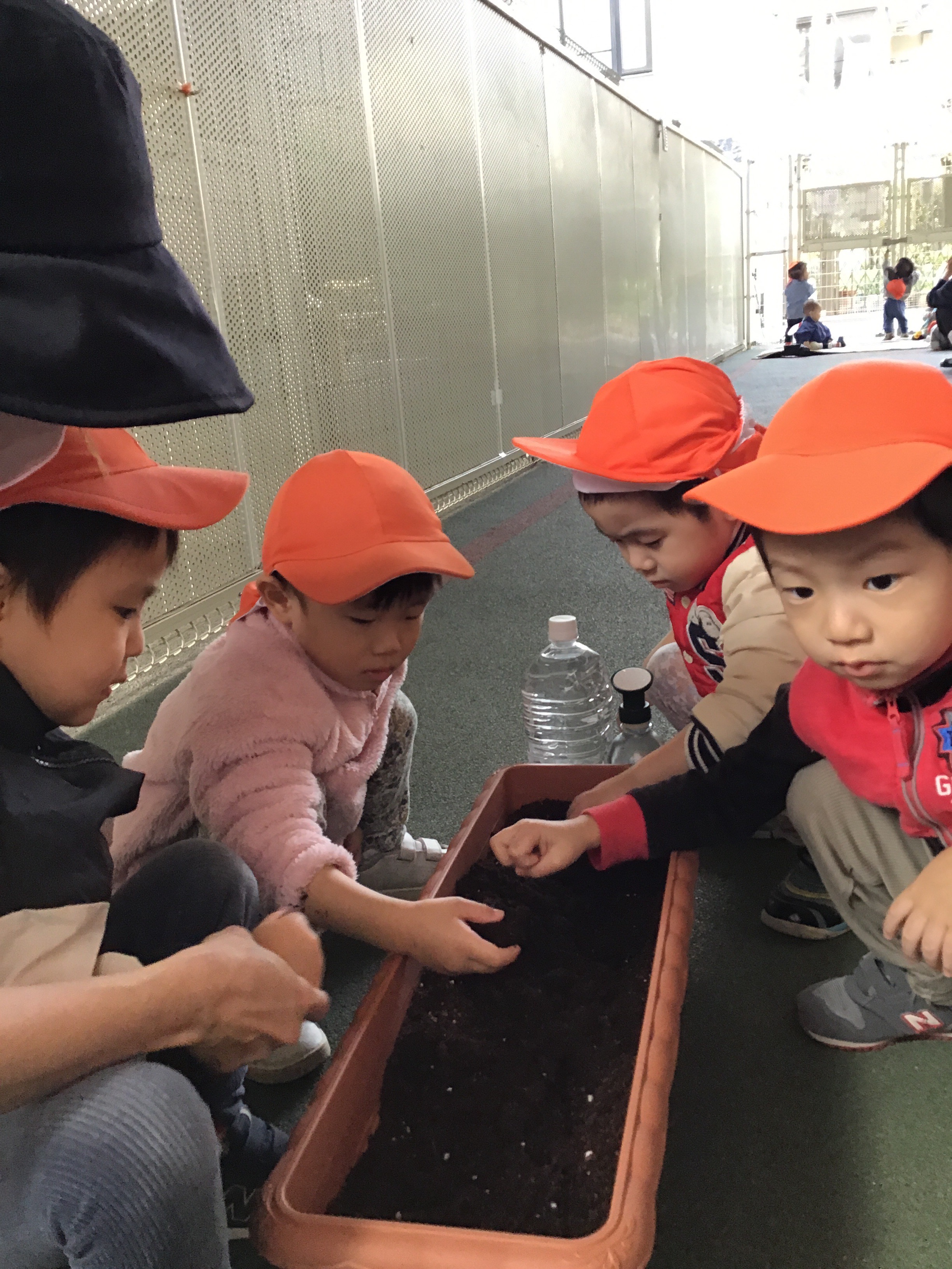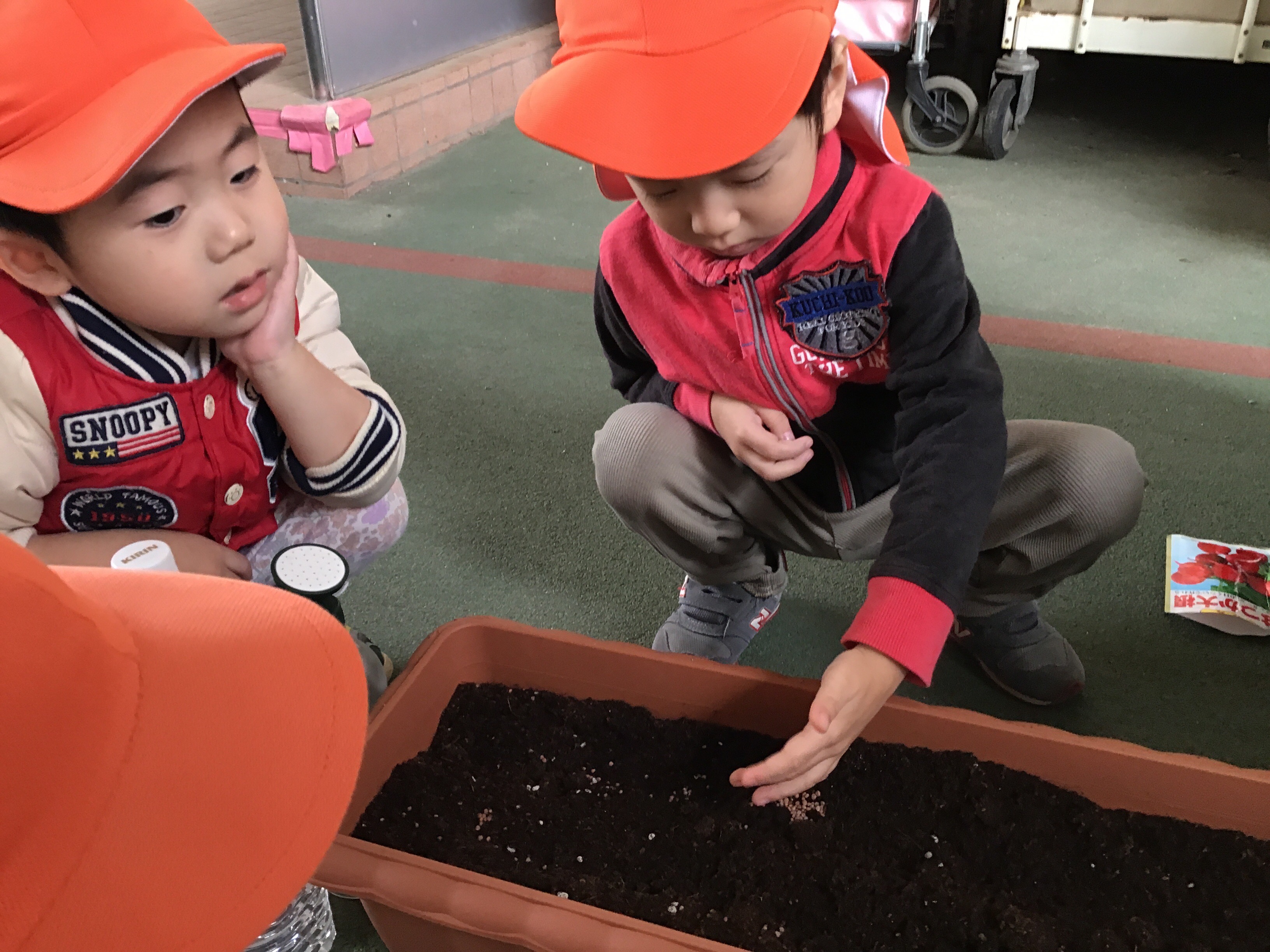 「種って小さいね」「土を触るのは楽しいね」と言いながら種まきです。![]()