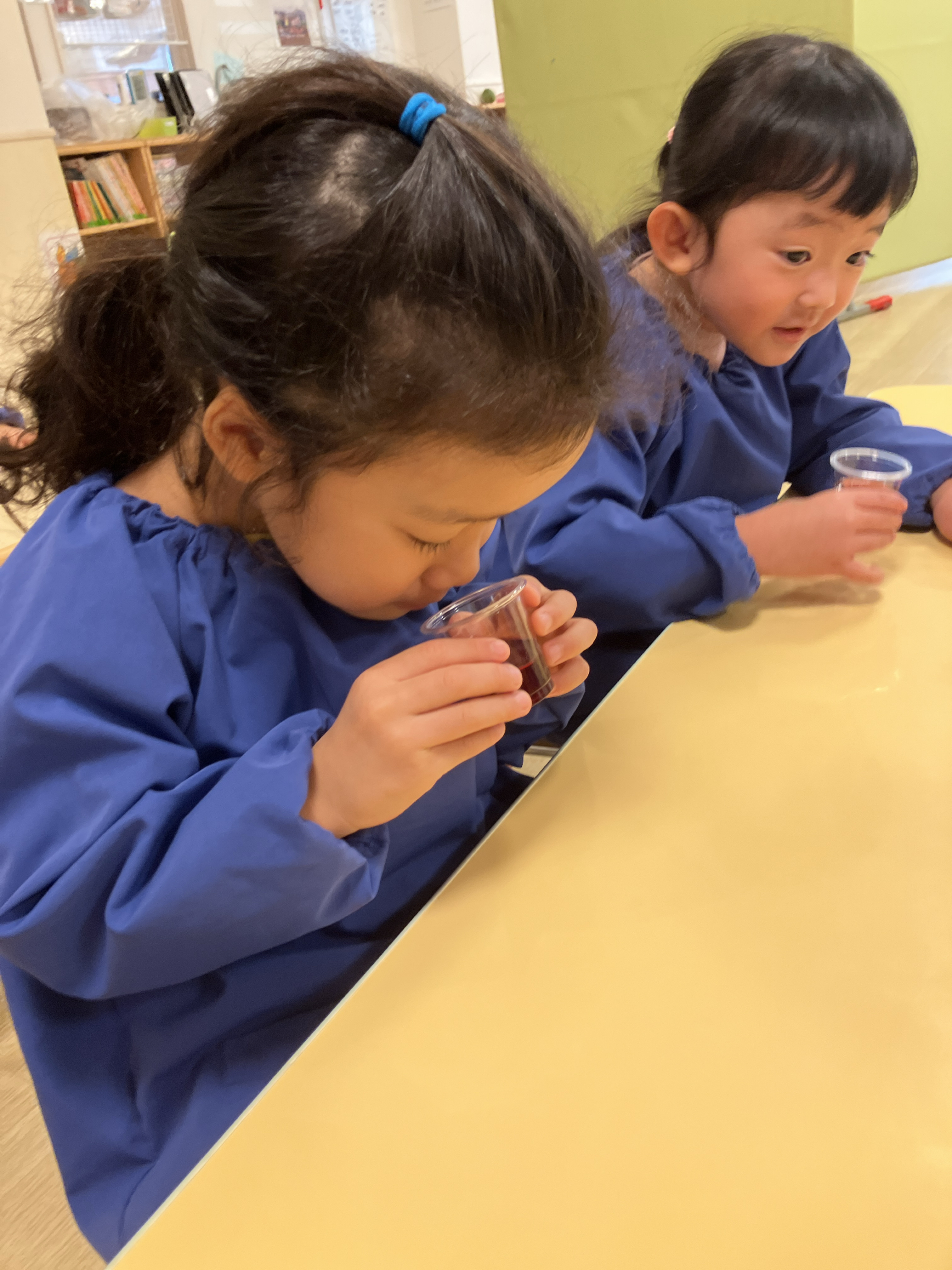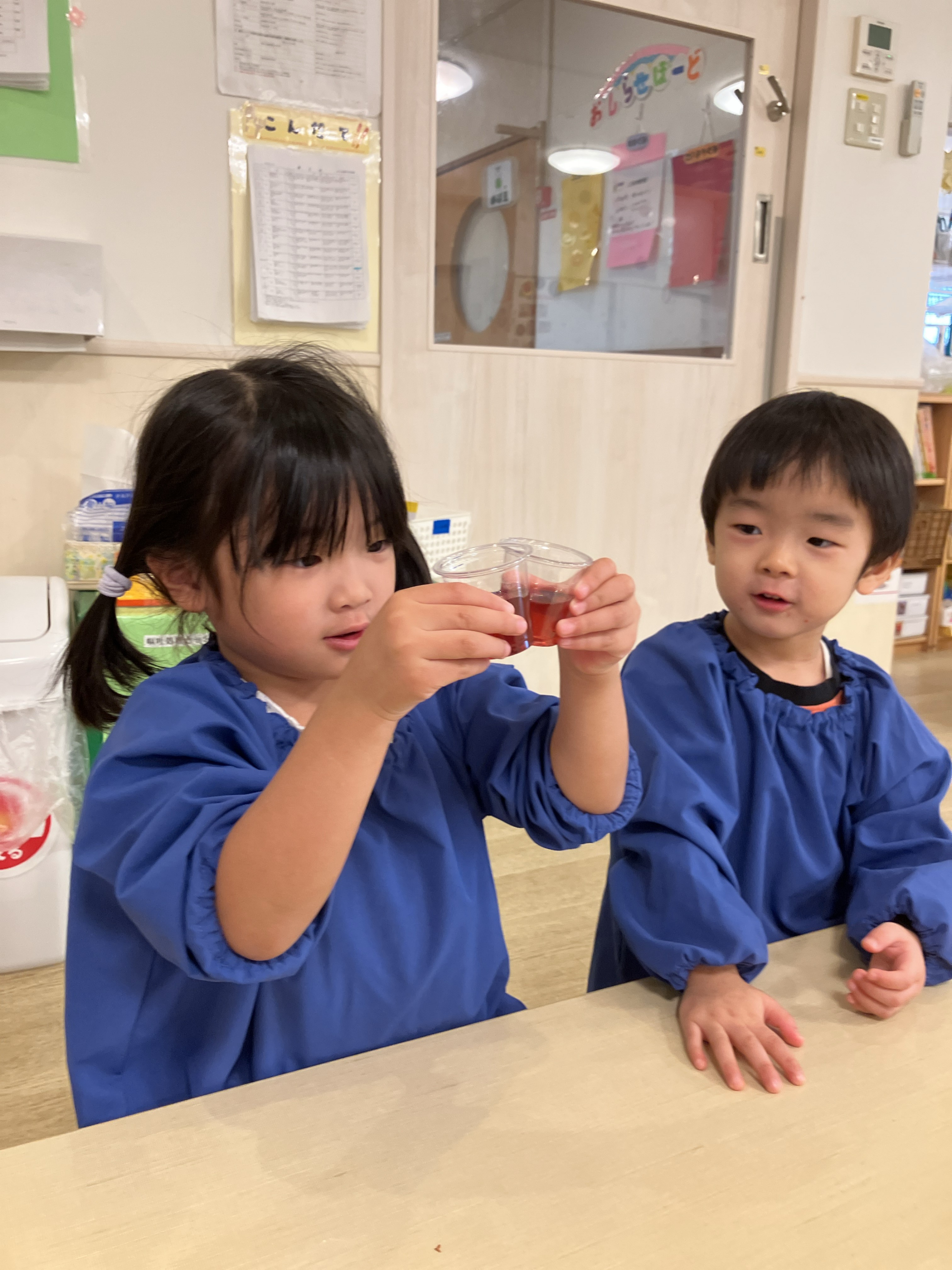 その後も出来た色水をコップに移して色比べをしたり、匂いを嗅い
