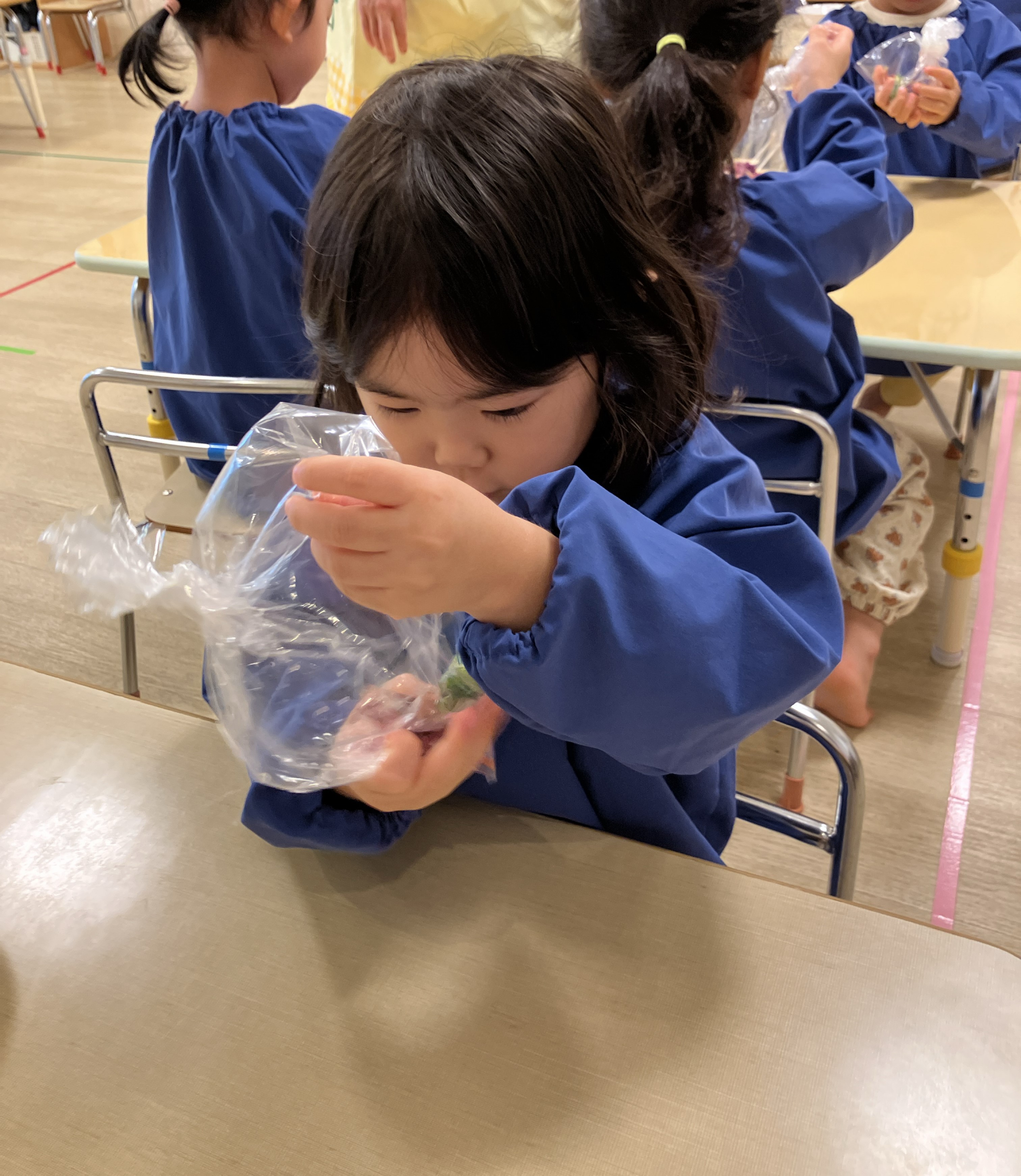 まずは保育者が手本として色水を作りました。袋にオシロイバナと水を