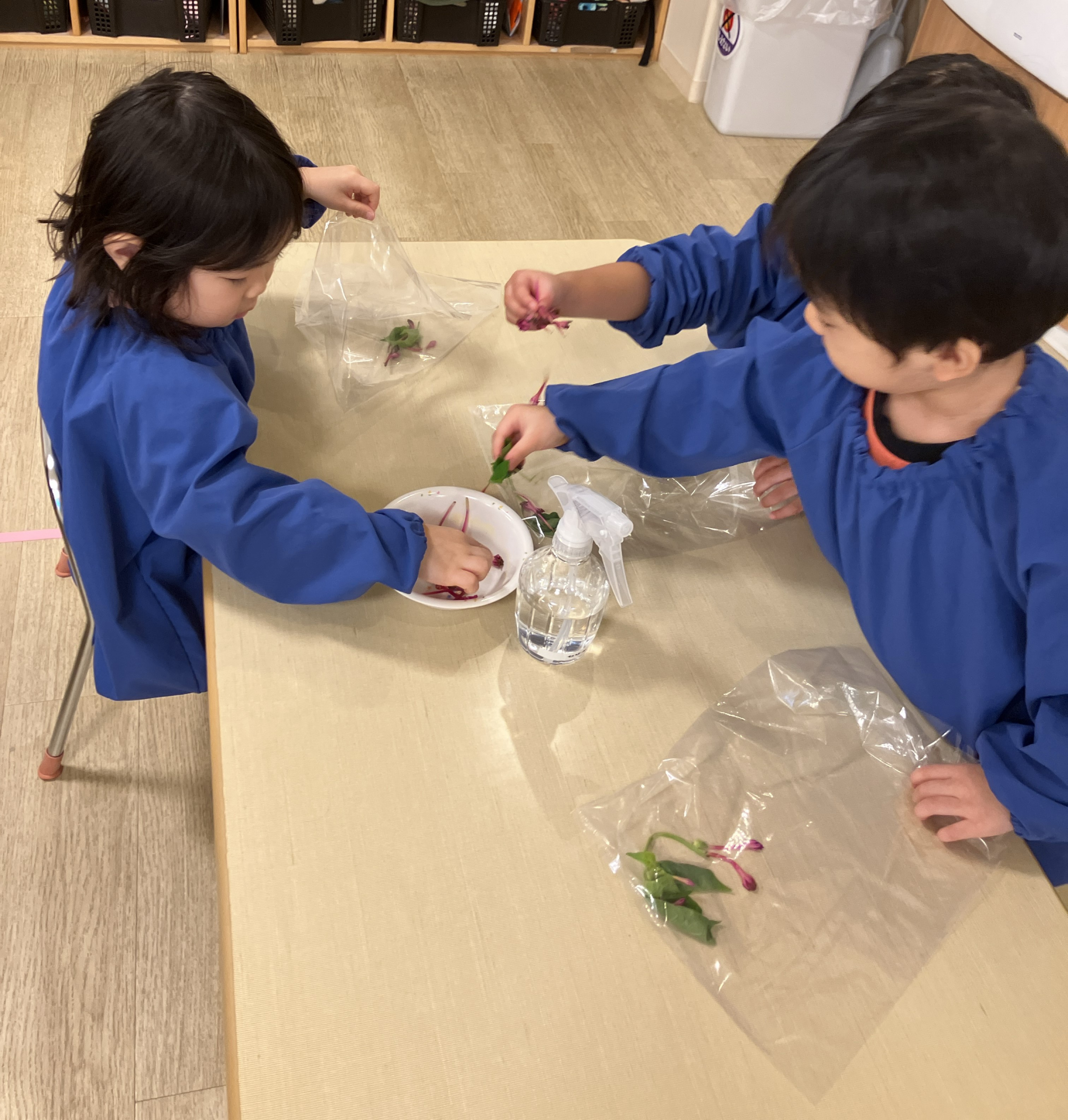 その後戸外遊びをしていると、「先生このお花も色がでるかな?さっきの