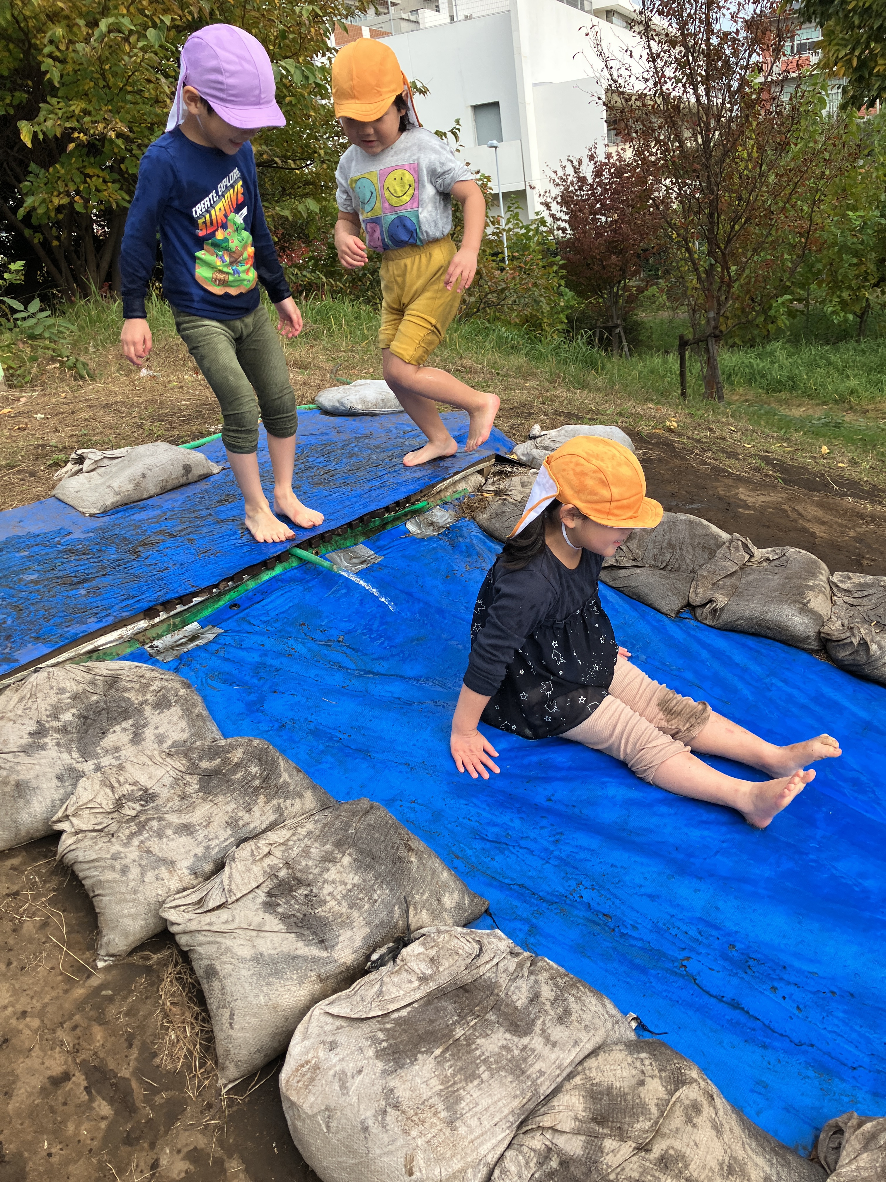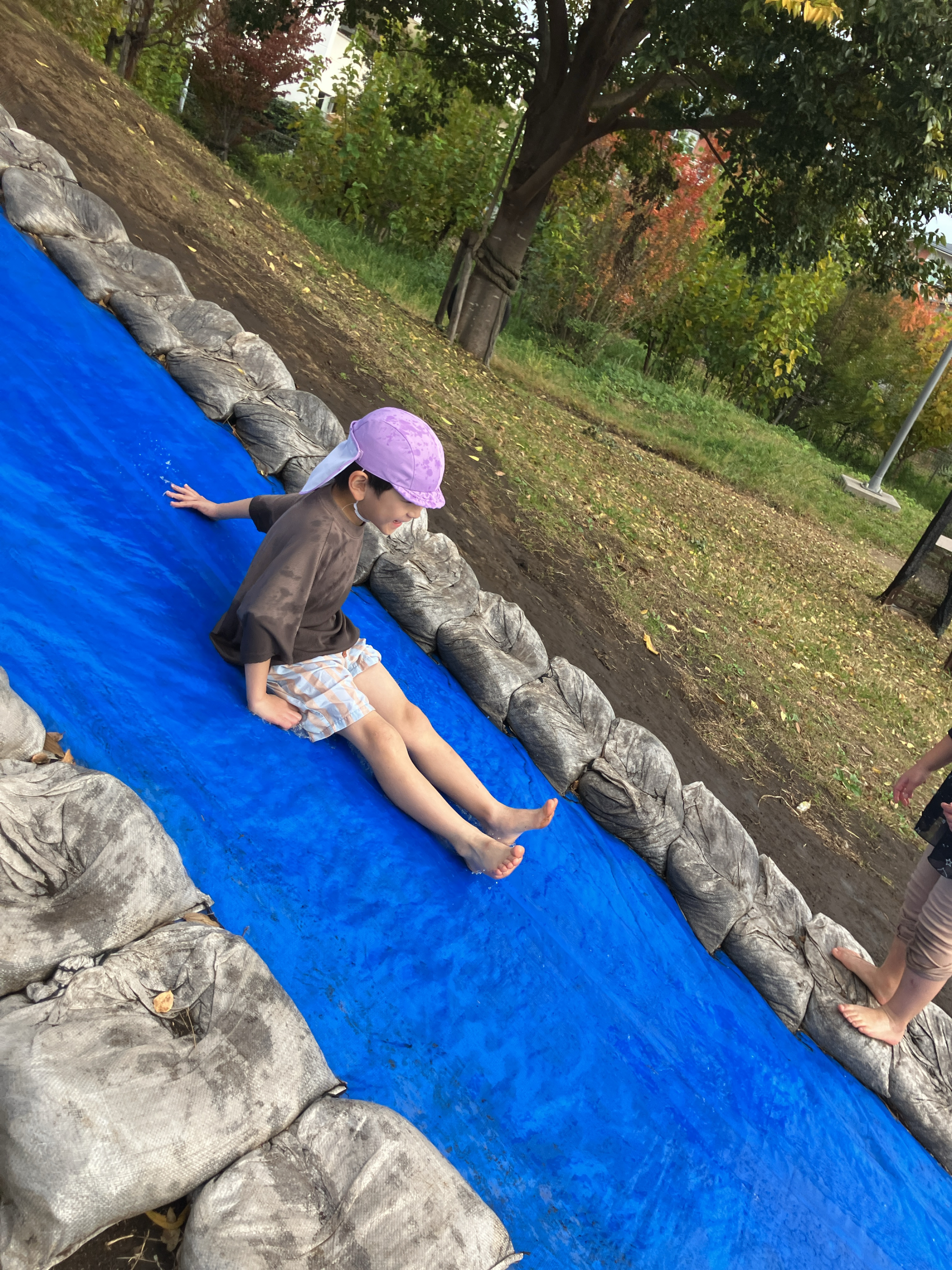 土の山にブルーシートで作った滑り台。ホースから水が出ていて滑りを良くしています。