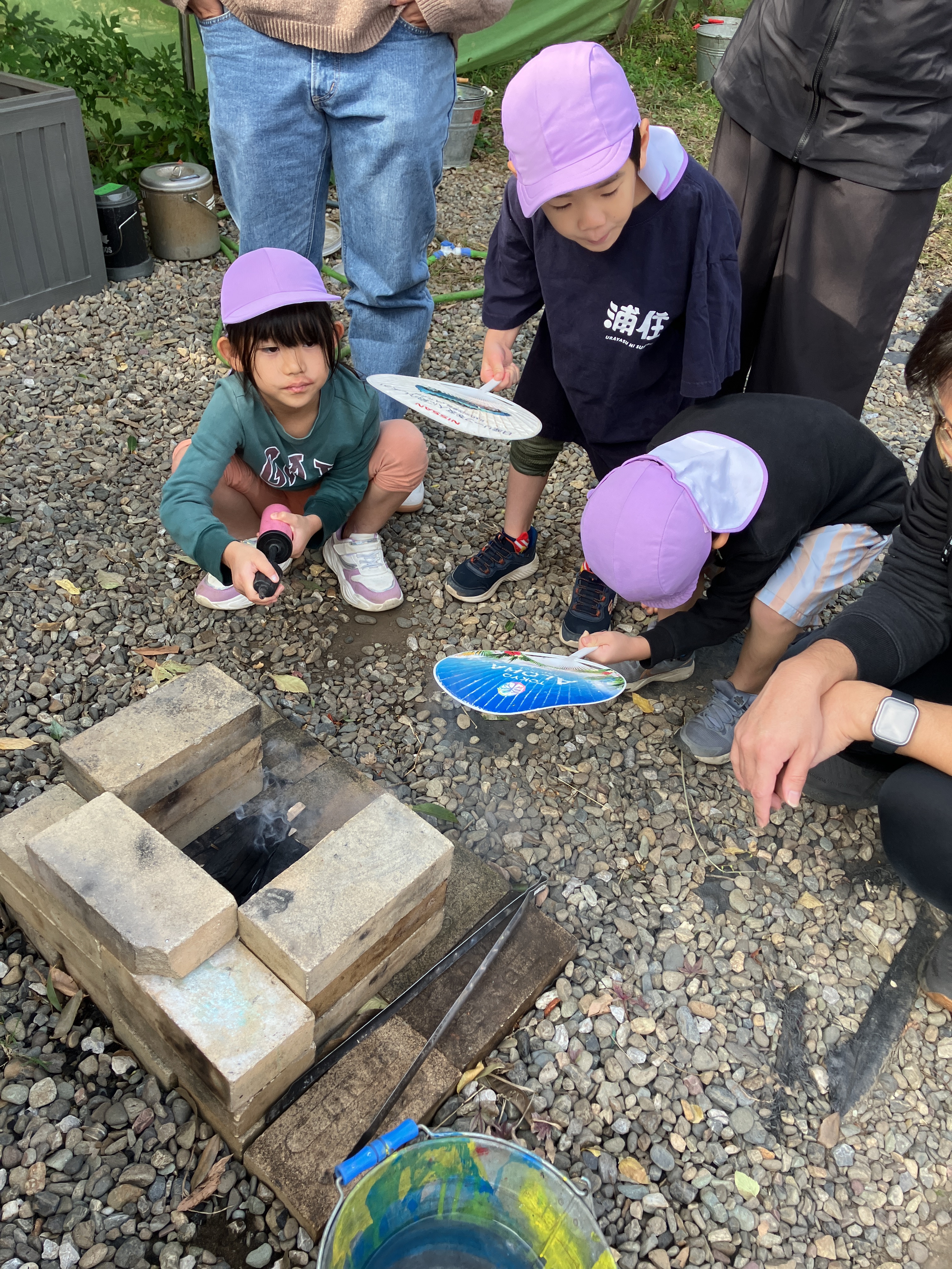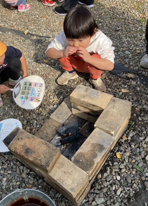 寒い時にはありがたい火起こし体験。種火はさすがにマッチを使いますが、