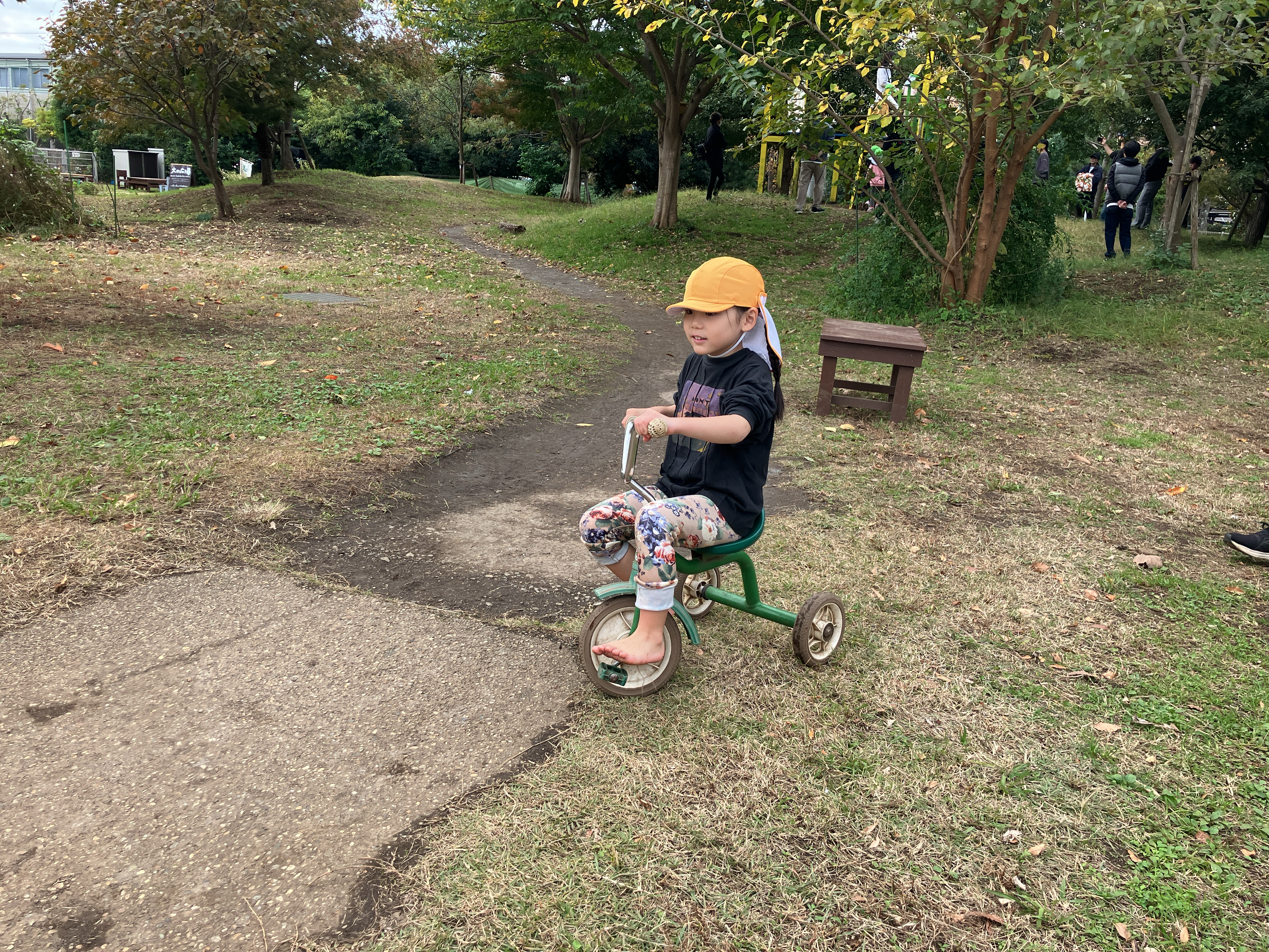 広場の中を三輪車で探検中!結構広いのでアドベンチャー気分!