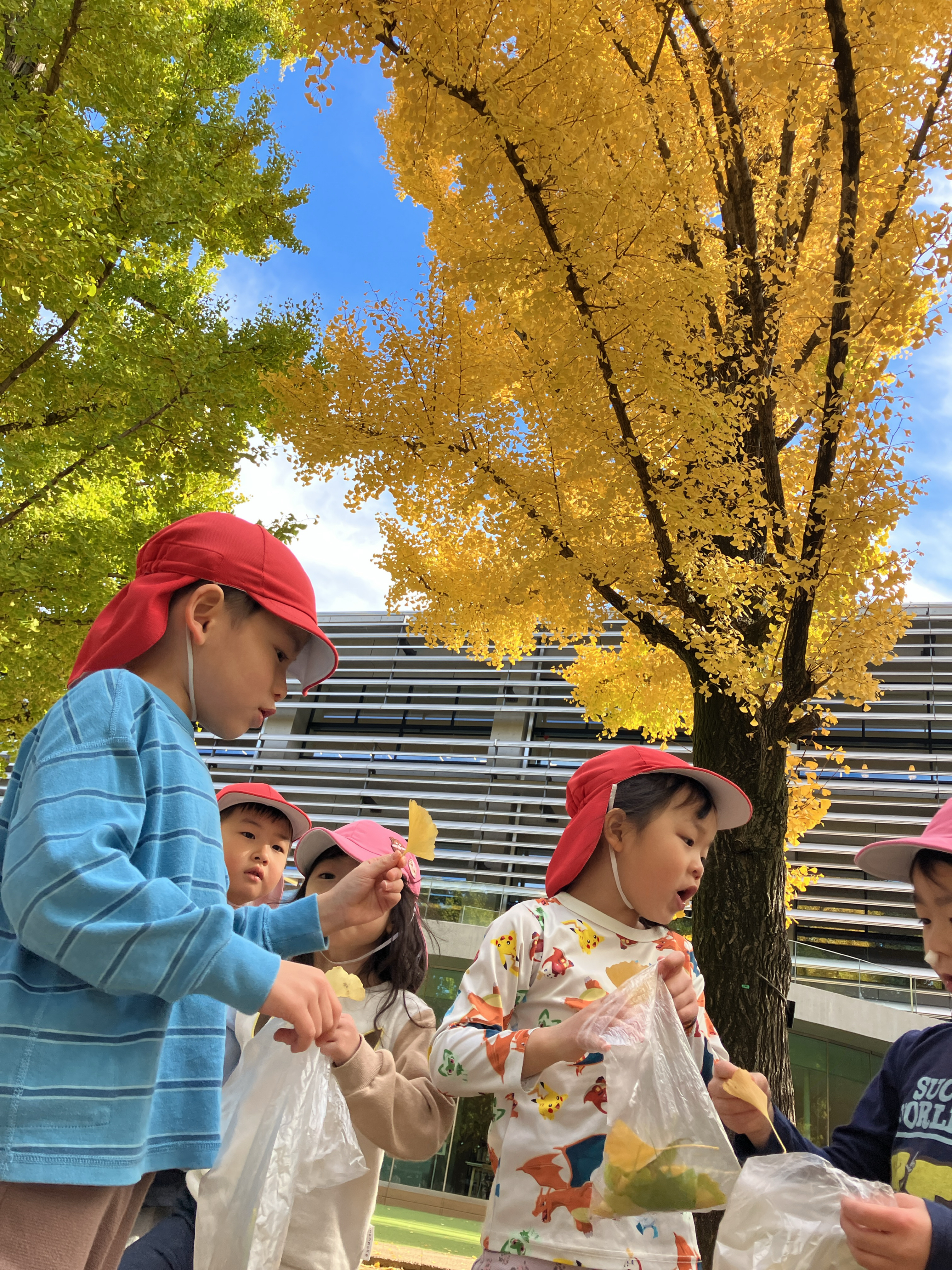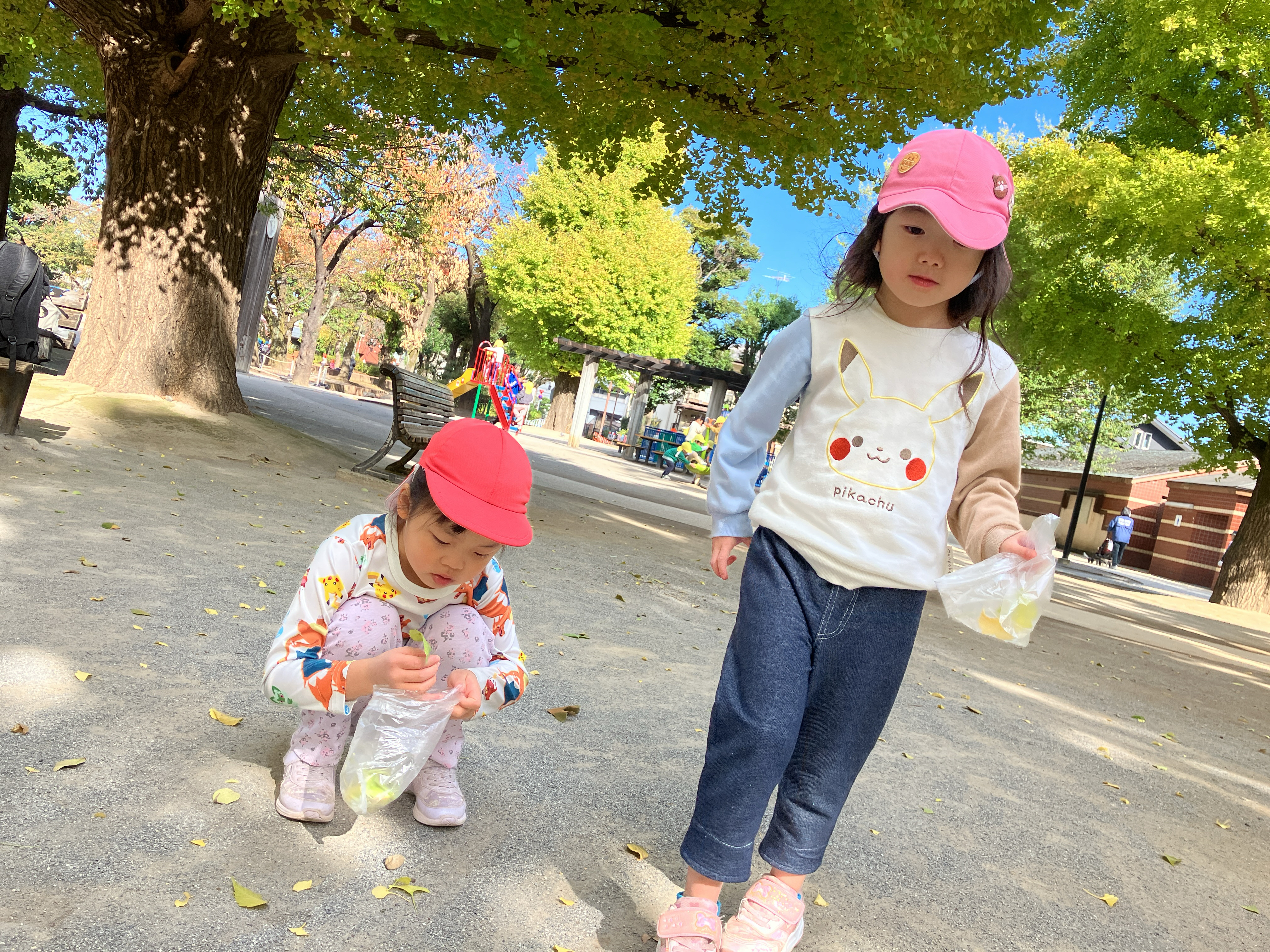 普段よく訪れる公園では見かけないイチョウの葉がたくさん落ちていて