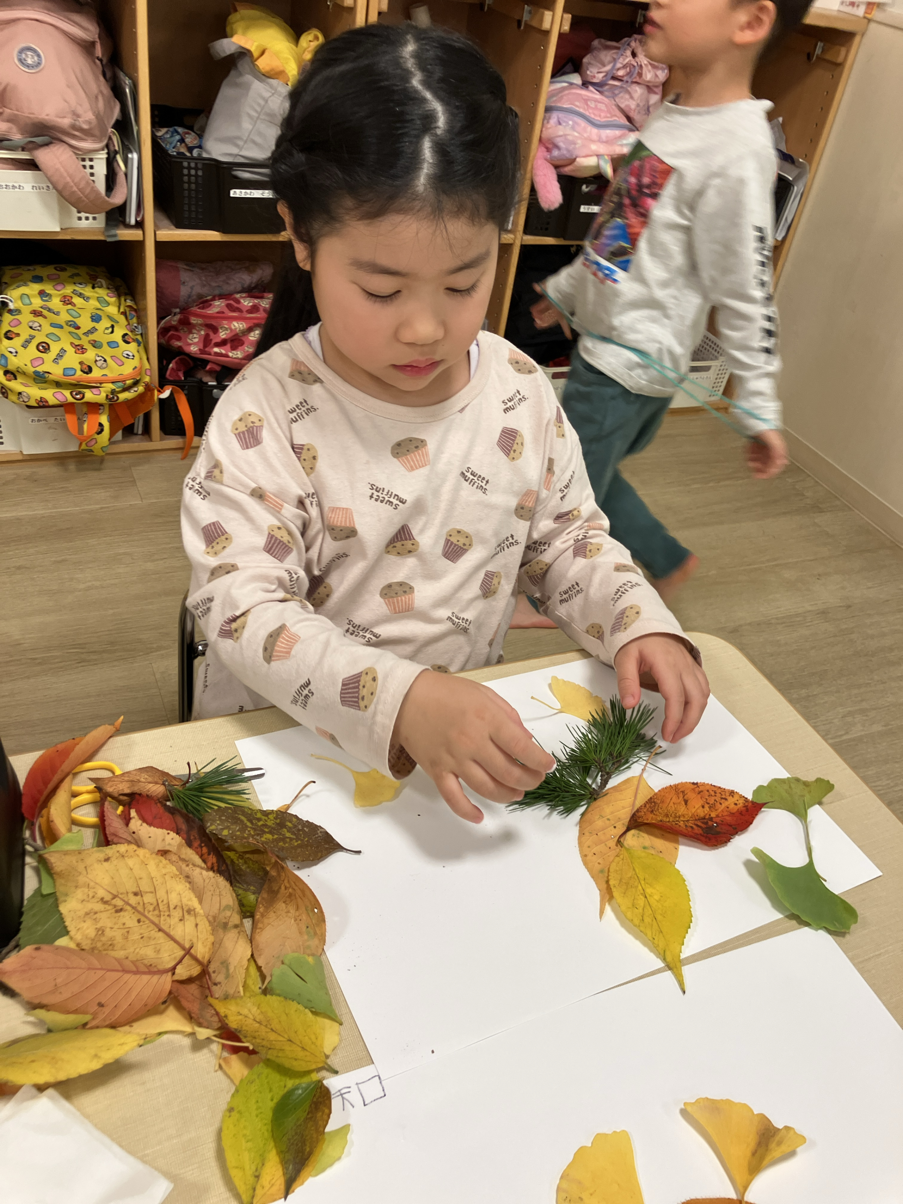 お気に入りの落ち葉を持ち帰り、夕方は落ち葉を使った製作を行いました。