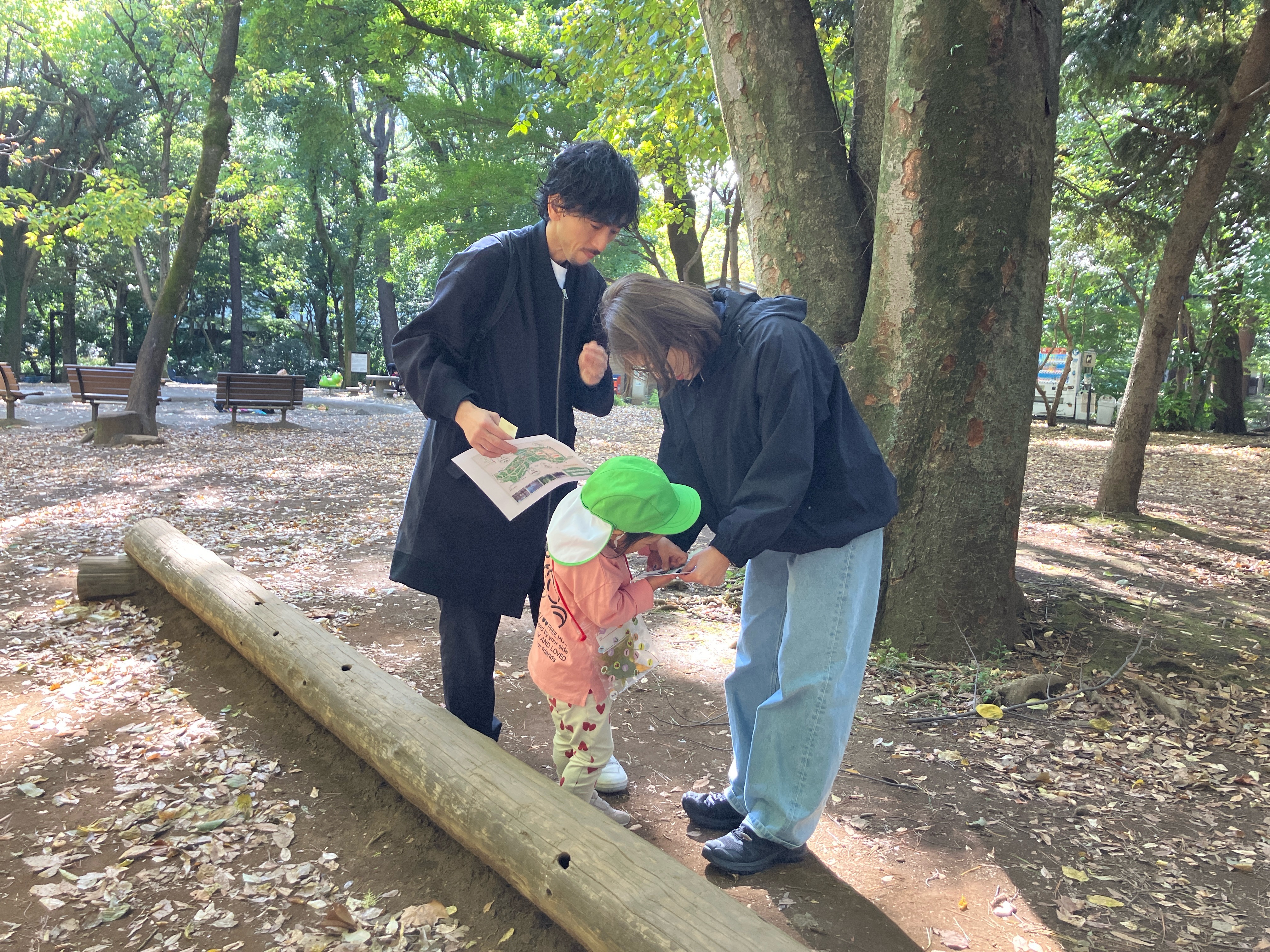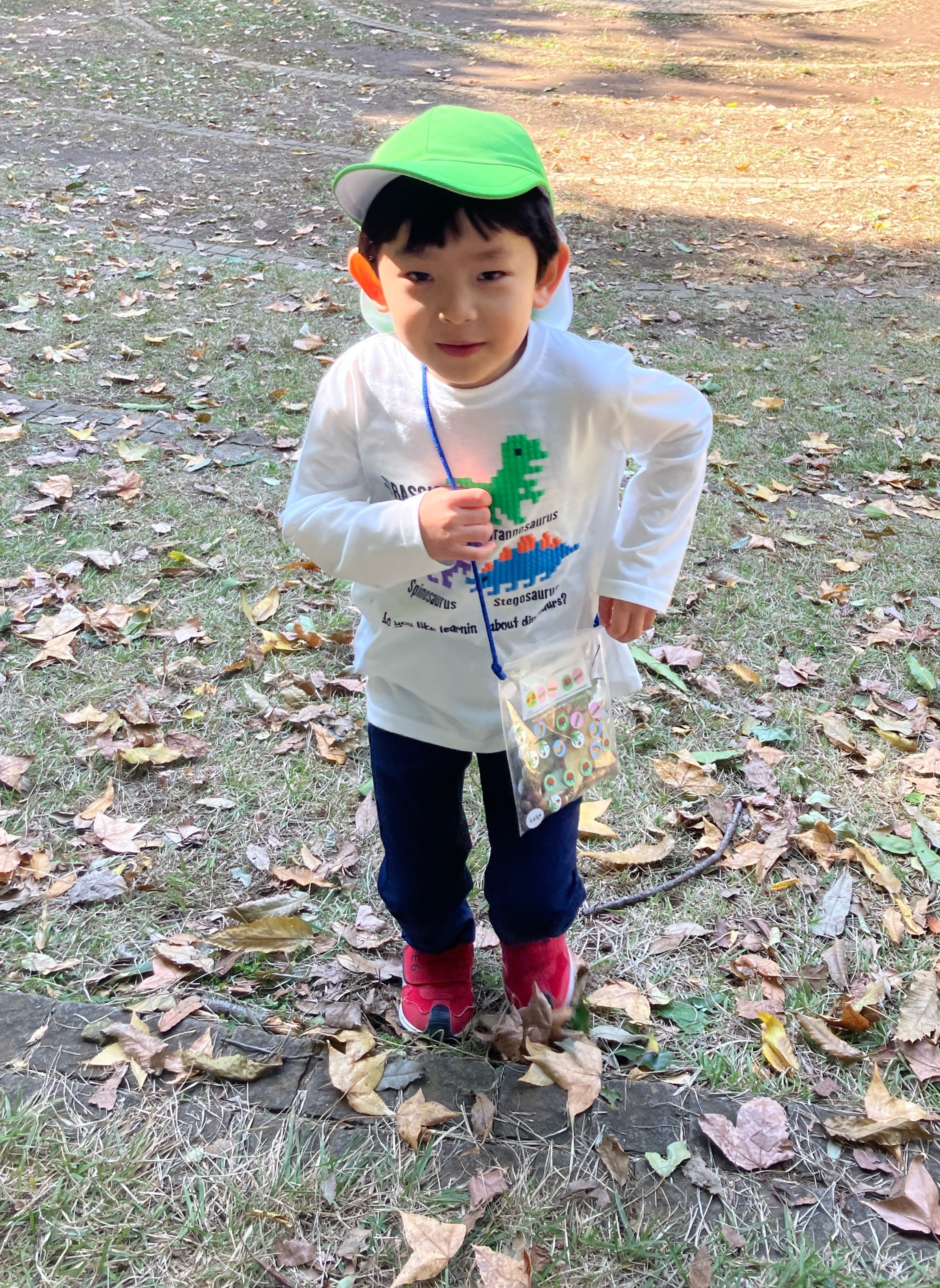 3歳児クラスは、林試の森公園でどんぐりやイチョウの葉を探し、親子で自然に親しみました。