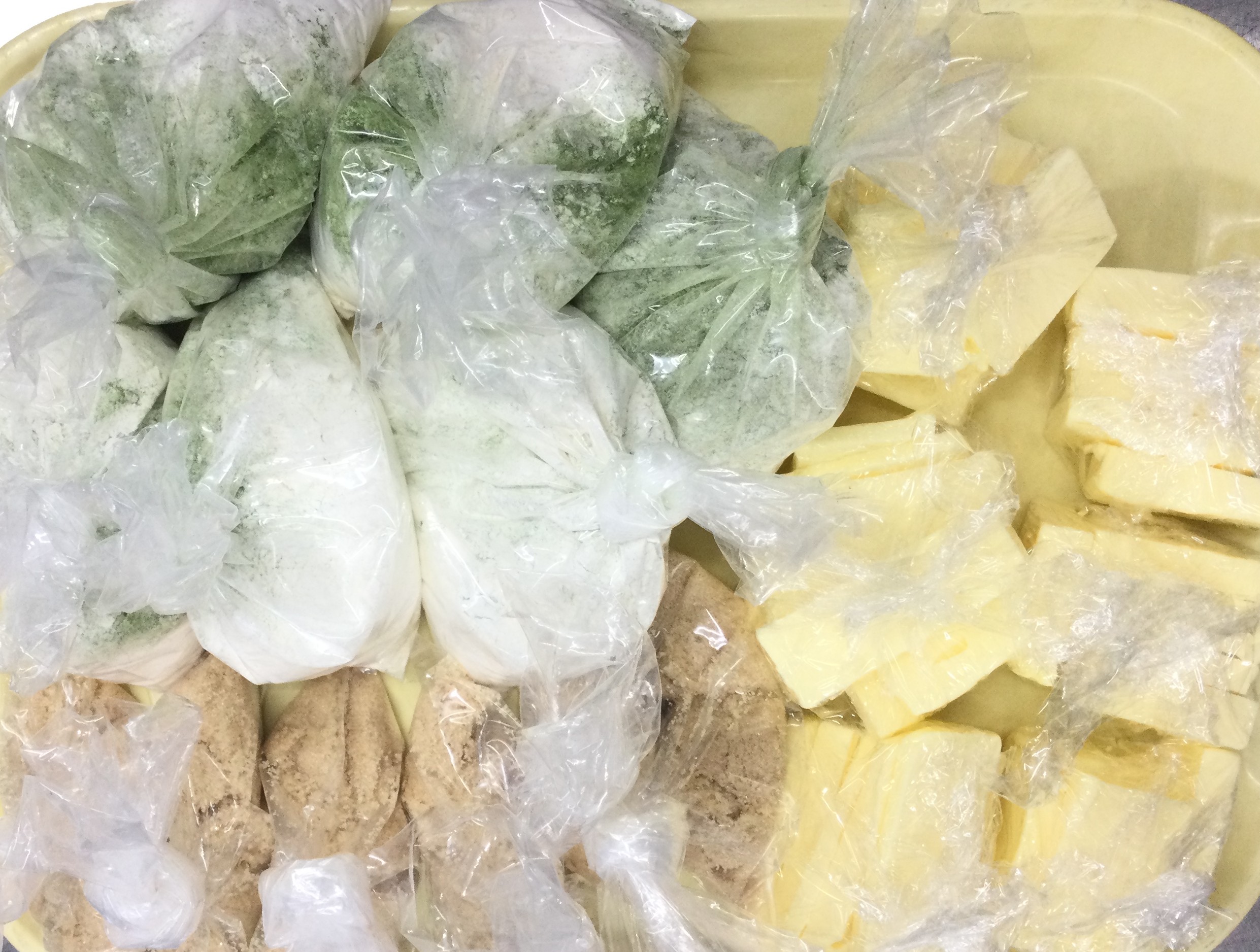 薄力粉、抹茶、バター、三温糖を使います。各テーブルに材料を配り、クッキング開始です。