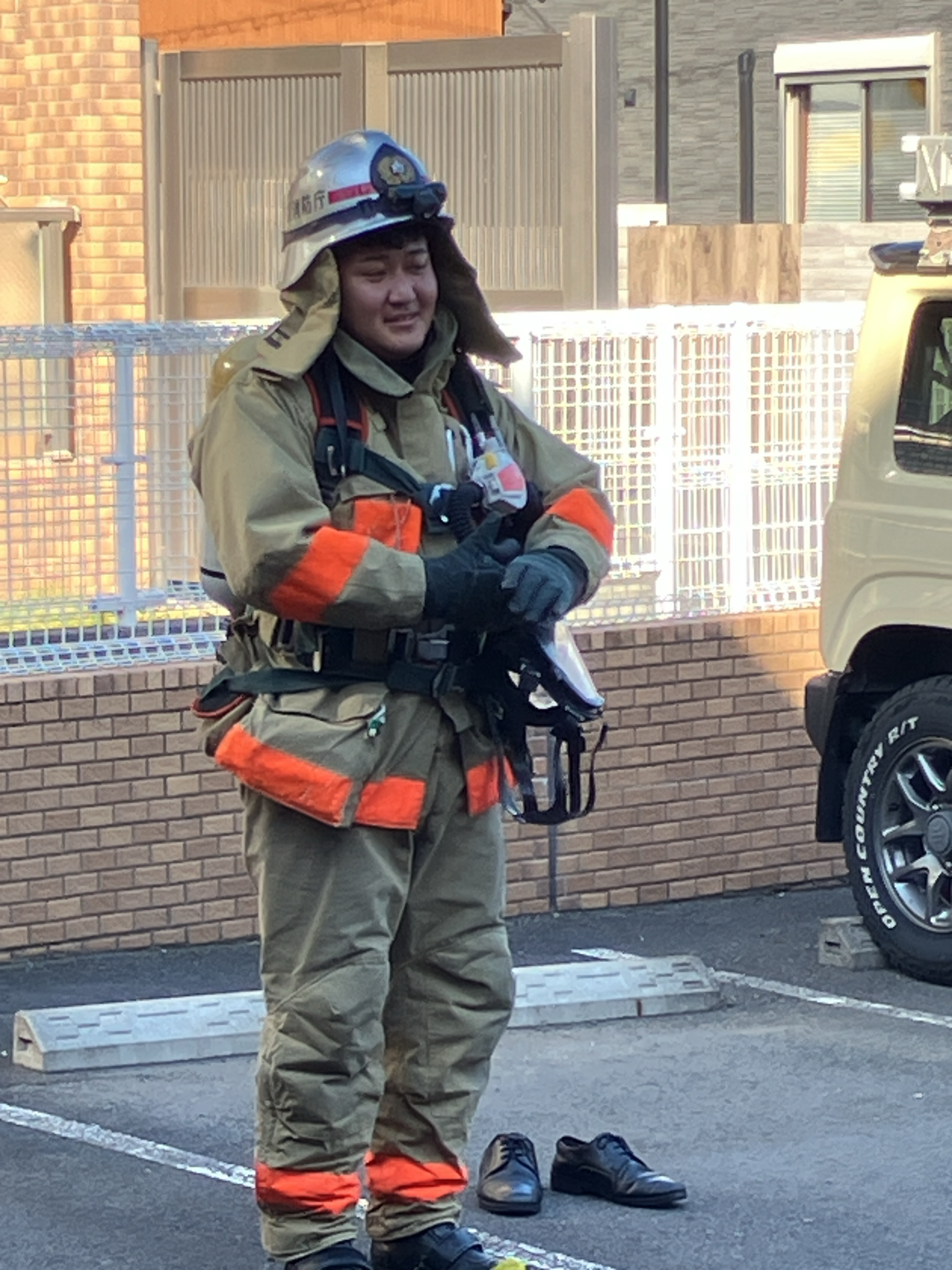 消防士さんが、通報を受けてからたくさんの装備を身につけ、