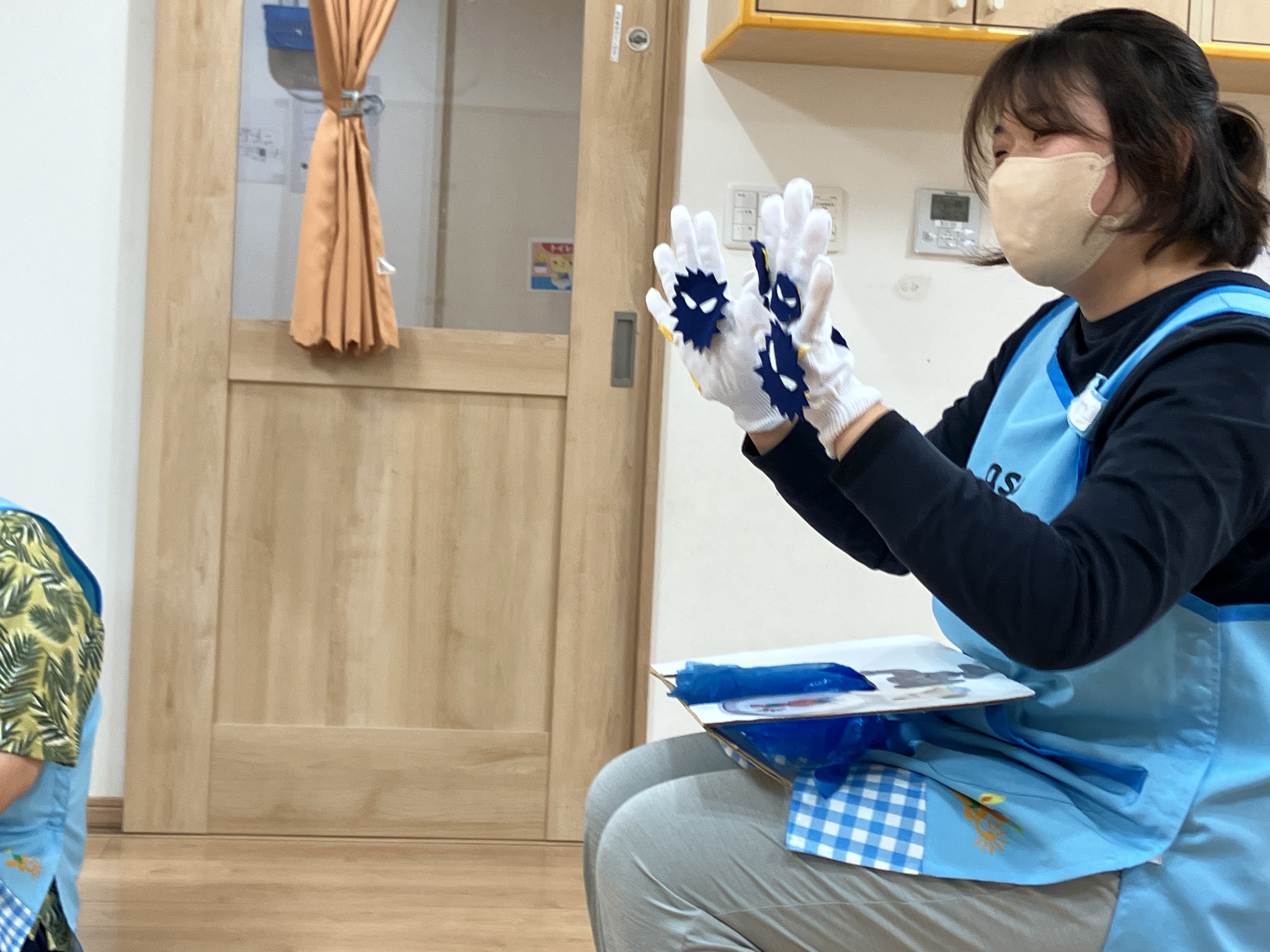 絵本の次は手袋シアターで遊んでいると手にばい菌が付いてしまうこと、