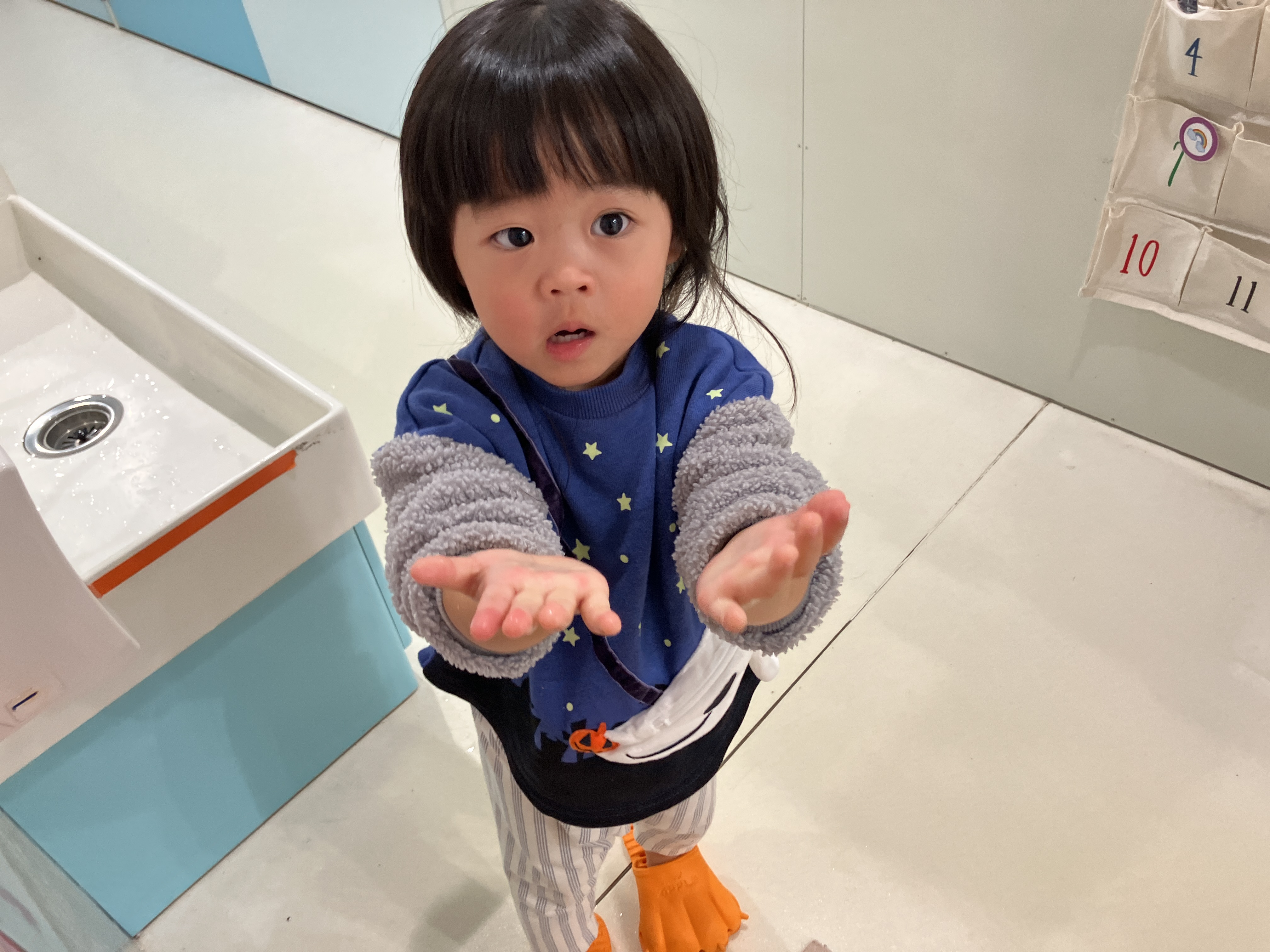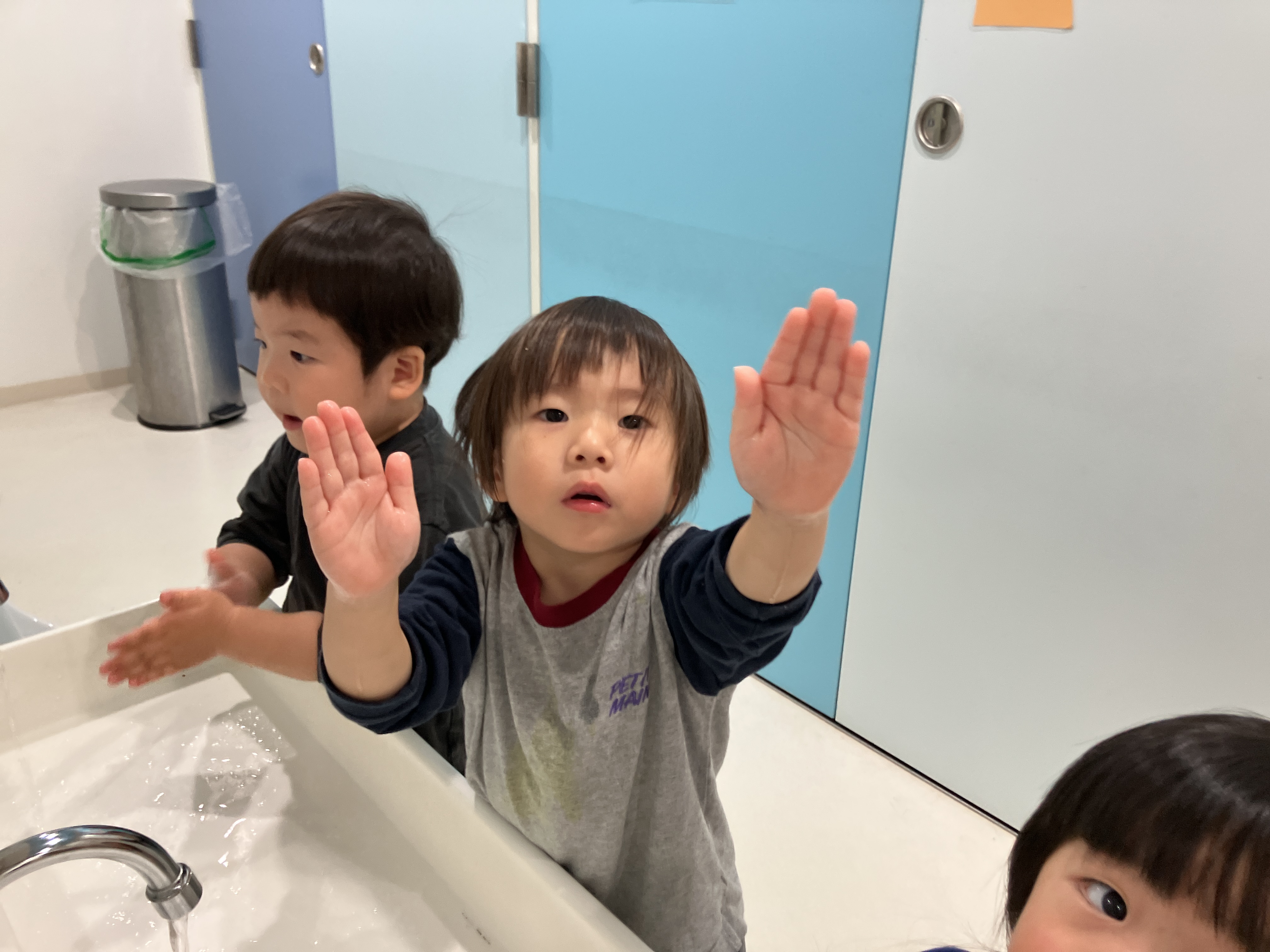 「てあらいしなくっちゃ!」と驚いた表情で教えてくれました。