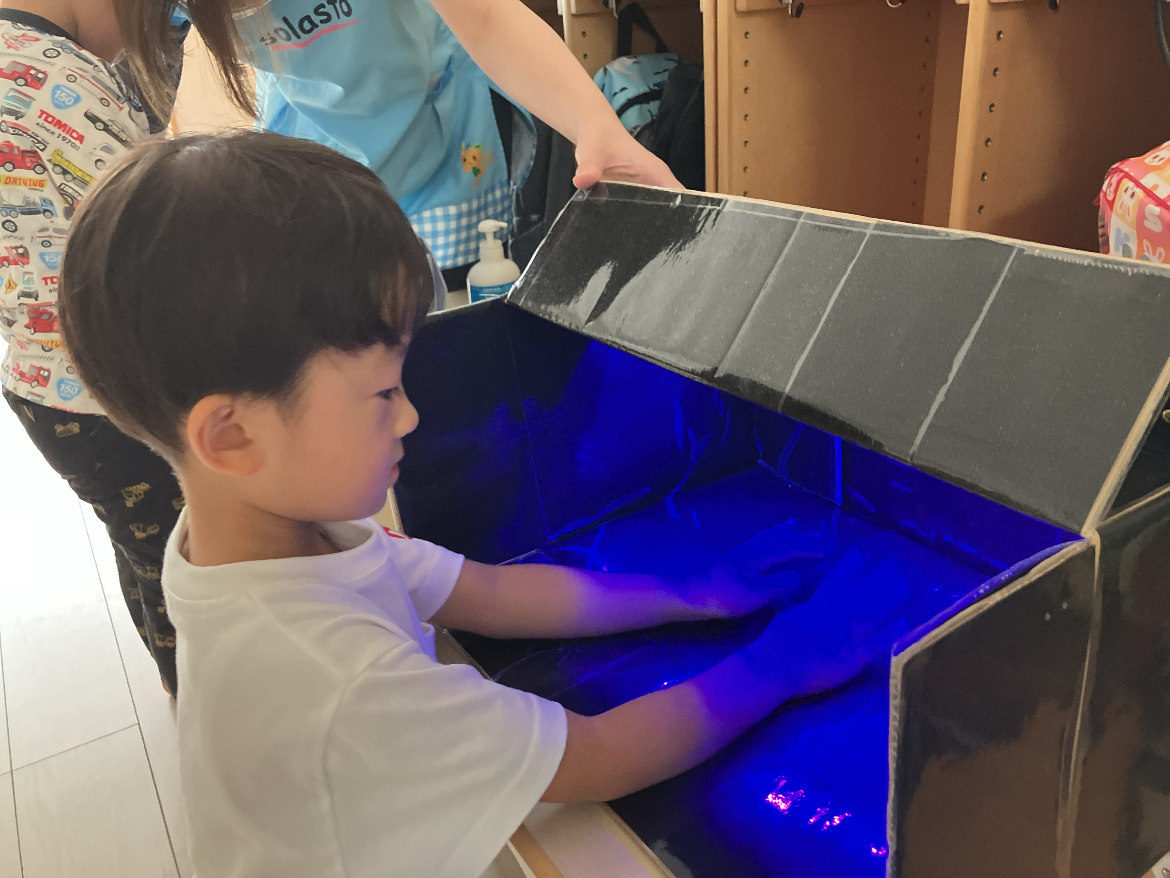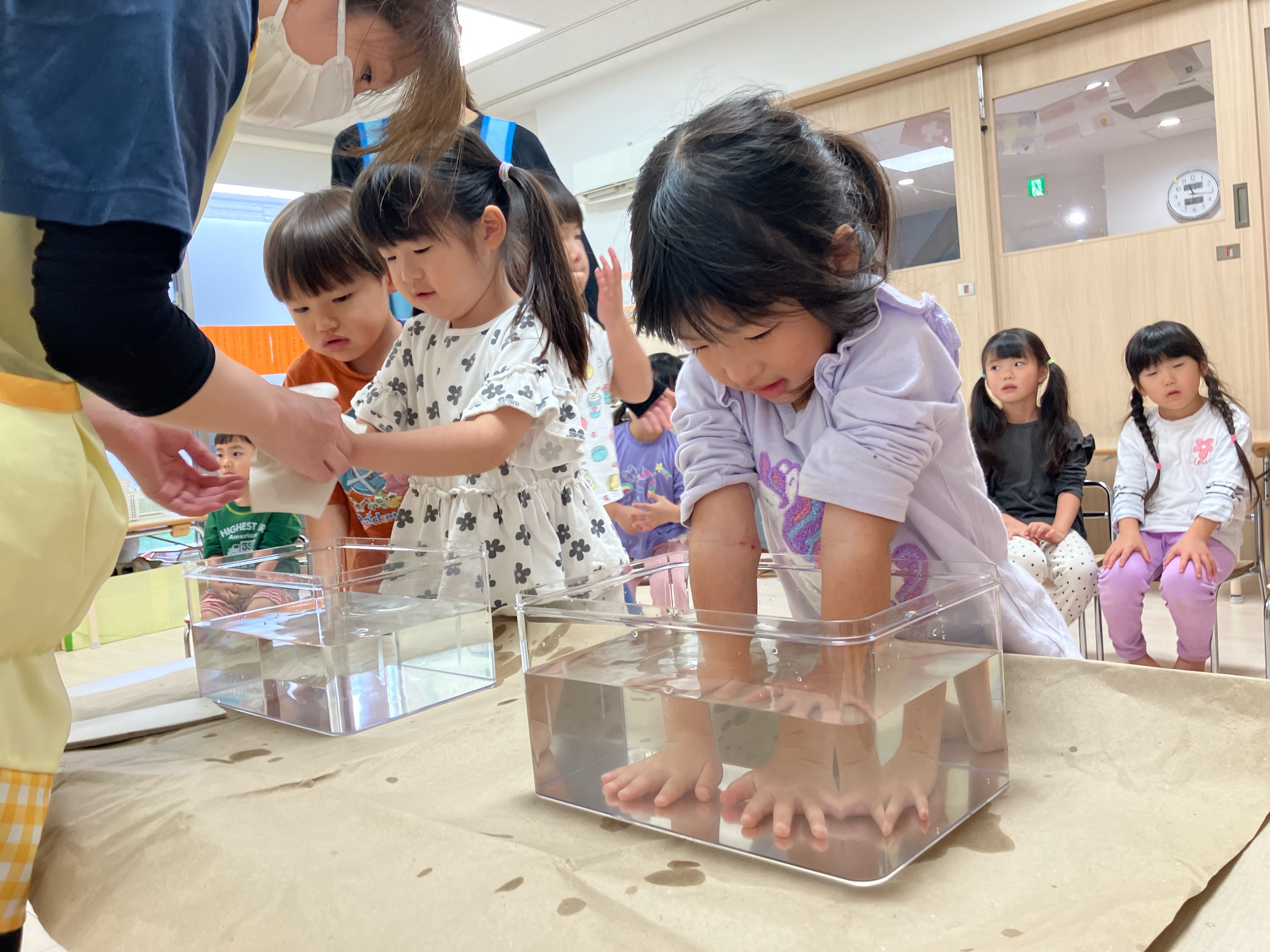 1歳児めばえぐみのみんなに手のばいきんを見せると