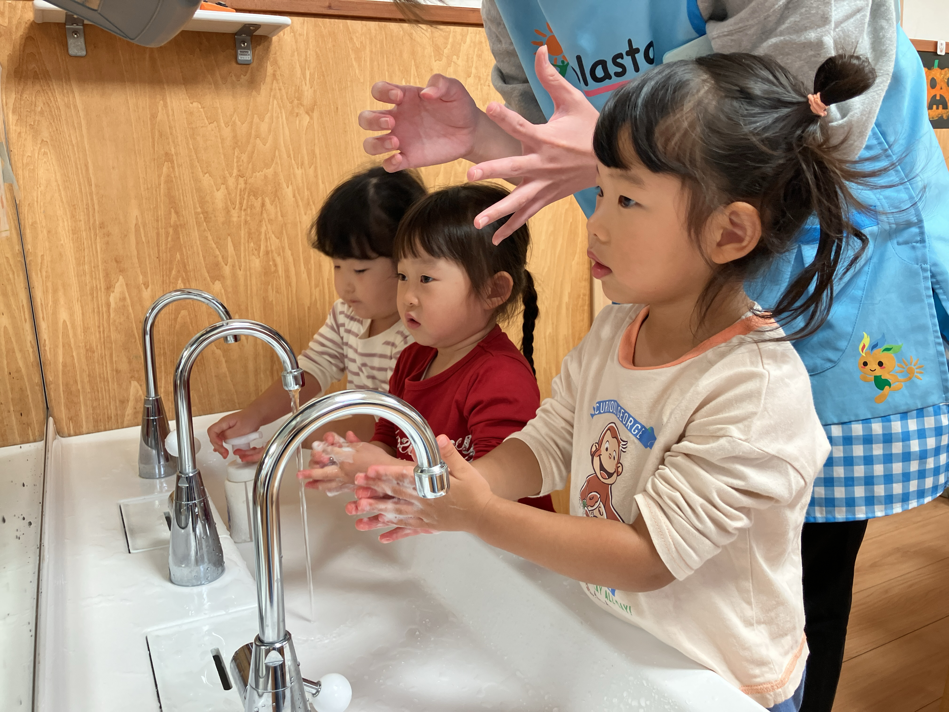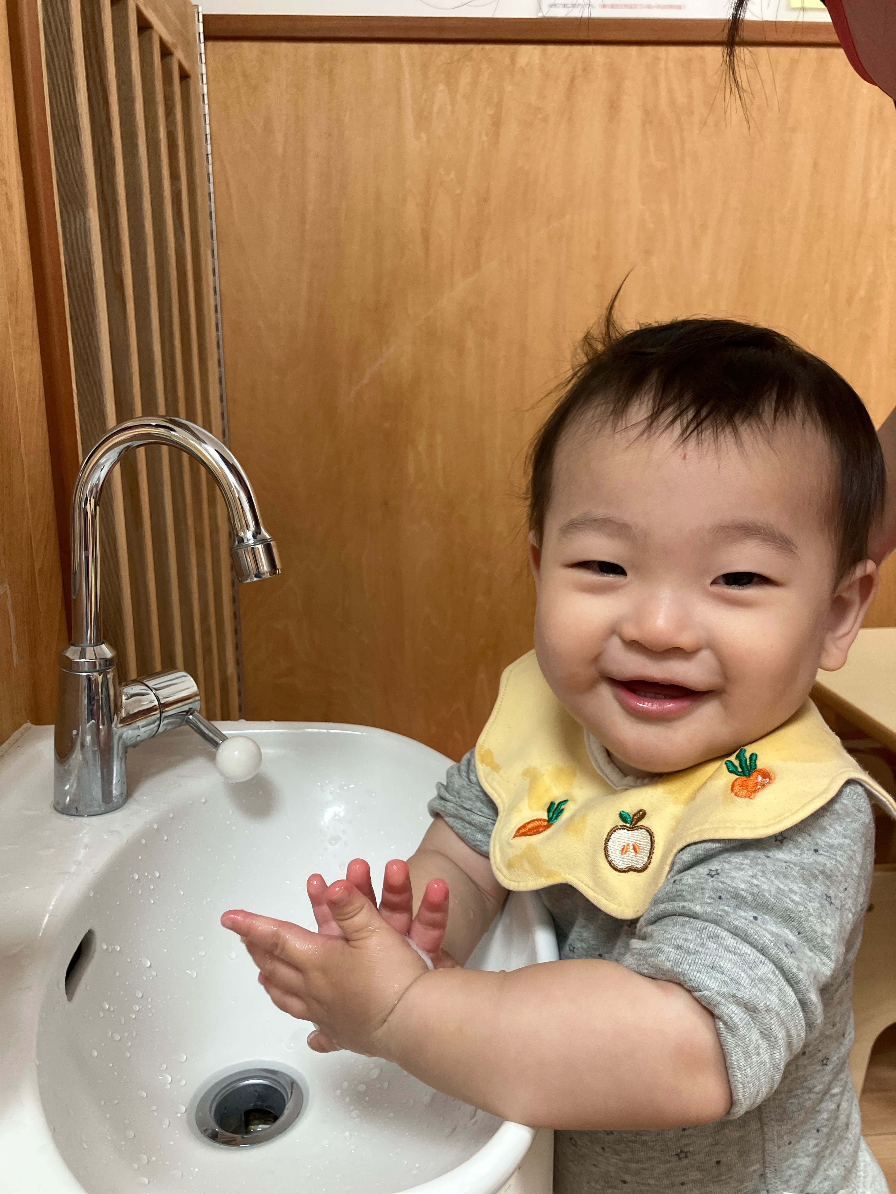 0歳児ひかりぐみも保育者と一緒に手洗いをしています。