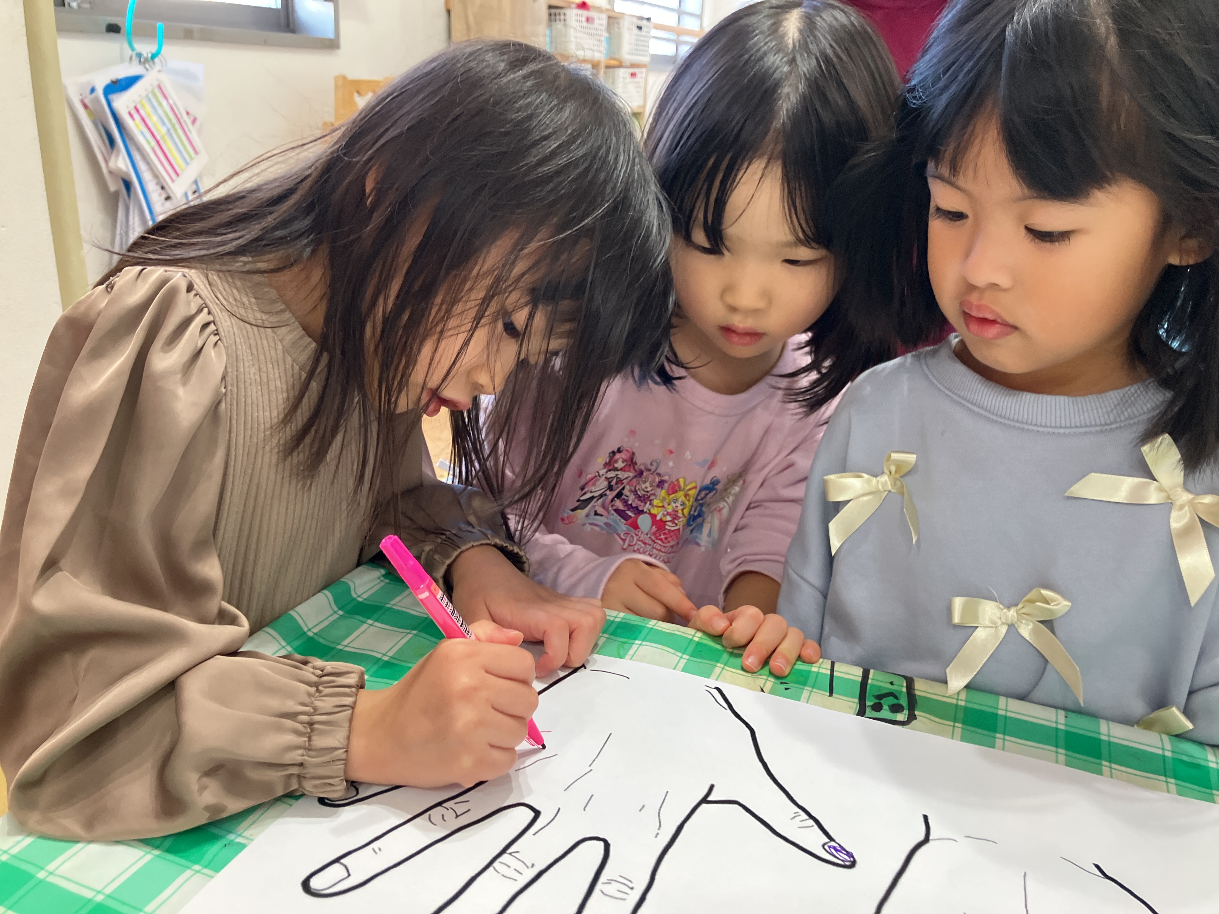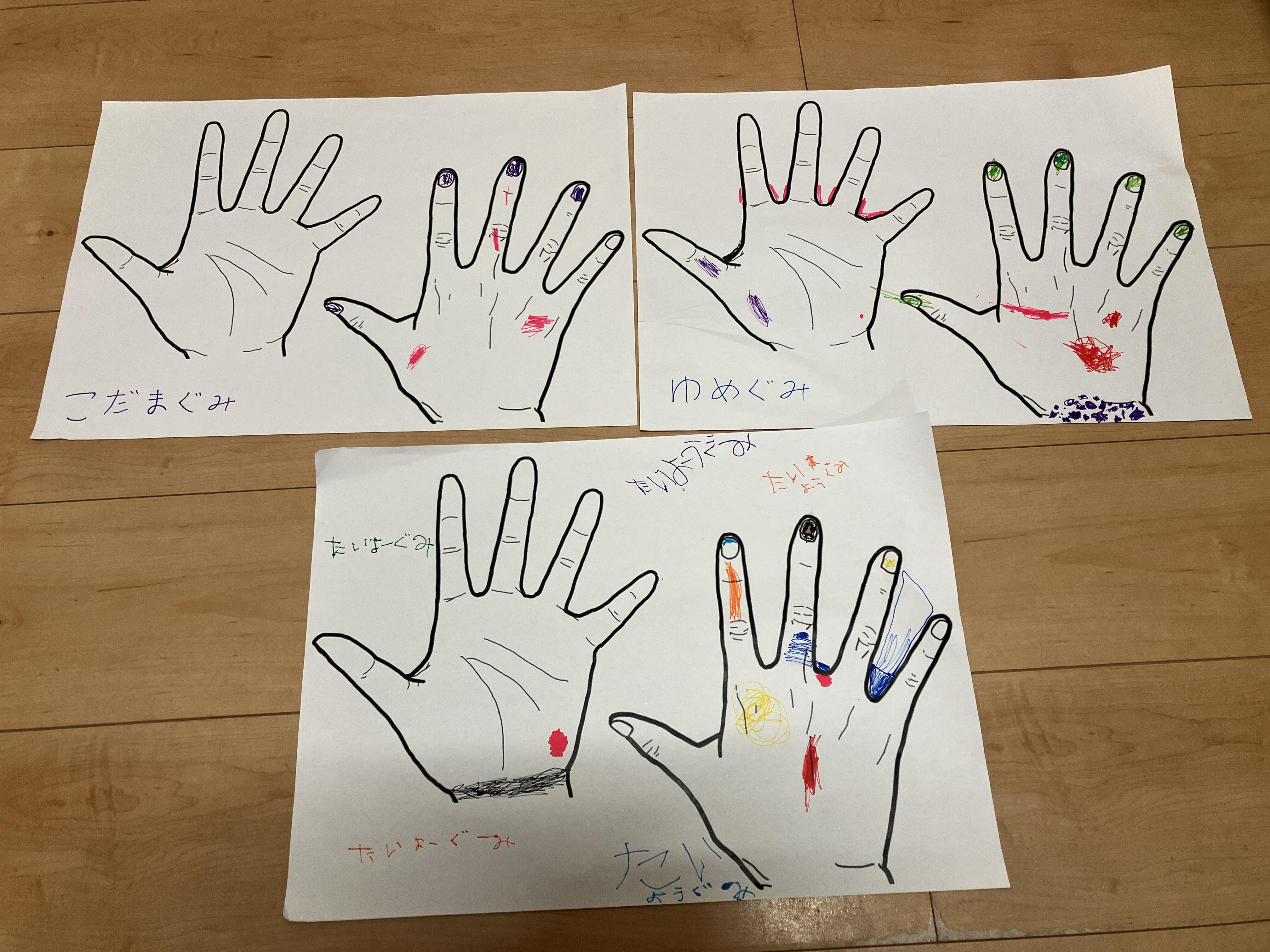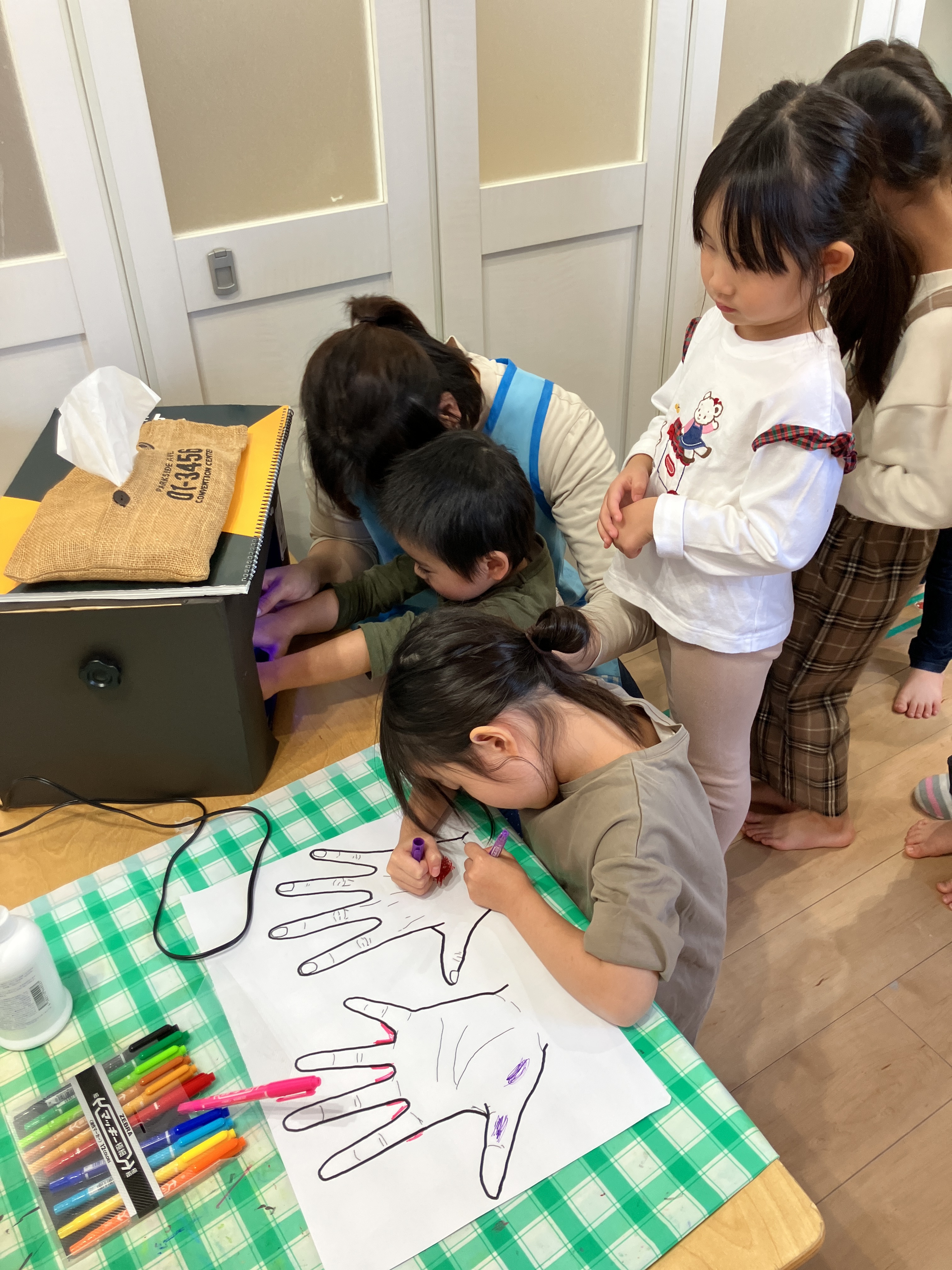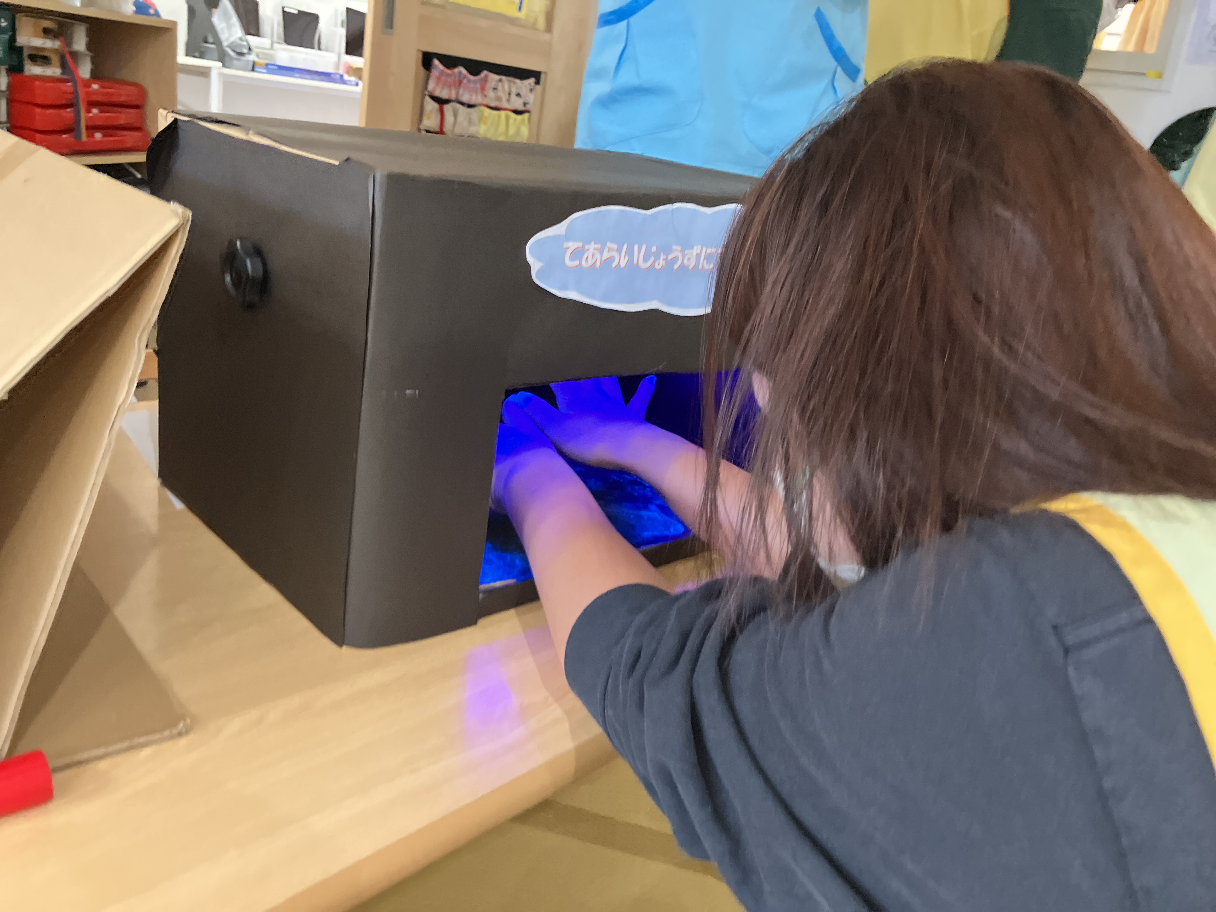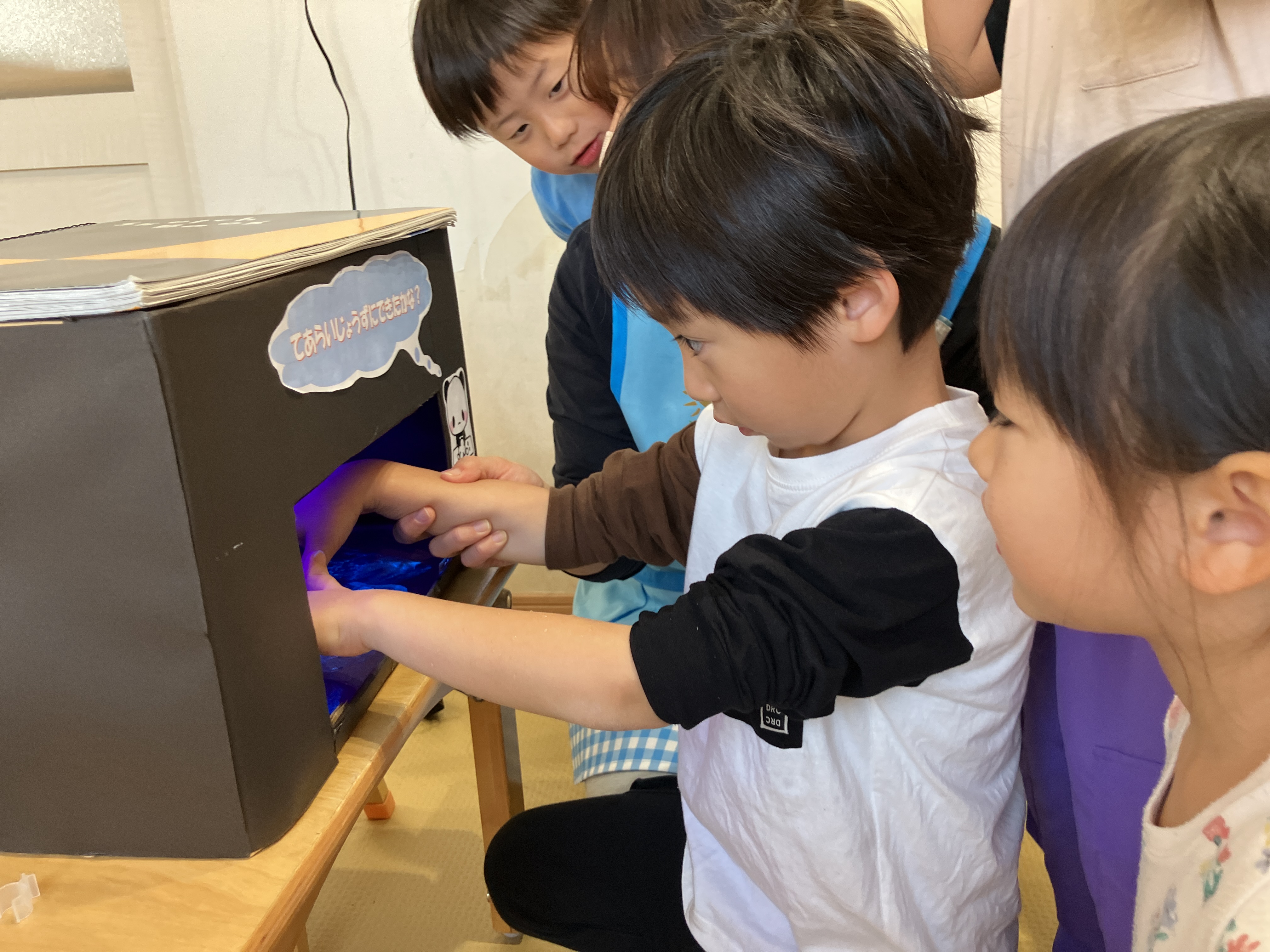 洗い残しをブラックライトで確認し、手形の紙に書いてもらいました!