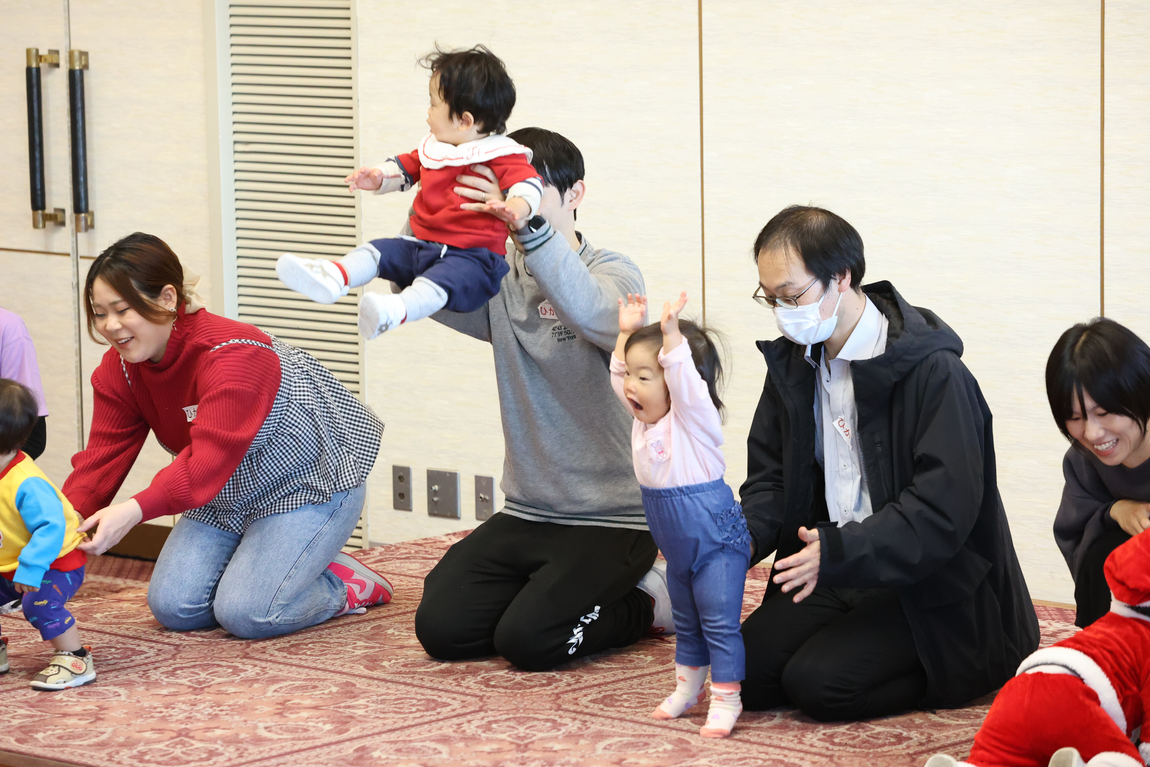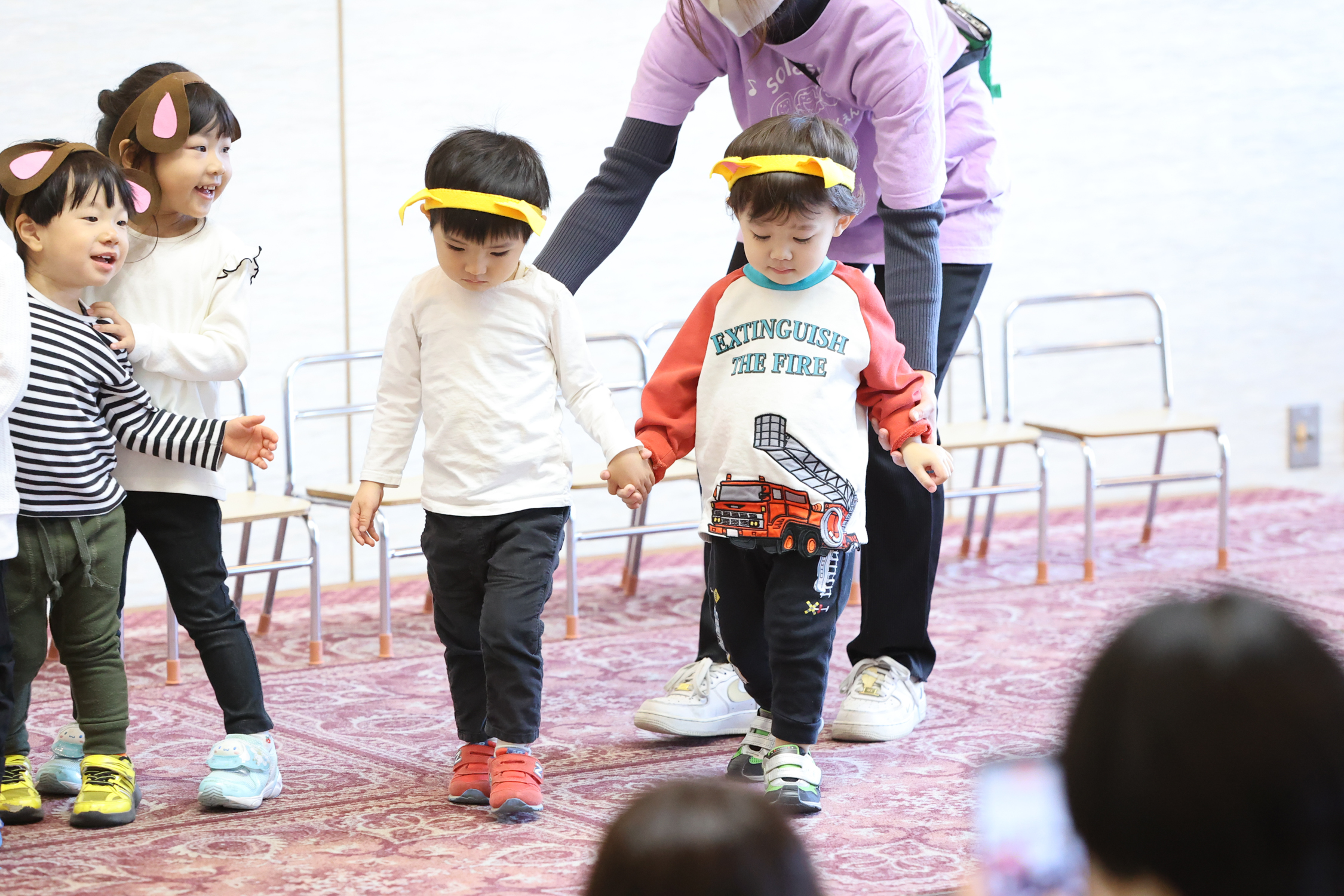 1歳児めばえ組は「さんぽ」の音楽で入場し、「ベイビー