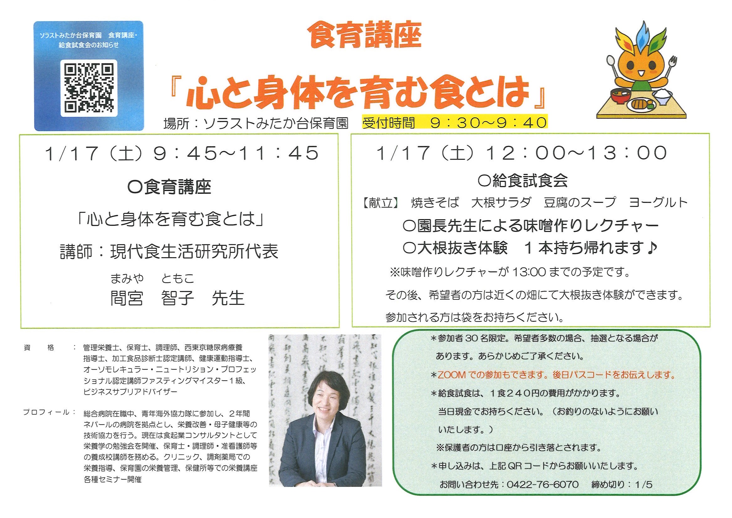 ソラストみたか台保育園☆食育講座「心と身体を育む食とは」と給食試食会のお知らせ