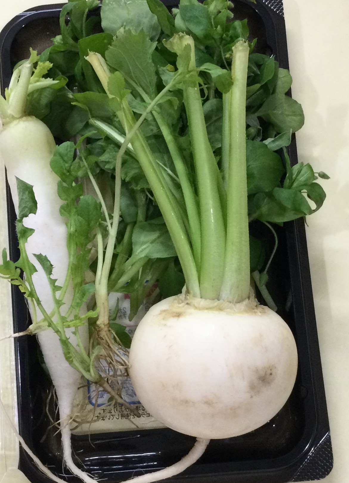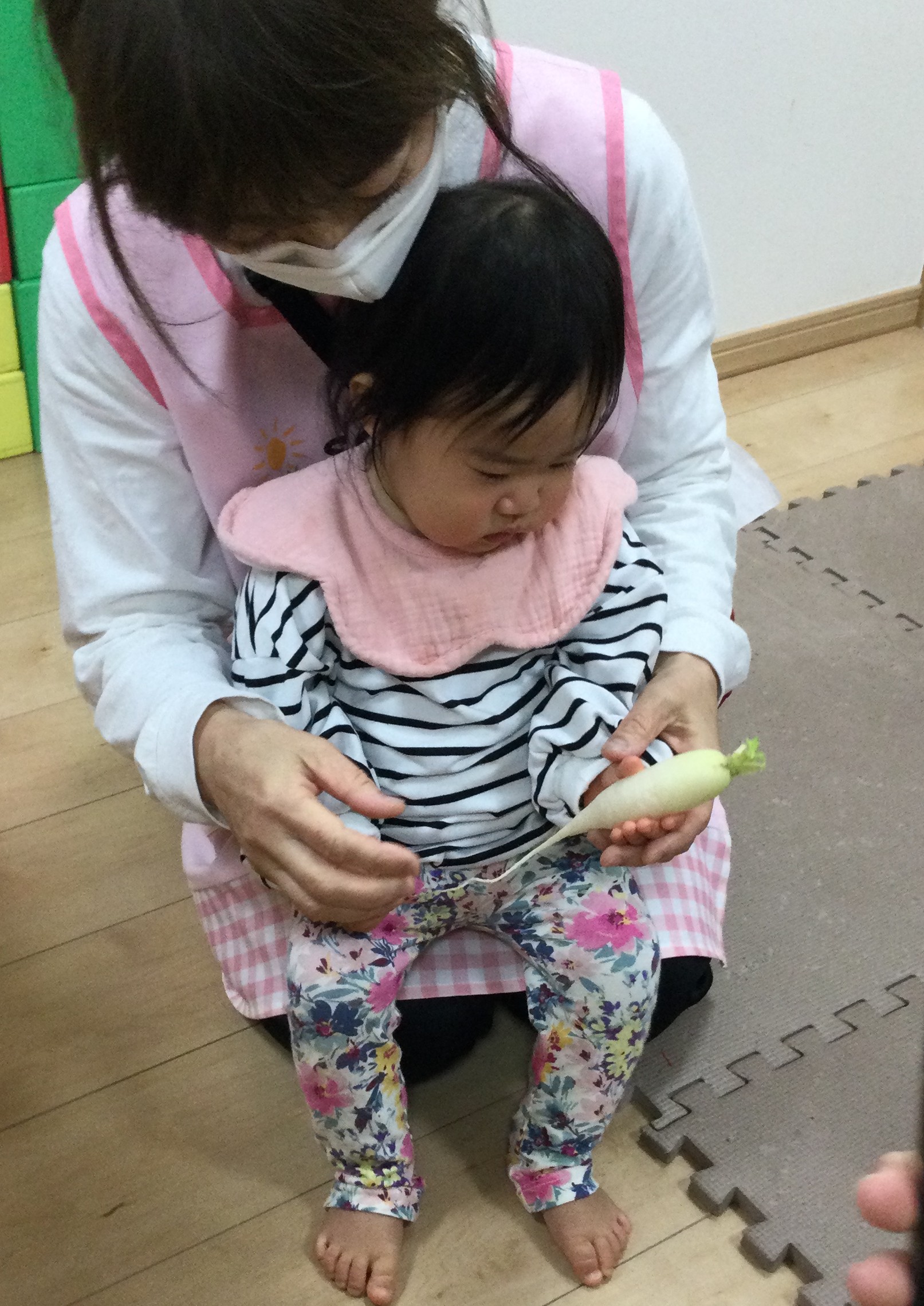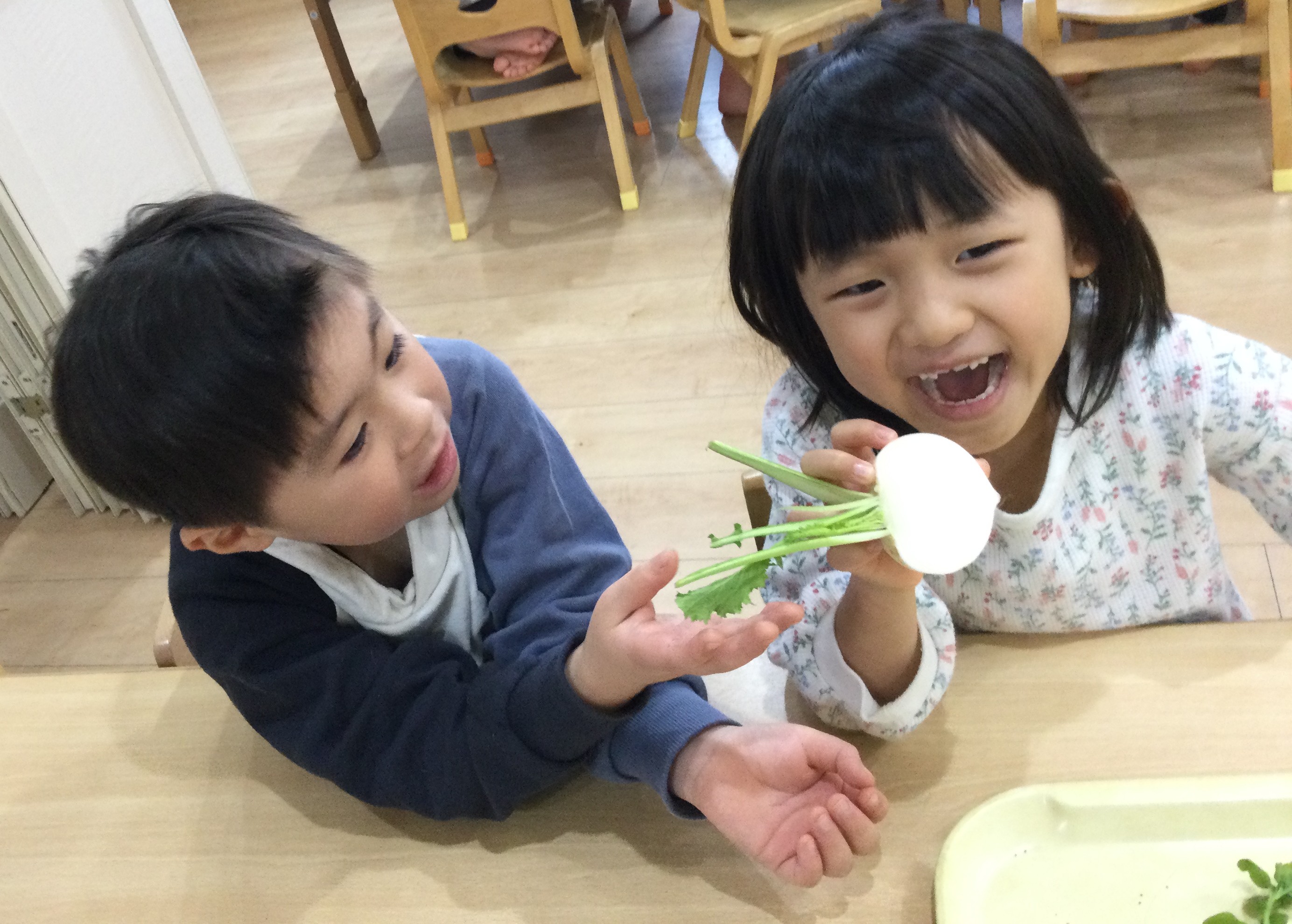 「みて、みて」 「これはすずしろだよ!小さい大根で可愛いね♡」