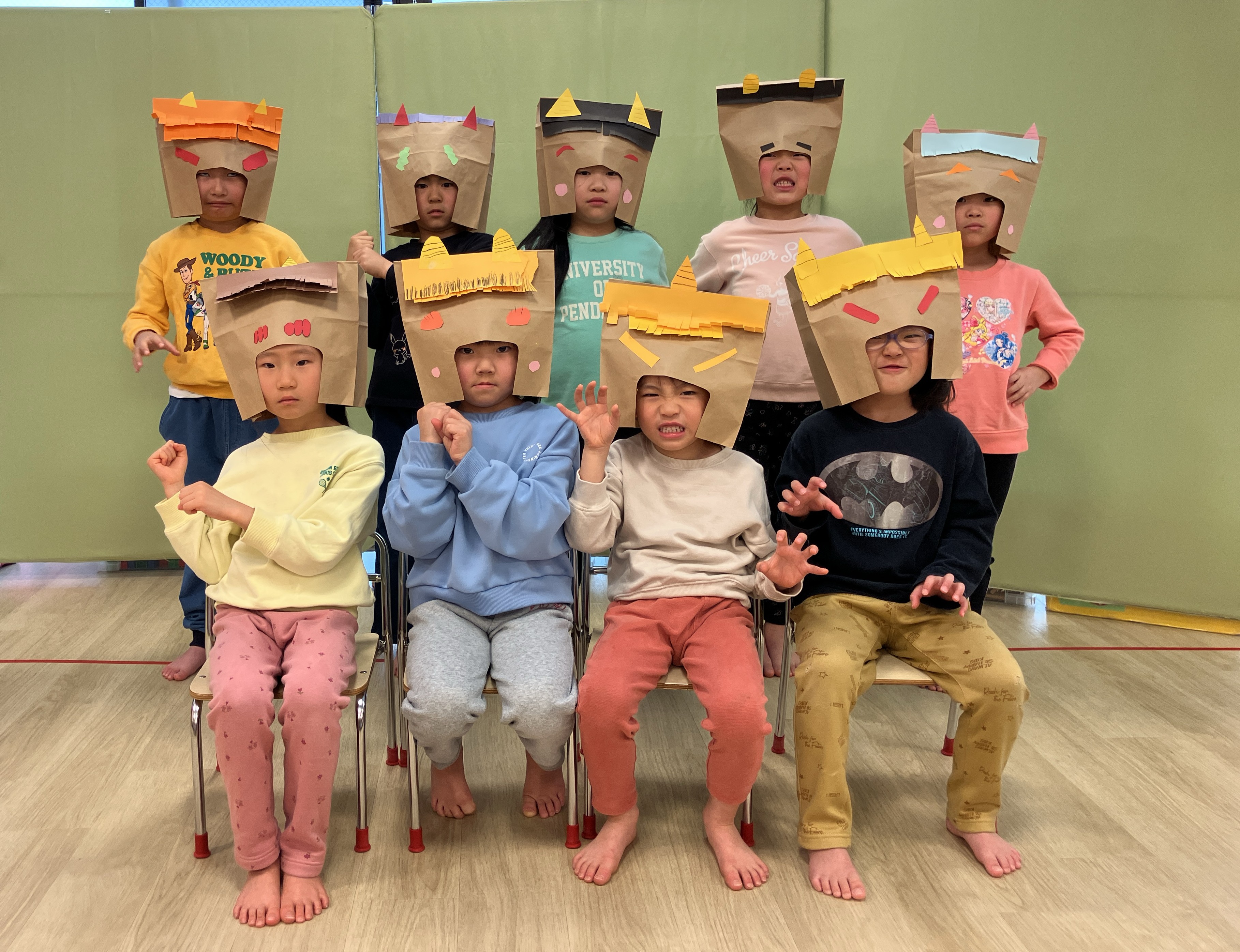 次にクラスで作った鬼のかぶり物を紹介しました。各クラス2名ずつ