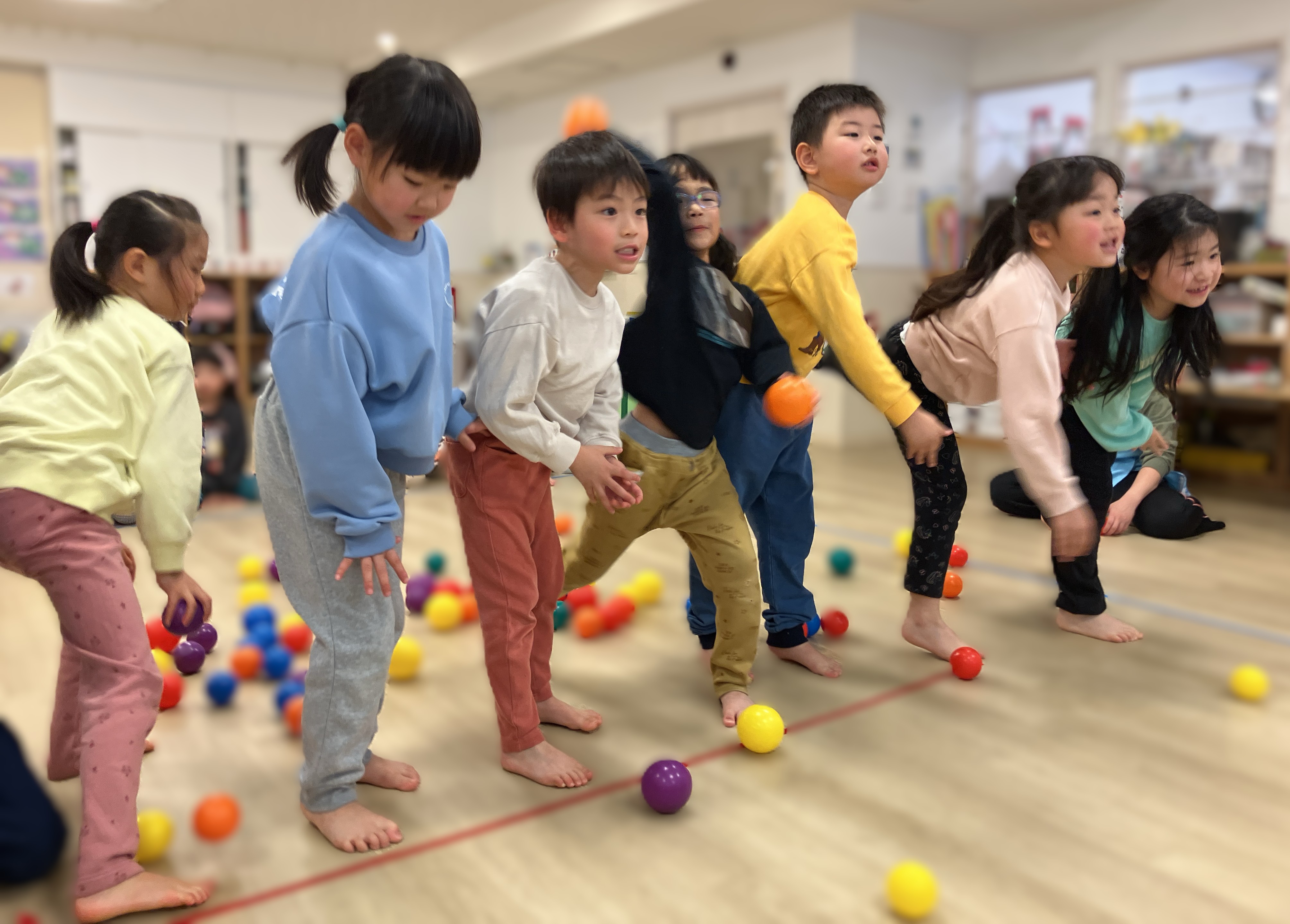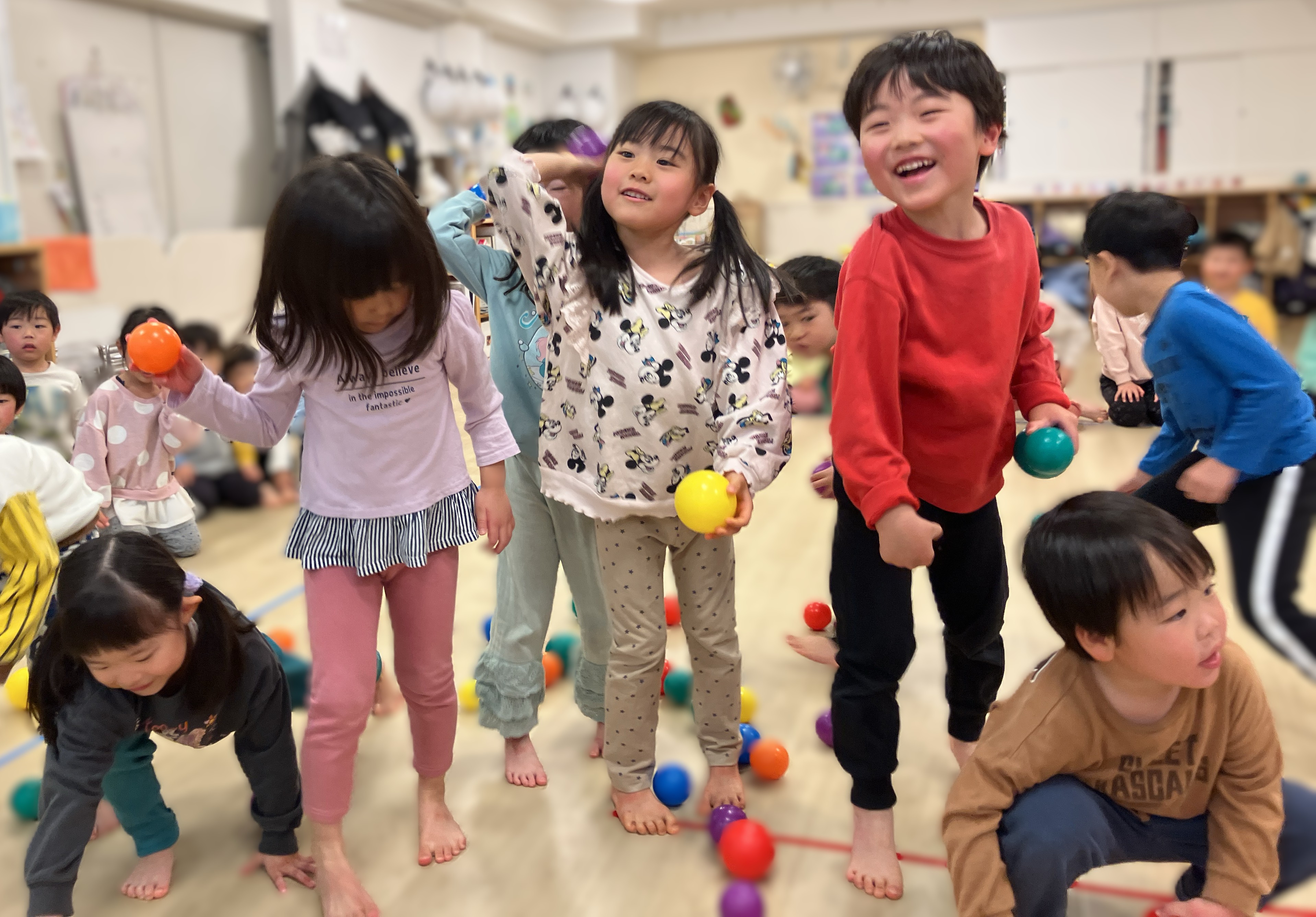 最後に豆まきゲームをしました。ルールは簡単。カラーボールを