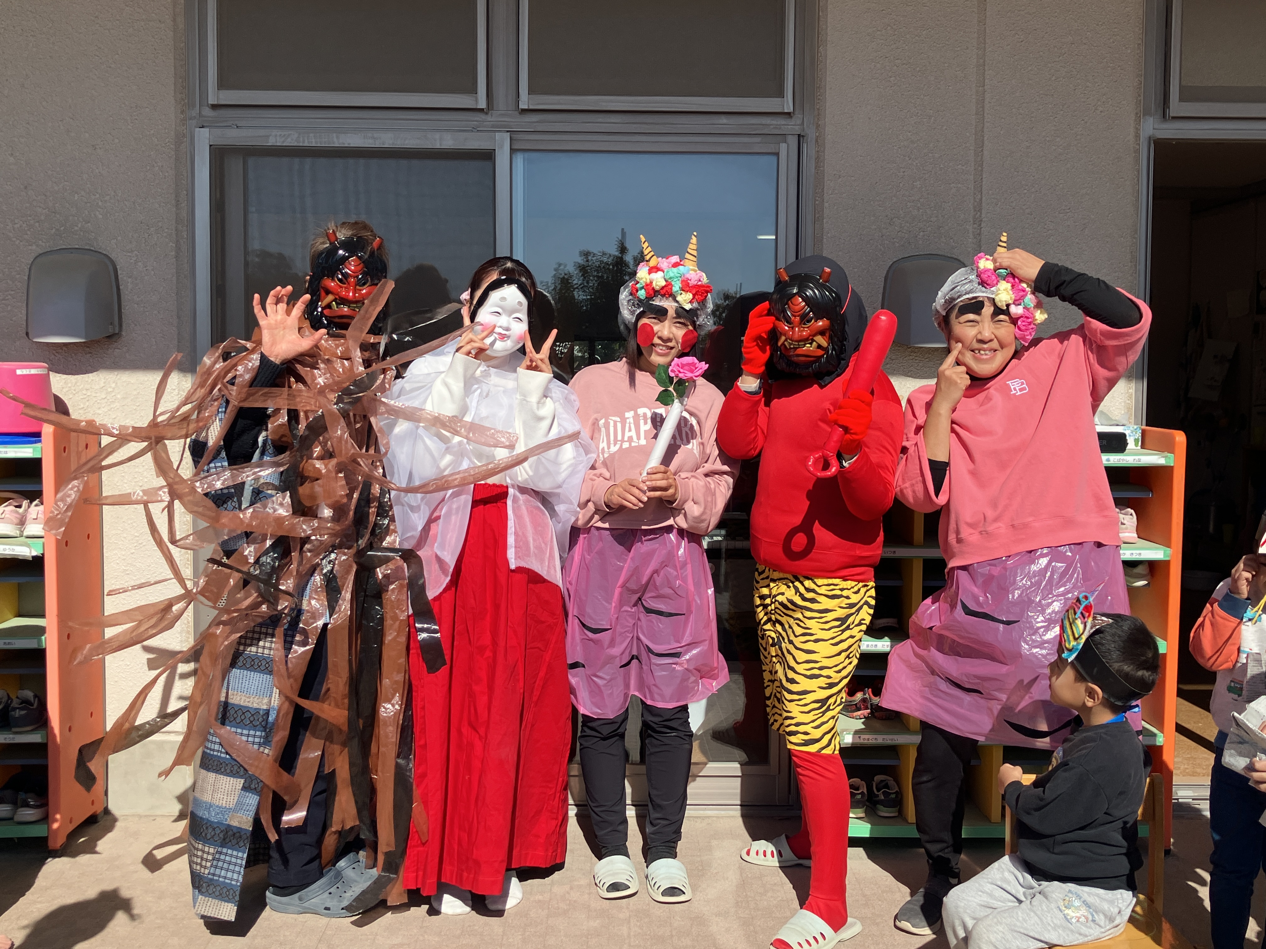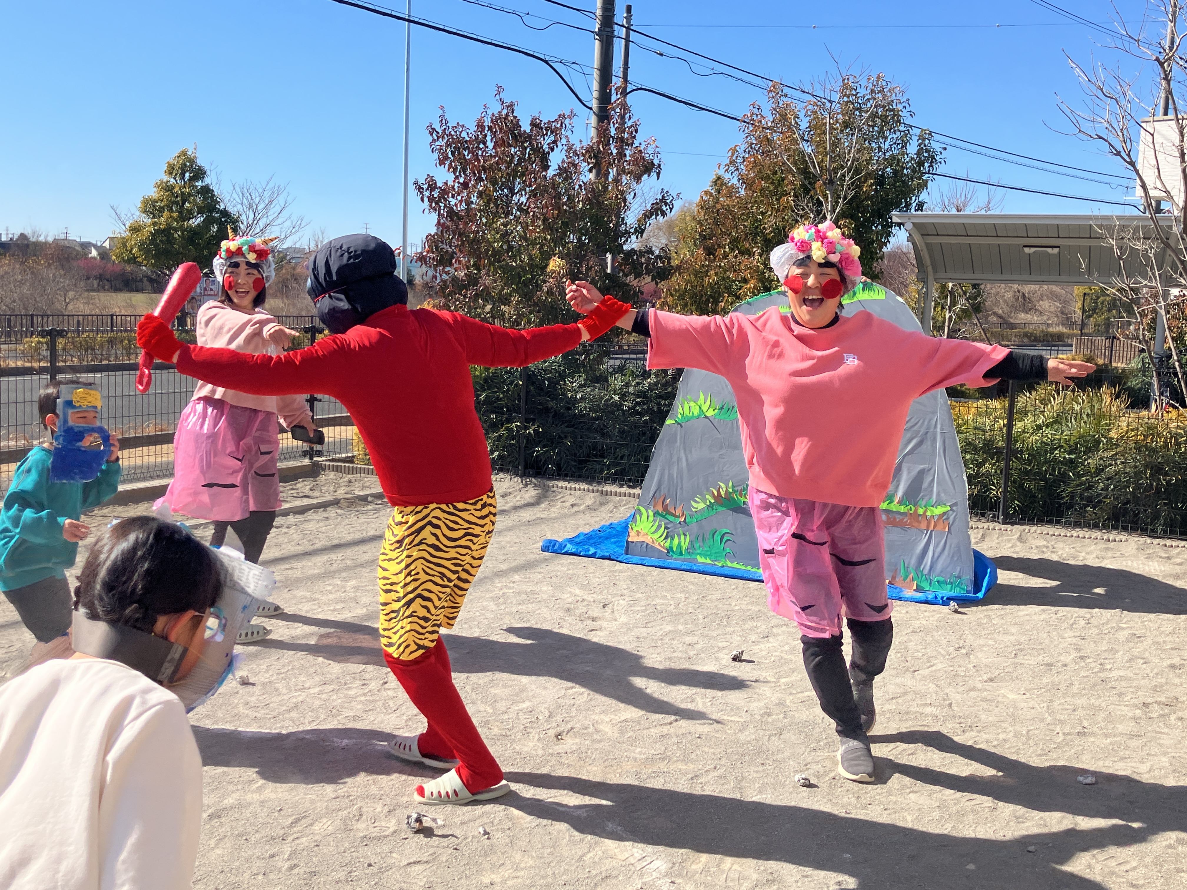 職員がかわいい鬼に扮し、子どもたちが喜んで鬼退治をしました。