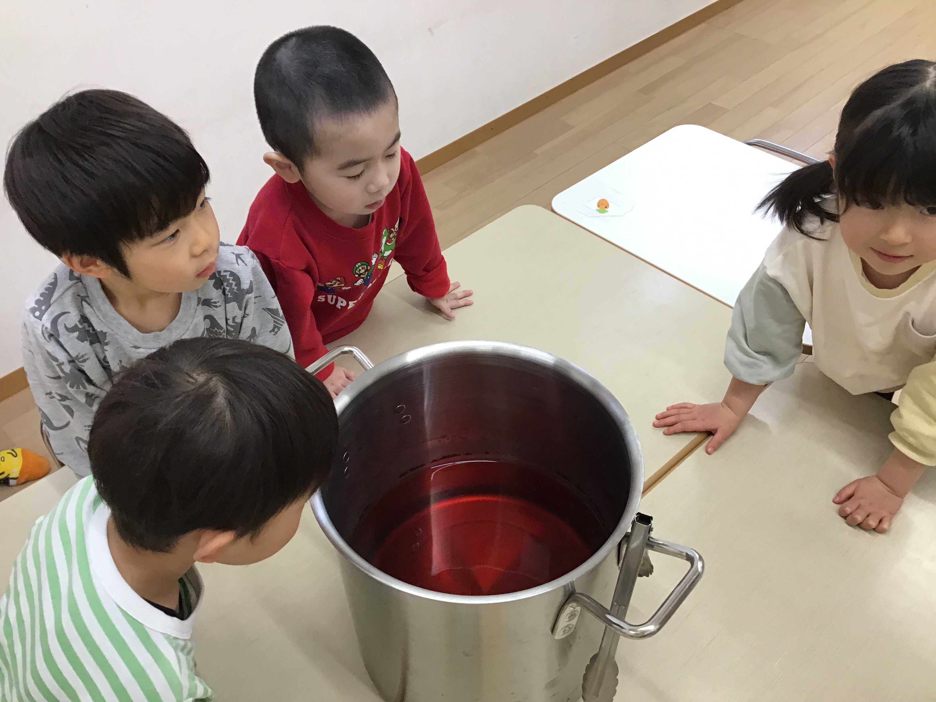 食育用の鍋の玉ねぎ液みると「玉ねぎなのに赤に見えるね!」と不思議そうなこだま組さんでした。