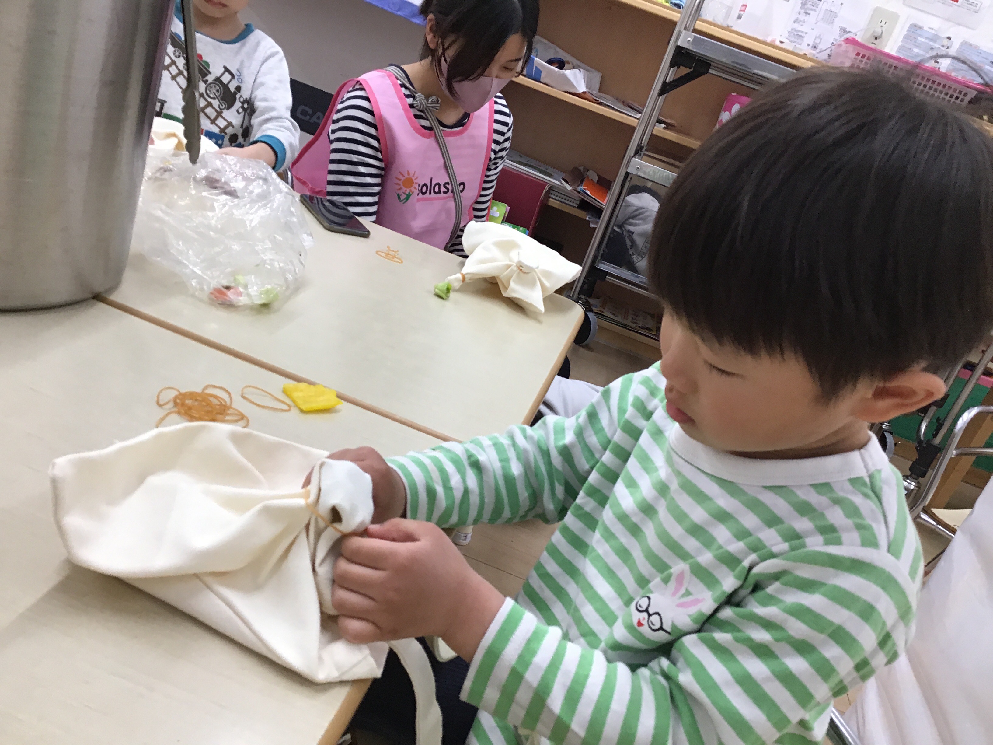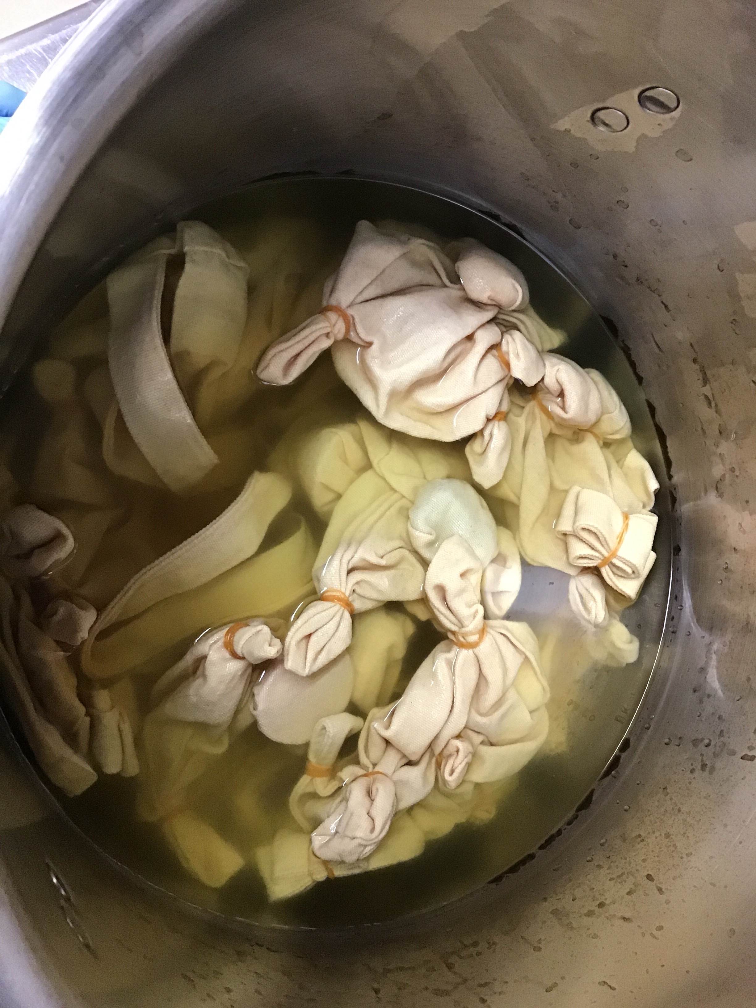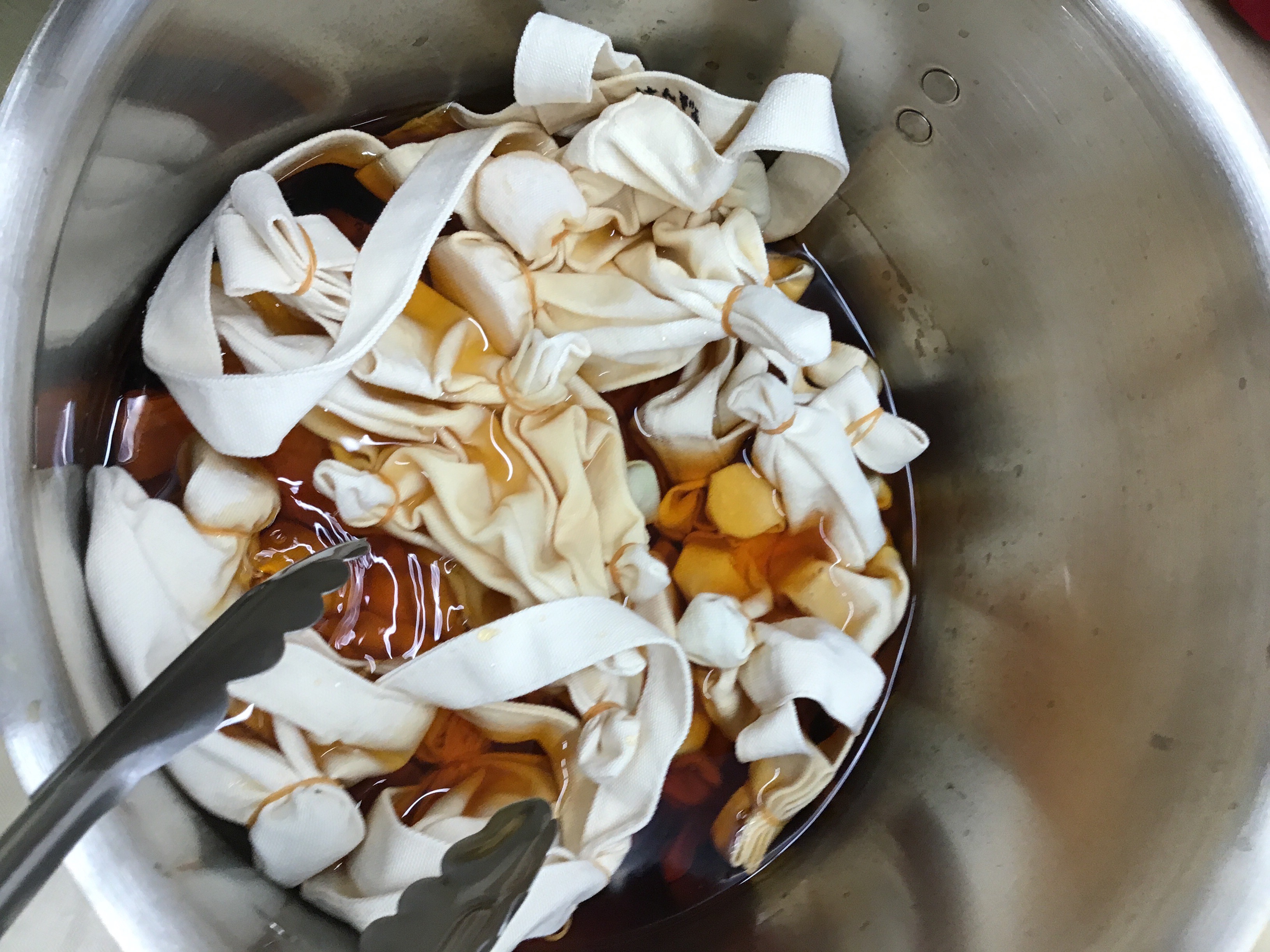 玉ねぎ液に絞ったバックを入れて染めます。完成が楽しみですね。