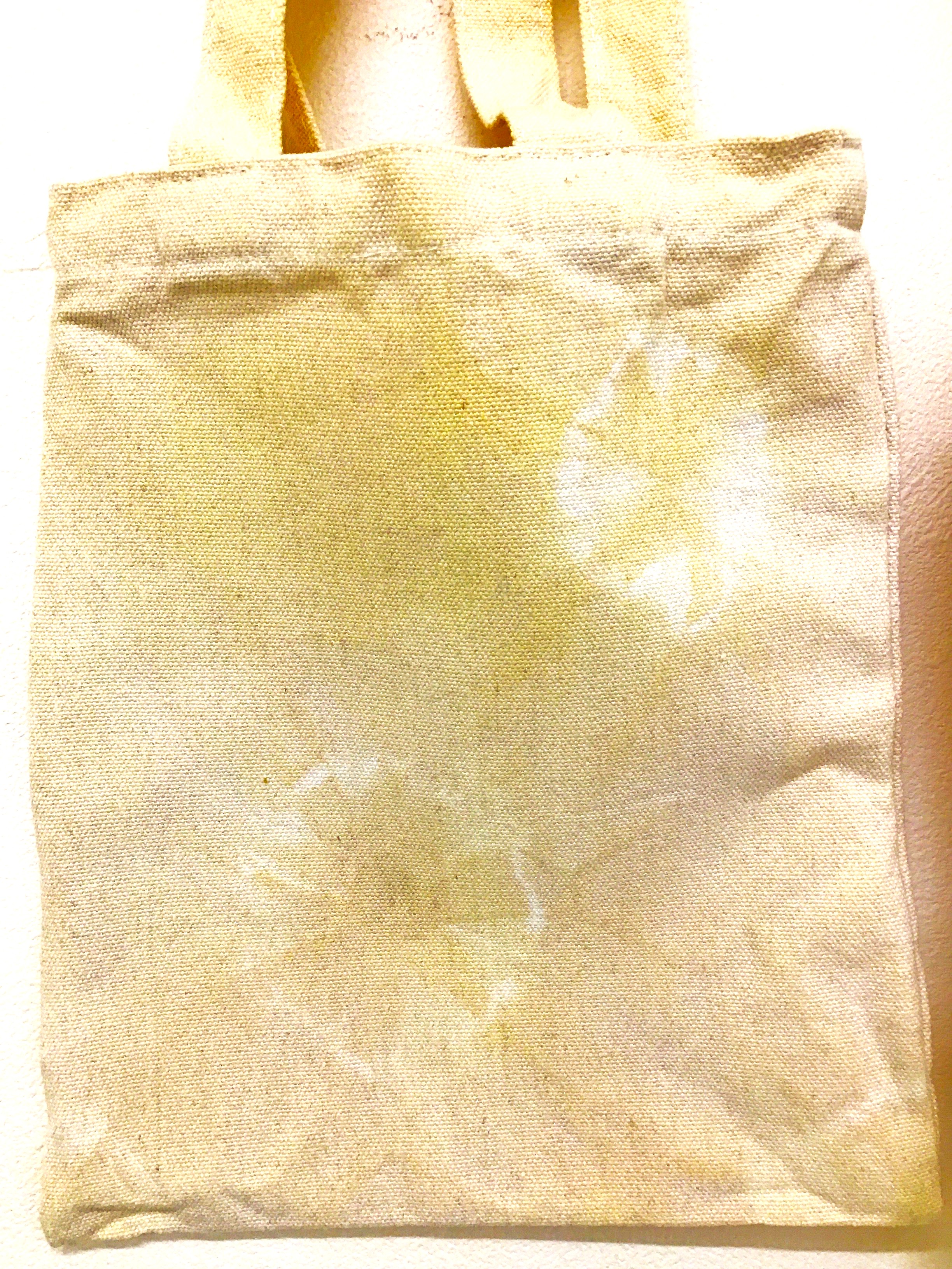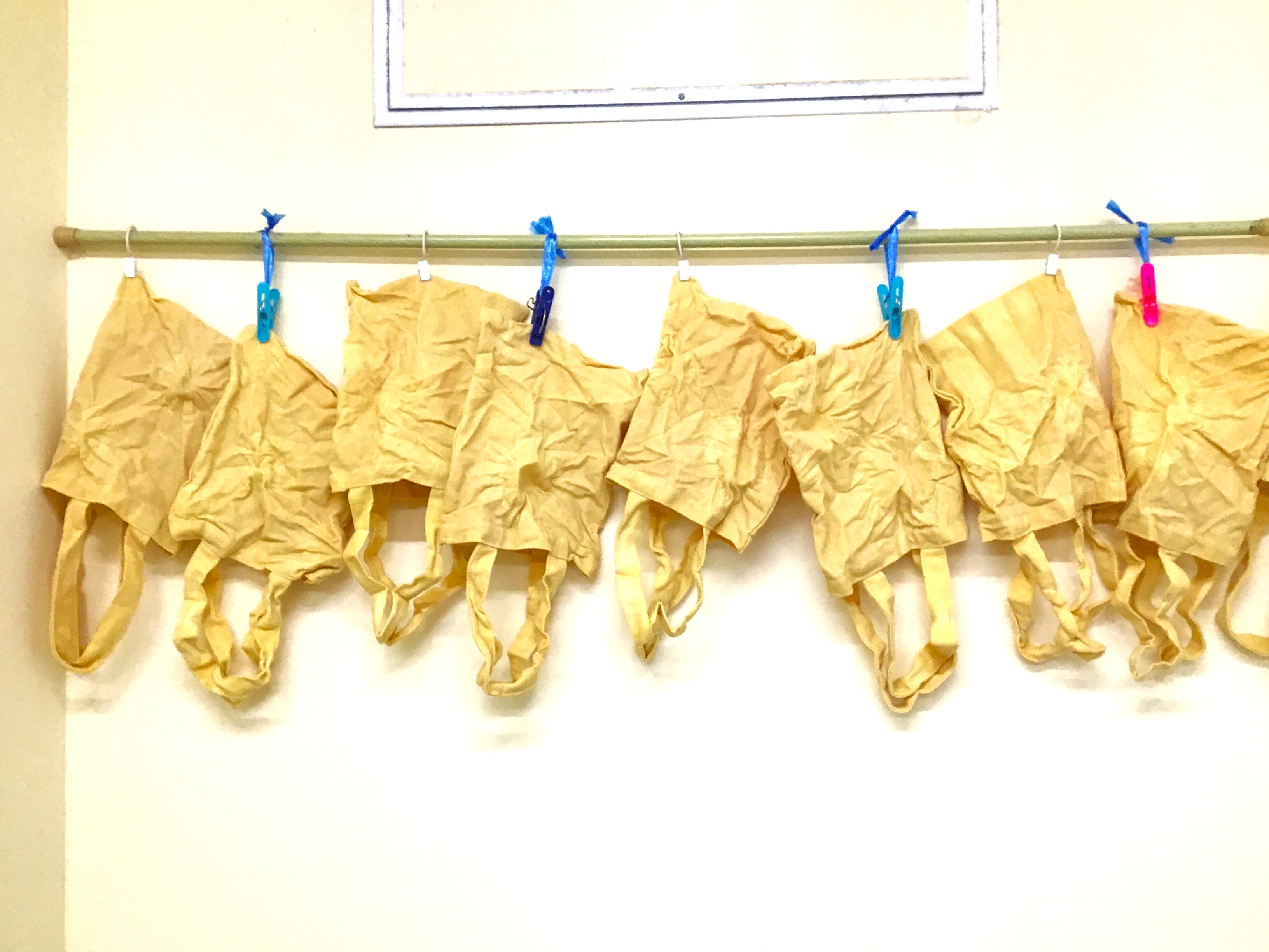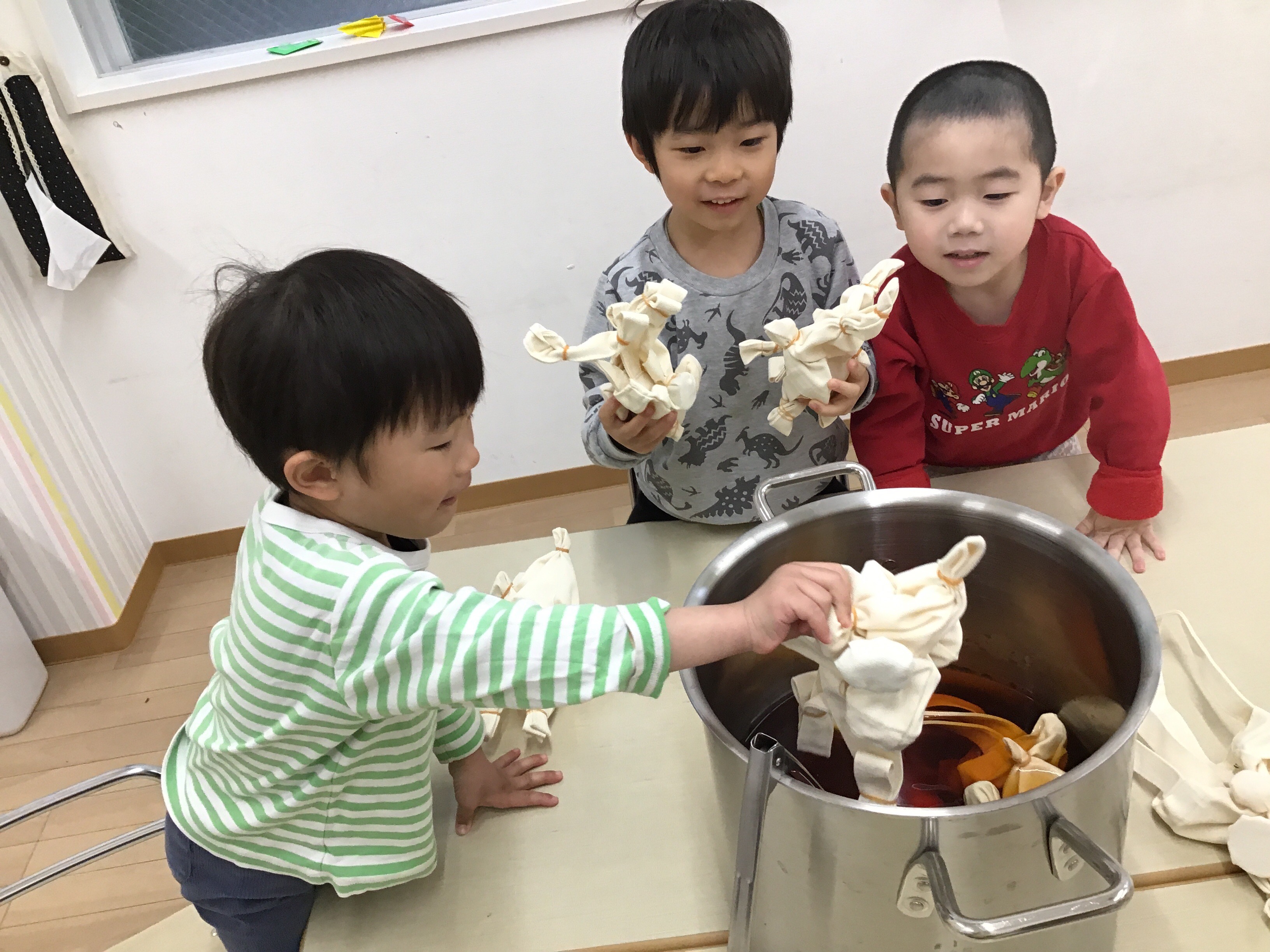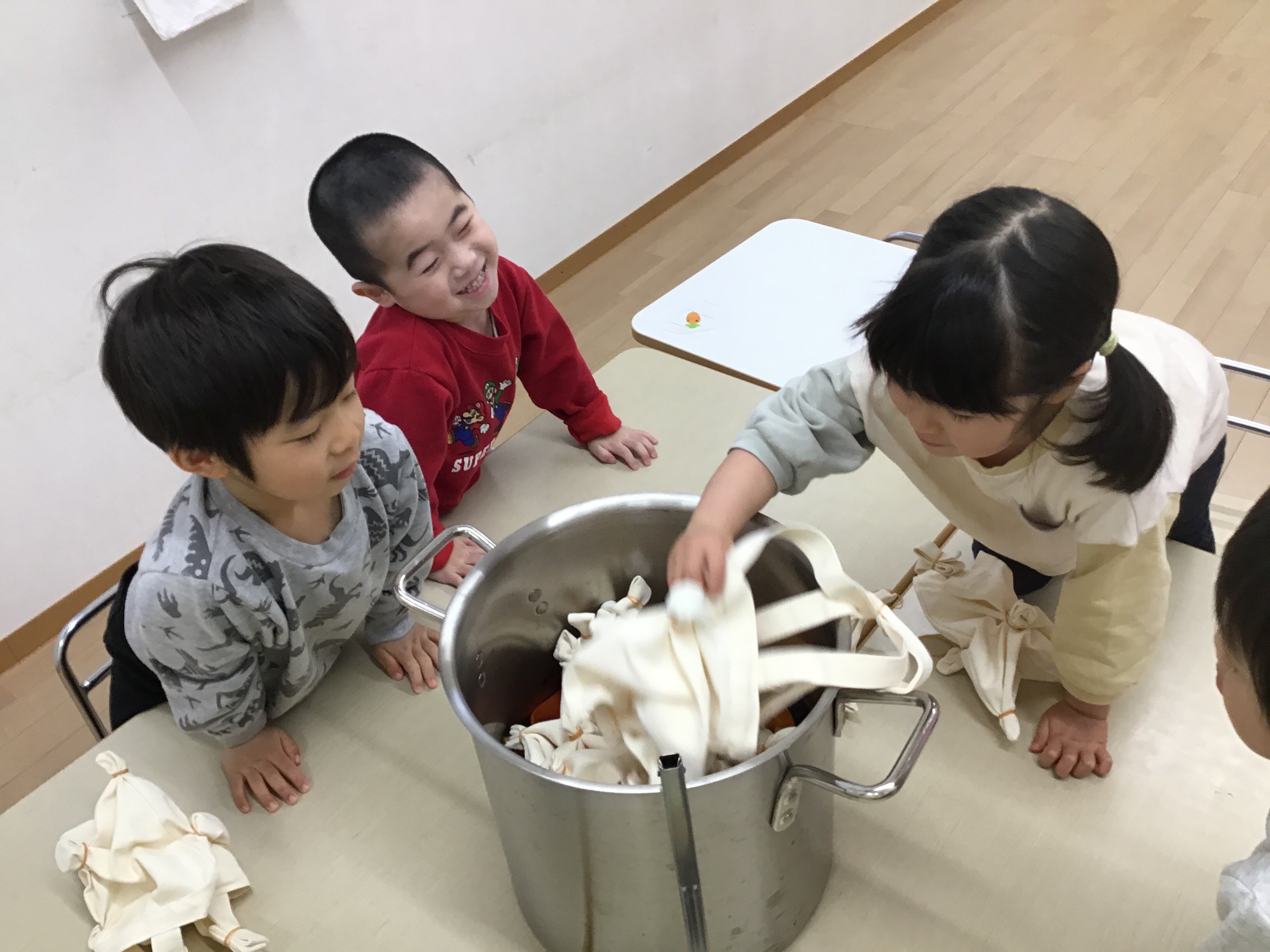 玉ねぎ液に絞ったバックを入れて染めます。完成が楽しみですね。