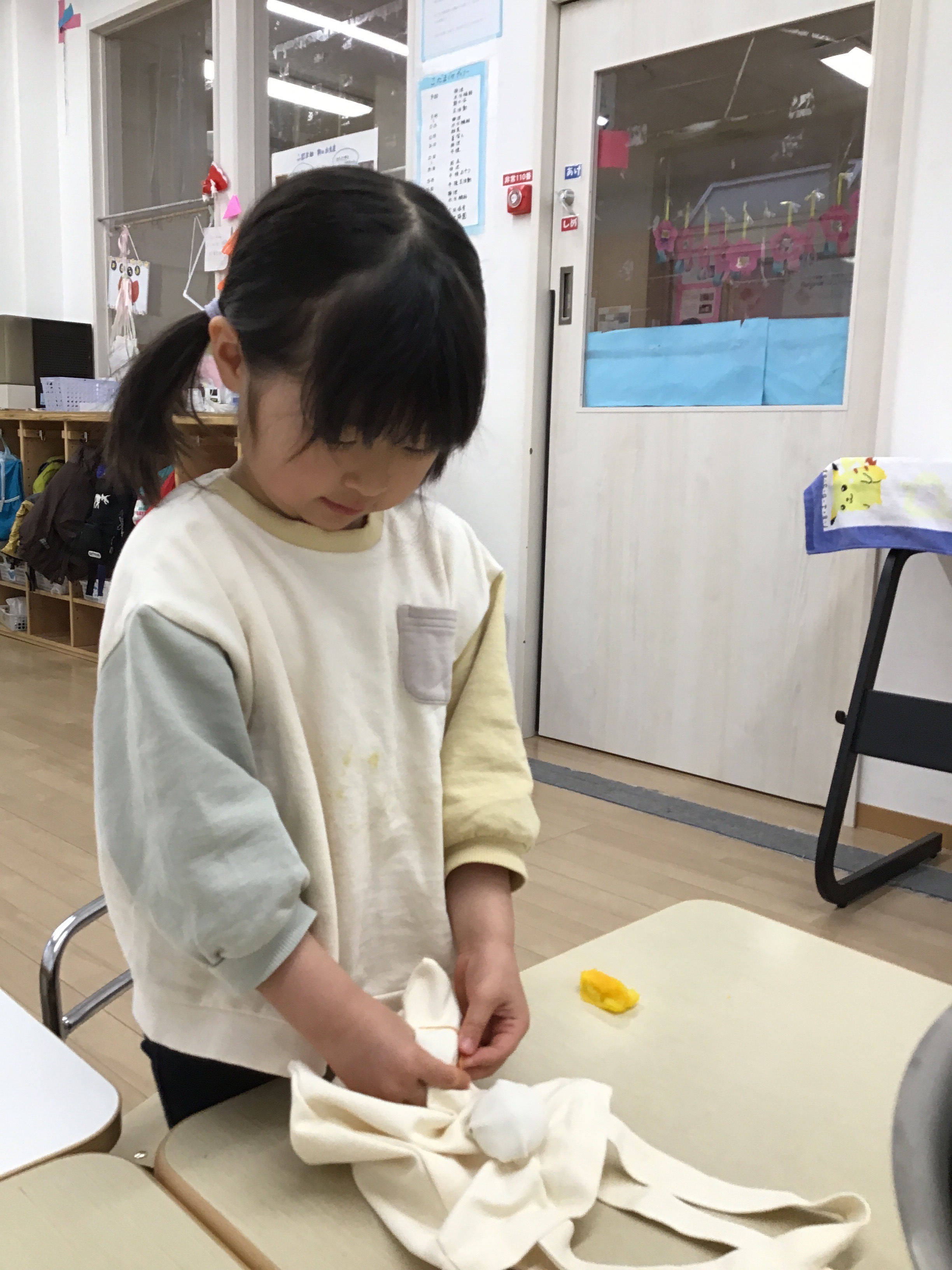 給食で使った野菜の切り落としを布の内側へ入れて縛ります。