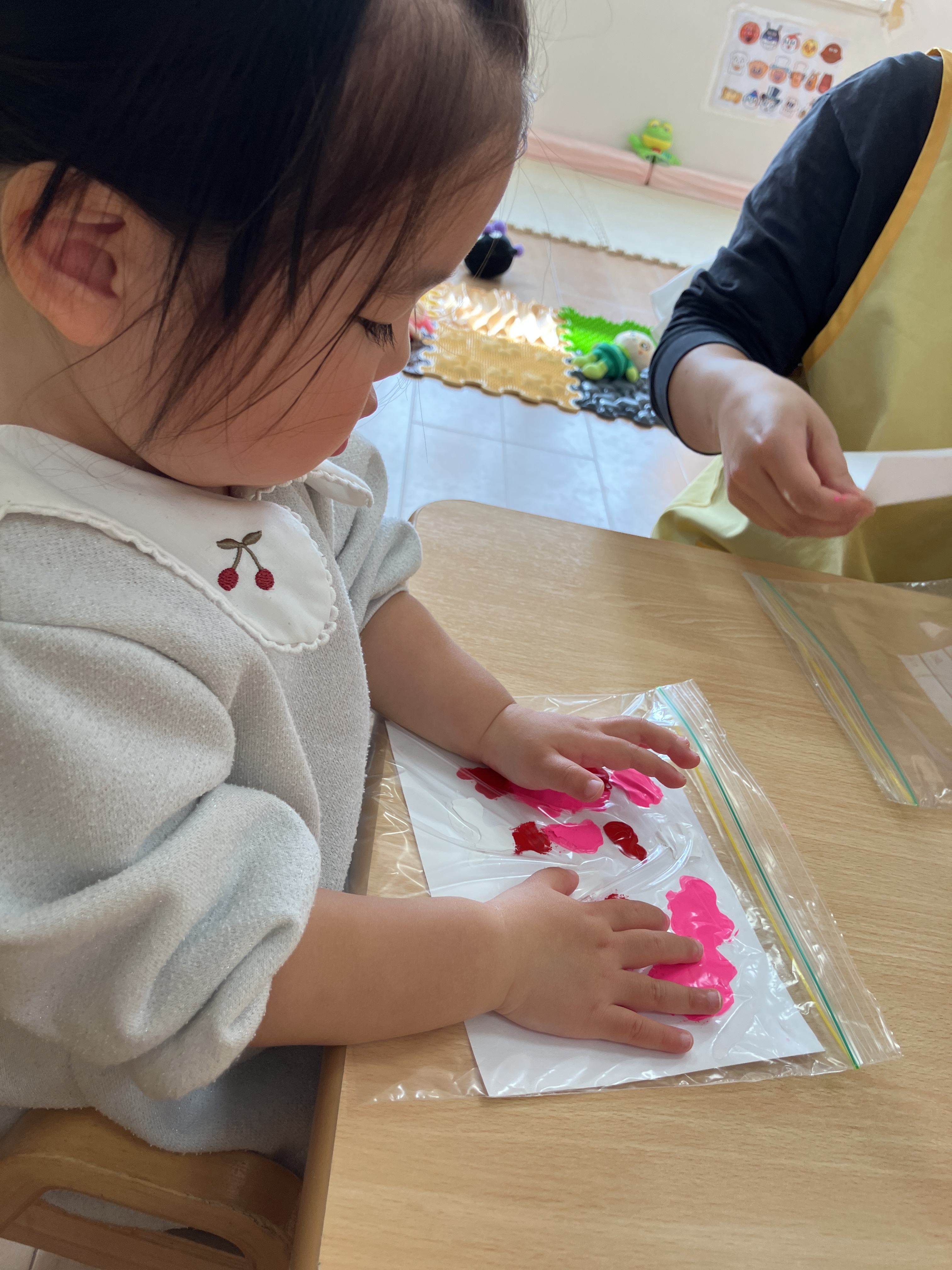 画用紙に絵具をのせてもらい、袋に入れたら...