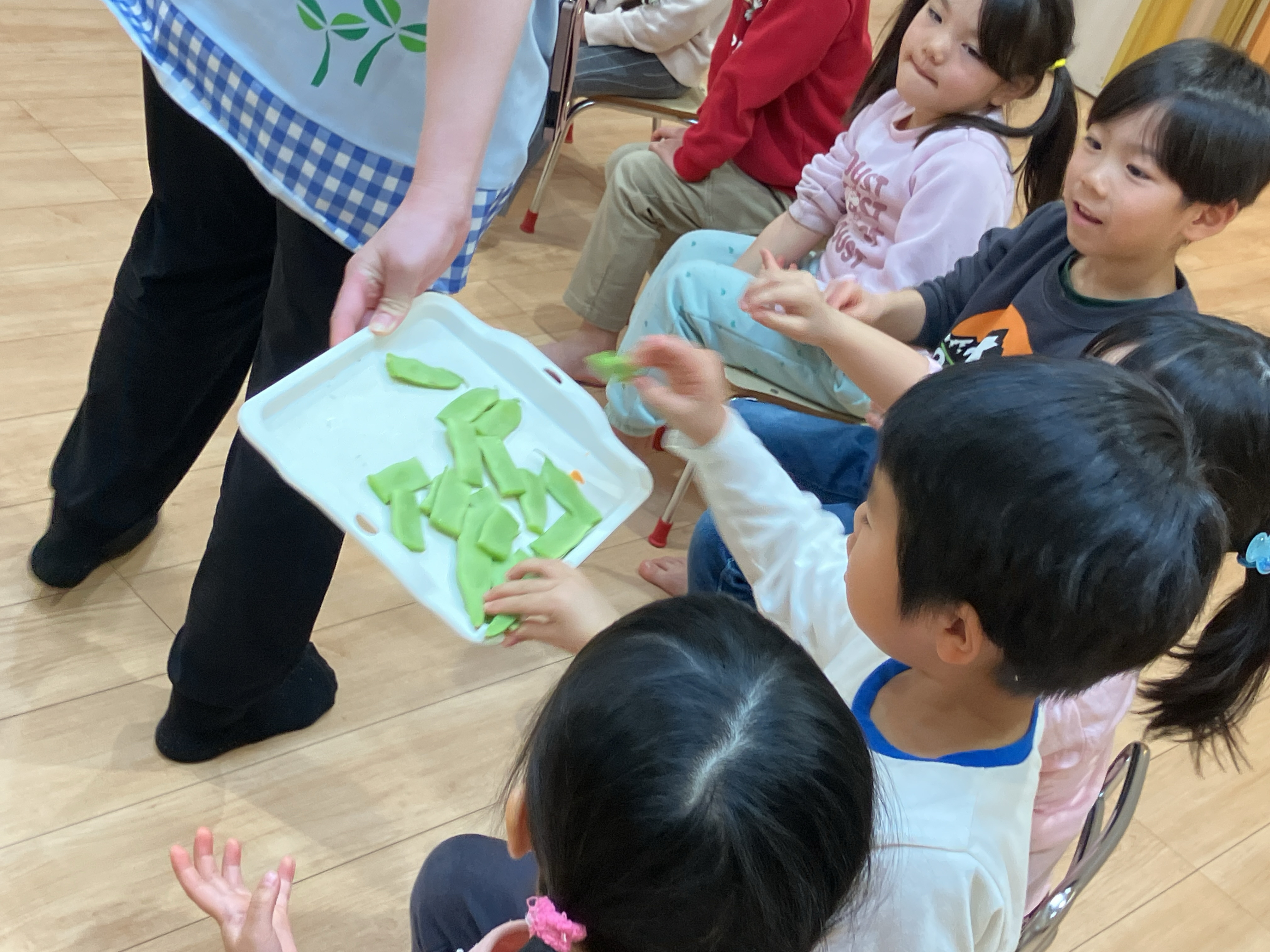 中の豆を取ってみると色々な形があり、近くのお友だちと