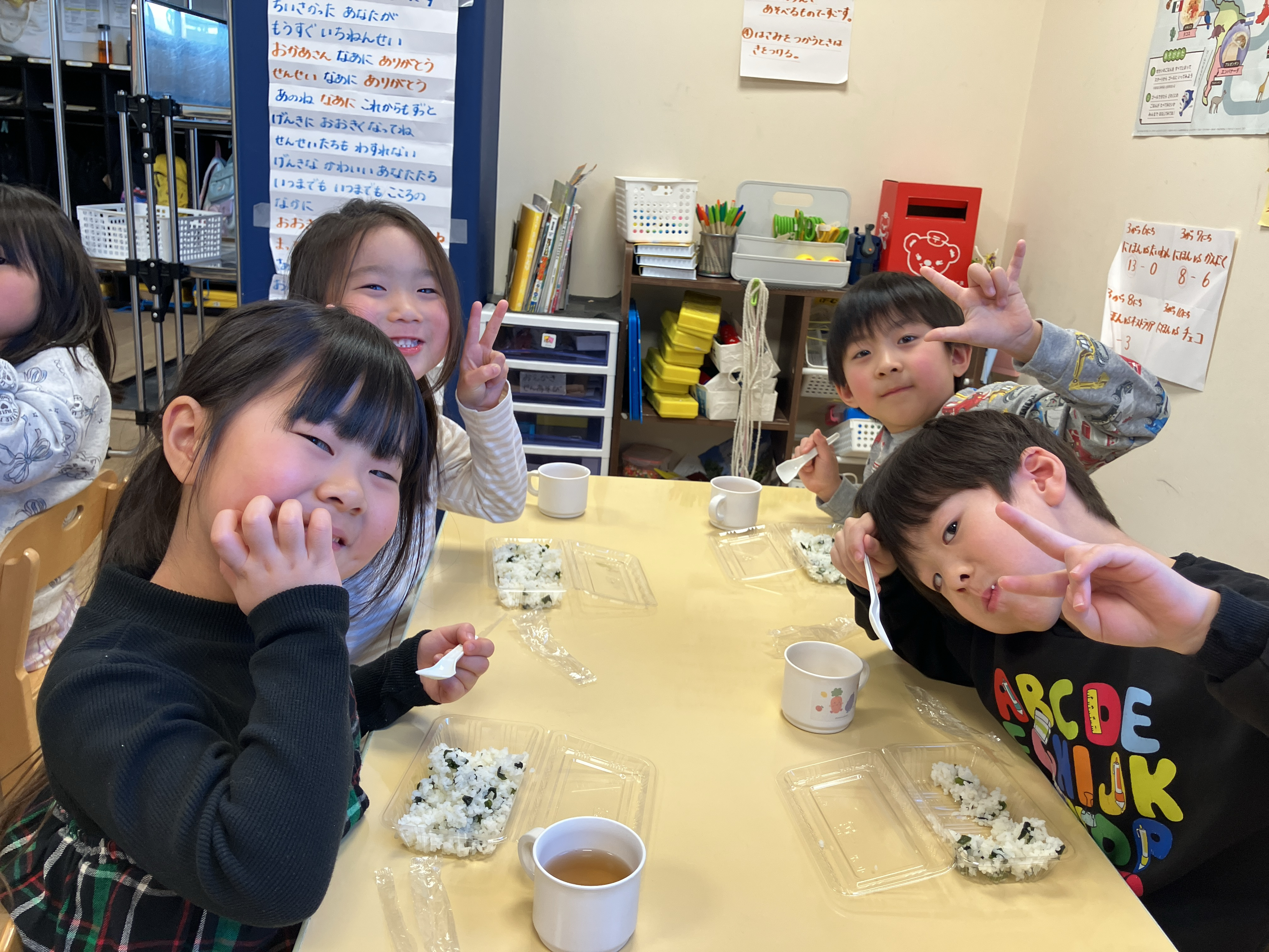 そこで今回は実践的な取り組みとして、給食を作ってくださっているミールケアさんと一緒に炊き出し訓練を実施しました。電気がなくても作れる「お水で戻るお米(アルファ米)」を実際に使い、わかめおにぎりを作っておやつにいただきました。 「お水でお米ができるの?」と不思議そうにしていた子ども達。実際のアルファ米に興味津々でした。