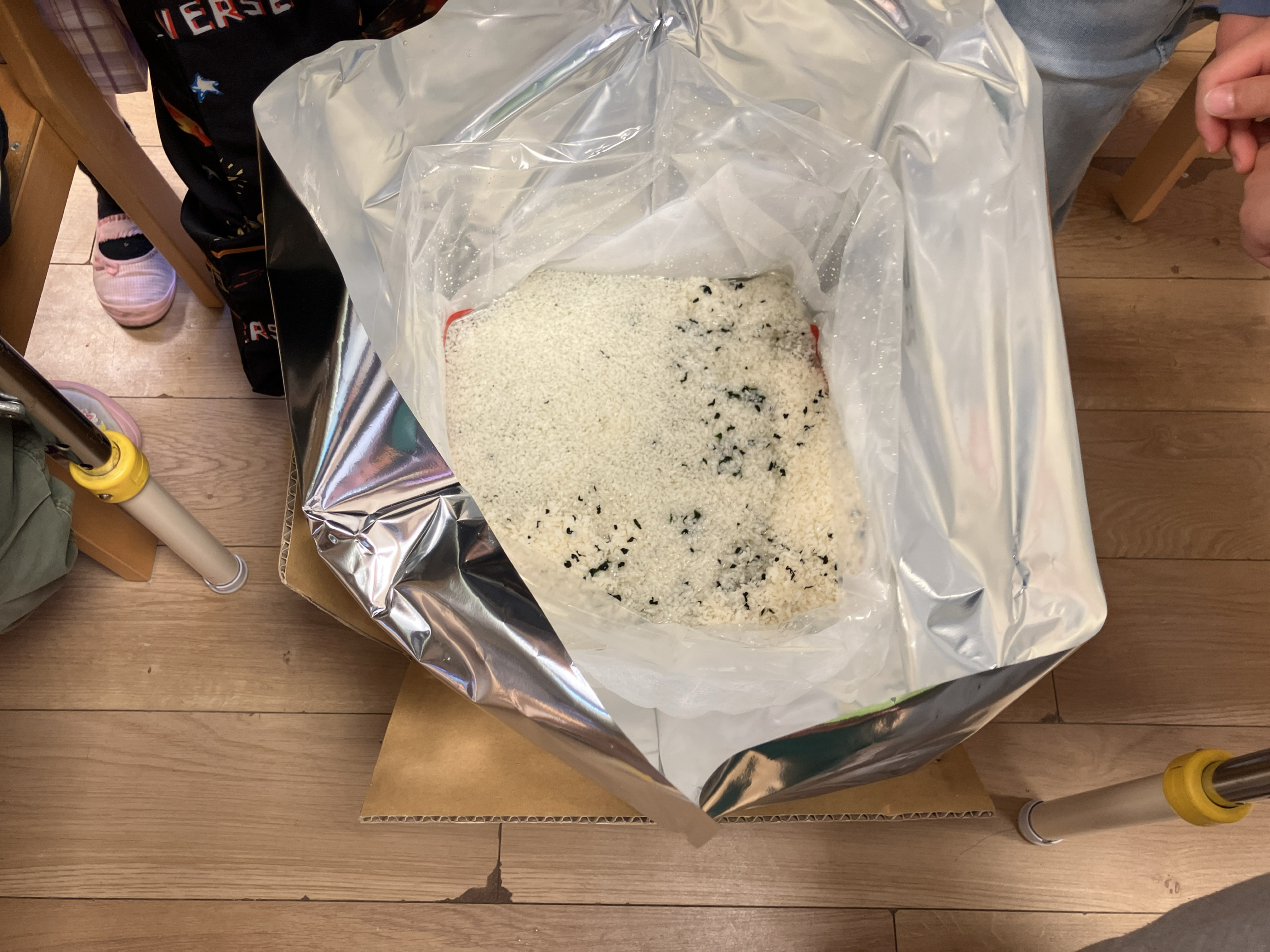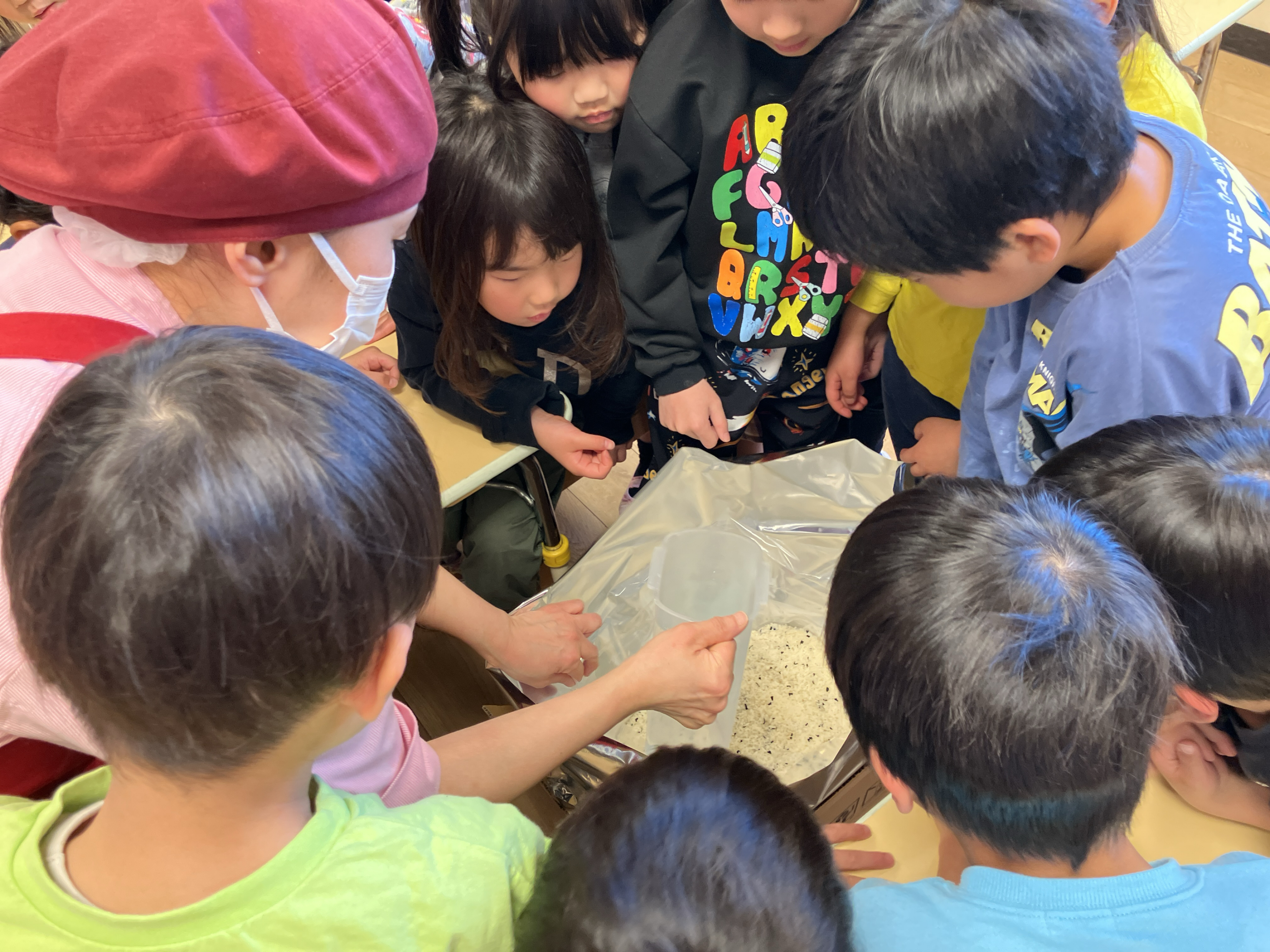 水を入れる前と後のお米の変化に大きな声を上げて驚いていました。